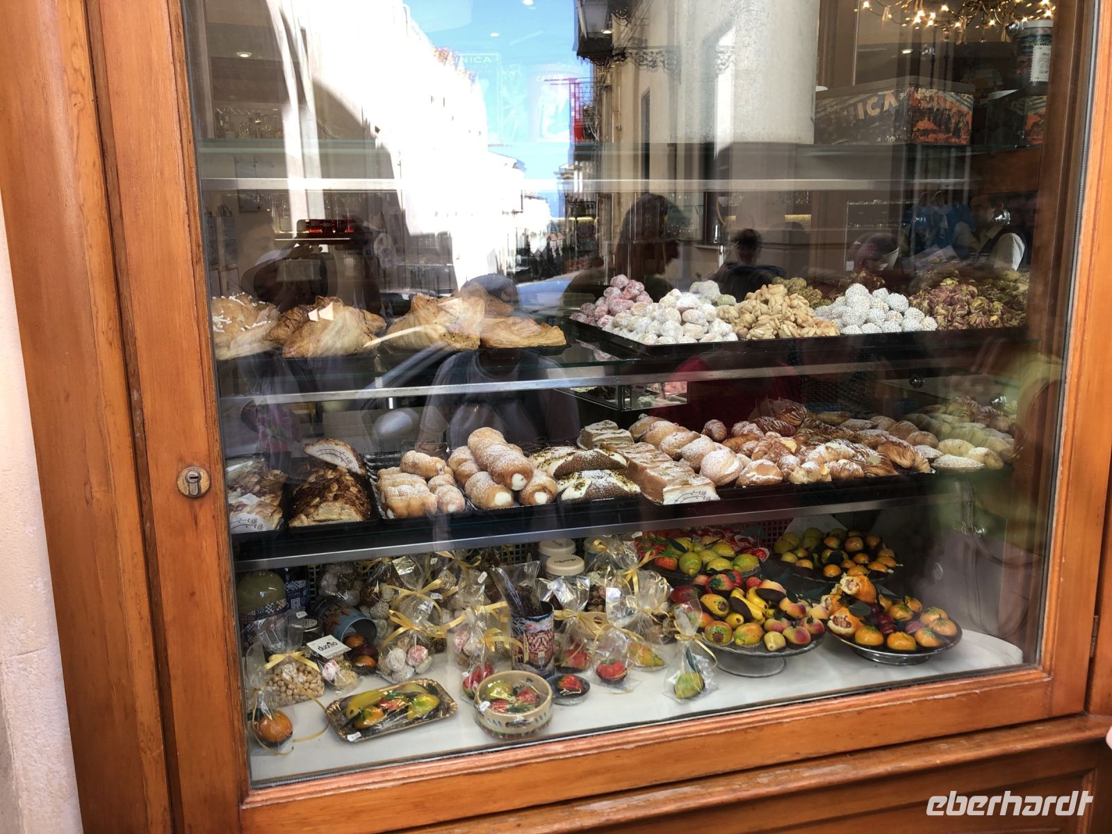 Weiter bummelten wir an den Bäckereien mit ihren kulinarischen Köstlichkeiten vorbei, ließen uns von Silia die Empfehlung geben, unbedingt einmal „Arancinis“ – frittierte Reisbällchen, Mandelgebäck oder einen „Eisburger“ – Eiskugeln in einem Brioche-Brötchen zu probieren.