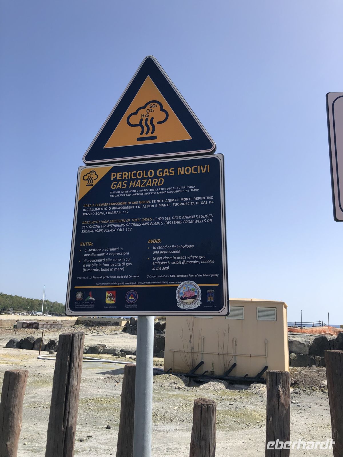 Nach ca. einer Stunde kamen wir am Hafen der Insel Vulcano an, deren Namen auch der Ursprung unseres Wortes Vulkan ist. Auf dieser kleinen Insel – im Liparischen Archipel vor der nordöstlichen sizilianischen Küste soll gemäß der griechischen Mythologie, die Werkstatt des Feuergottes Hephaistos zu finden sein. In der Antike nannte man die Insel auch Hiera, Thermessa, die Heiße oder Theresia, also die heiße Erde. Gern hätten wir nachgeschaut, ob der Feuergott mit den einäugigen Zyklopen die Waffen der Götter schmiedet, jedoch ist der Spaziergang zum Gran Crater auf Vulcano wegen erhöhter vulkanischer Aktivitäten untersagt. Wer weiß, woran der Feuergott gerade schmiedet? Auch die schon seit der Antike genutzten Heilschlamm-Tümpel, die berühmten Schlammbäder für Gelenk-, Haut- und Atemwegsprobleme sind aus diesem Grund leider derzeit geschlossen oder weil lt. einer Anzeigetafel ein Neubau in Planung ist…. Wer den Heilschlamm aber unbedingt einmal probieren wollte, konnte als Souvenir kosmetische und therapeutische Produkte mitnehmen. Auf die berühmten Heildämpfe mußten wir jedoch nicht in Gänze verzichten, denn den penetranten Schwefelgeruch schnupperten wir trotzdem bei einem kleinen Rundgang mit Elisabeth.