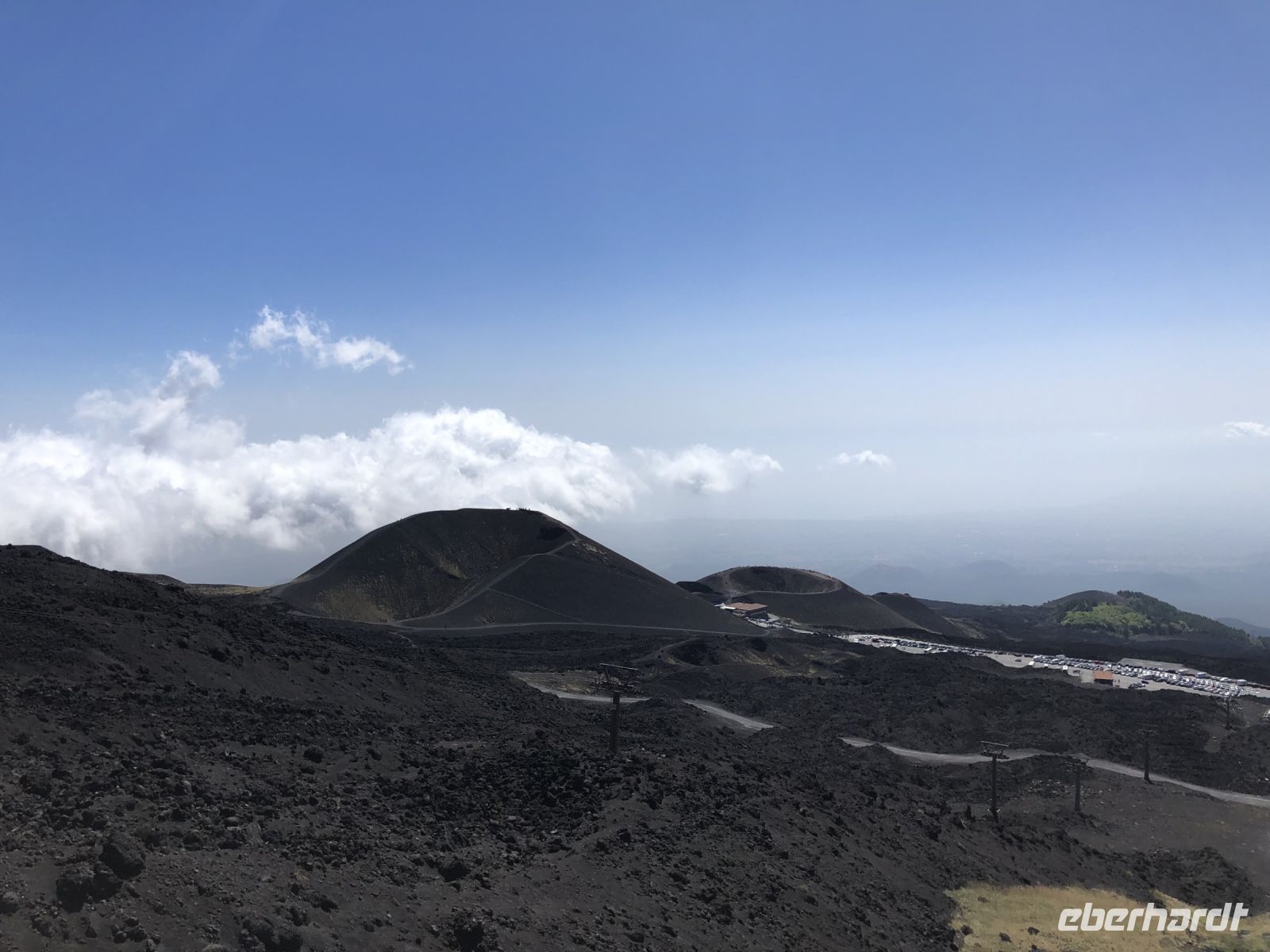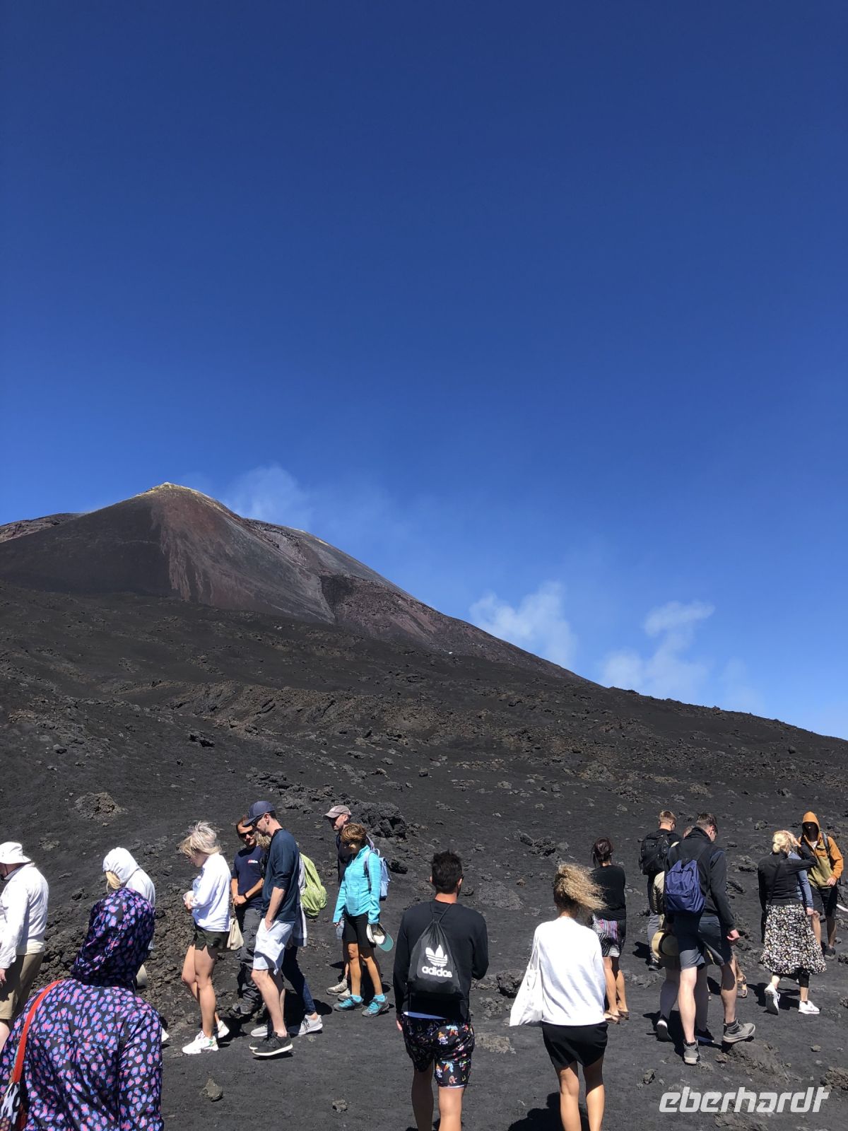 An einer Mautstelle nahmen wir nach einem kleinen kommunikativen Missverständnis noch unsere heutige Reiseleiterin Domenica an Bord. Mit ihr fuhren wir dem Etna, oder Frau Ätna entgegen, denn im italienischen ist der Etna weiblich. Der Ätna wird umgangssprachlich auch Mongibello genannt und ist Europas größter und aktivster Vulkan. Seine Eruptionen der vergangenen Jahre wurden oft von Lavaströmen begleitet, die aber selten eine Gefahr für die naheliegenden Orte darstellten. Diese Kraft der Natur hätten wir gern aus nächster Nähe gesehen. Fast jedes Jahr meldet sich der Ätna oder zumindest aller zwei Jahre verzeichnet man Eruptionen, Gasausbrüche oder Schwefelwolken. Im Jahr 2021 zeigte er sich besonders aktiv, ein Lavastrom zog langsam glühend vorwärts. Unser Abenteuer begann auf 2500 Metern Höhe an der Seilbahnstation, wo wir in kleine kompakte Geländebusse umstiegen, um die große Senke des Valle del Bove zu bewundern. Ein Guide wurde uns zugewiesen, den wir nur schwer zwischen den vielen Menschen ausmachen konnten. Sich gegen den Wind stemmend, folgten wir der Gruppe, standen vor diesem erkalteten Lavastrom, blickten auf den alten, riesigen Montagnola-Krater, schmeckten das Vulkangestein förmlich und spürten wie kleine Steinchen auf unsere Haut niederprasseln. Ein Erlebnis für alle Sinne. Hier oben begriffen wir die Ausmaße des Vulkans, denn es scheinen hunderte Krater und Lavaströme zu sein. Und tatsächlich erklärte der lokale Führer, dass der Ätna zwar 4 Hauptkrater hat, jedoch auch fast 300 seitliche Krater. Jeder Hügel, den wir im riesigen Ätna-Gebiet sahen, ist ein erloschener seitlicher Krater. Diese seitlichen Ausbrüche sind sogenannte monogenetische Ausbrüche, d.h. Öffnungen die nur einmal aktiv sind und danach so fest verschlossen sind, dass sie nie wieder ausbrechen. Die Hauptkrater sind hingegen ständig „offen“, da sie mit der Magmakammer verbunden sind. Ganz bis zum höchsten Punkt schafften wir es nicht, dafür war die Zeit zu kurz und der Wind zu stark. Vier Mutige aus der Gruppe bestiegen noch einen weiteren steilen Kraterhügel. Der Großteil der Gruppe fuhr mit der Seilbahn schon Richtung Restaurant und genoss einen Espresso und Arancinis.