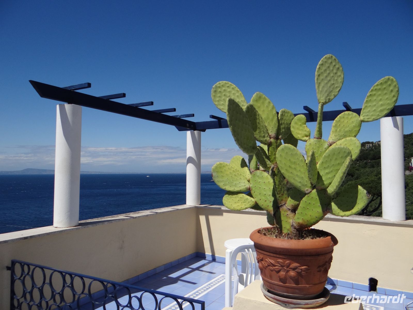 Nach rund 90 Minuten Fahrt mit einem sehr rücksichtsvollen Fahrer stehen wir vor dem Hotel Piccolo Paradiso. Das kleine Paradies im großen Paradies… Koffer ausgepackt, dann geht es runter zum Hafen und in das nächste Café, wo wir Bier, Café, Cappuccino und Eis bestellen. Rote Geranien vor blauem Wasser, dahinter Neapel und hier wir. Nach der Stärkung geht es entlang der Promenade. Das Meer sieht einladend aus und scheint auch nicht so kalt zu sein, was die Handmessung ergibt.