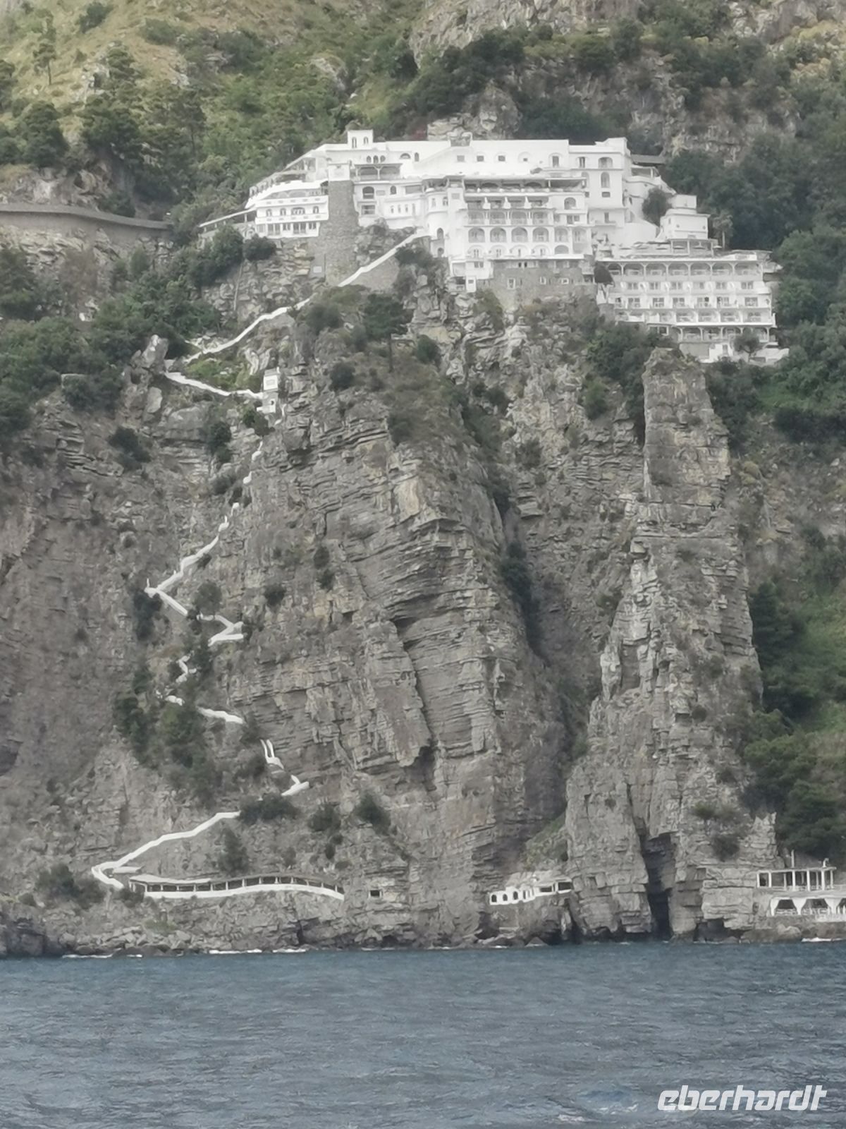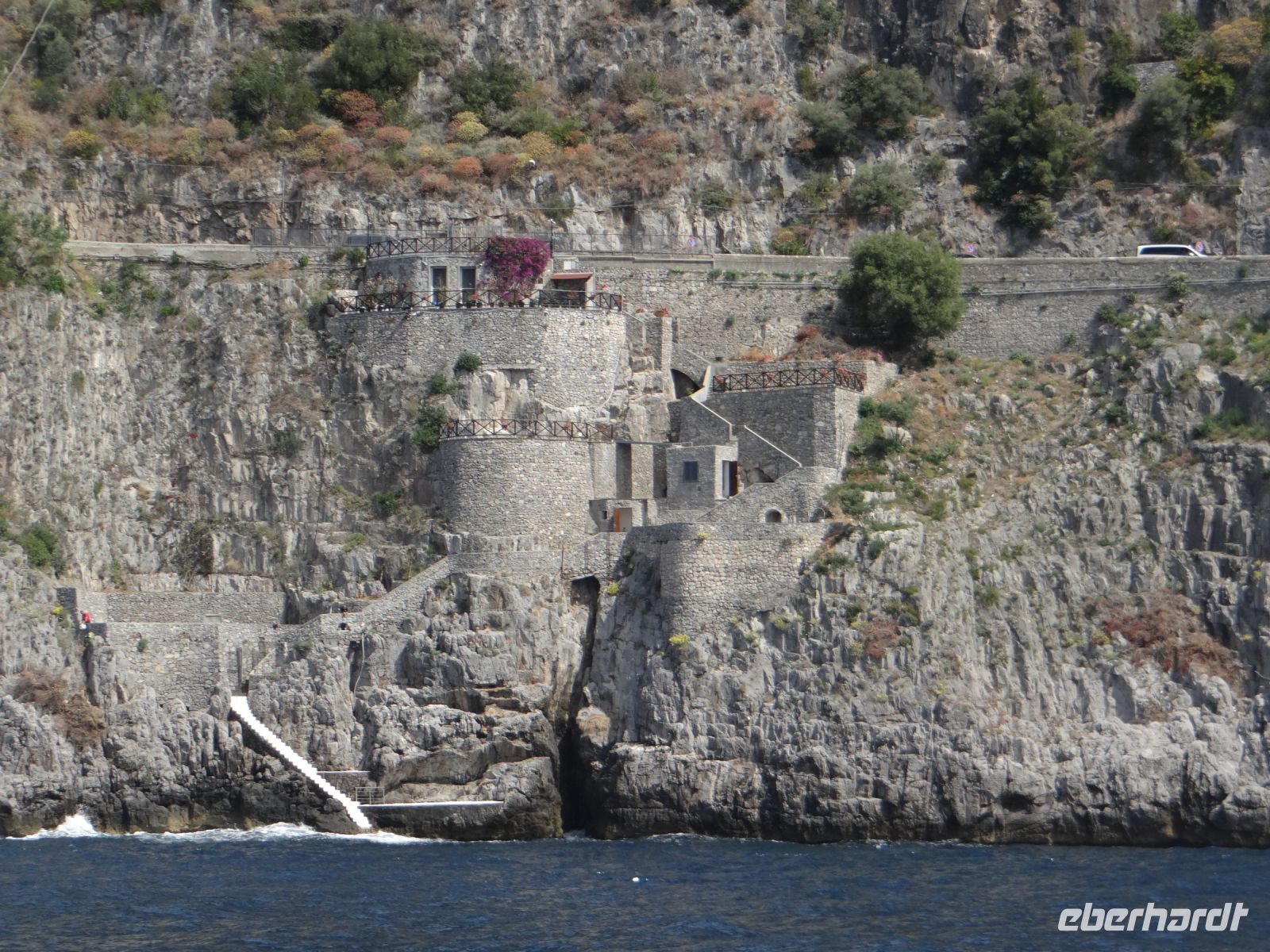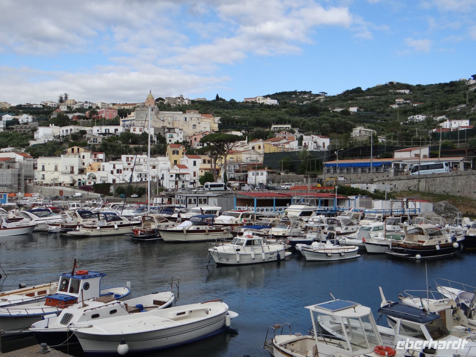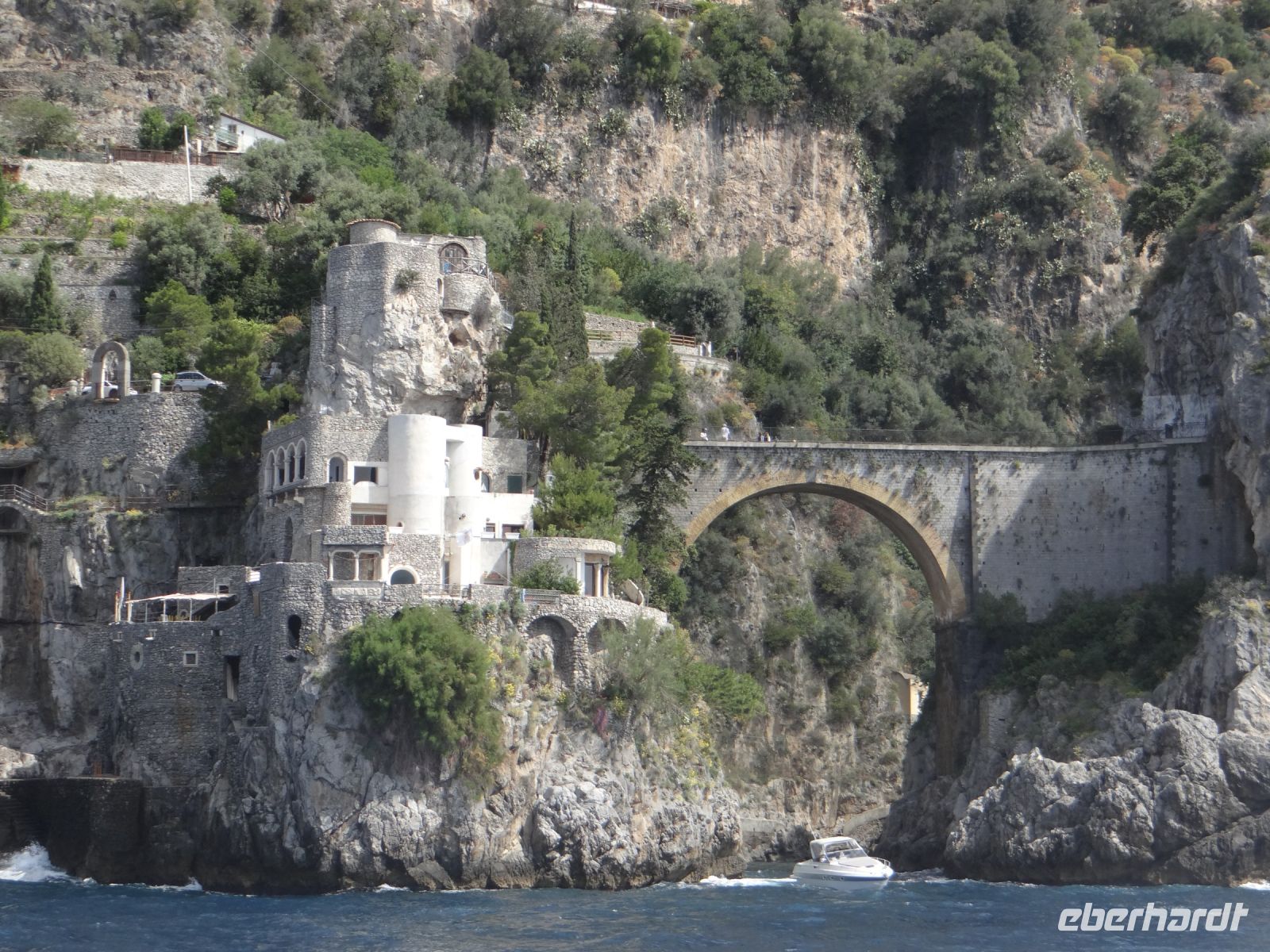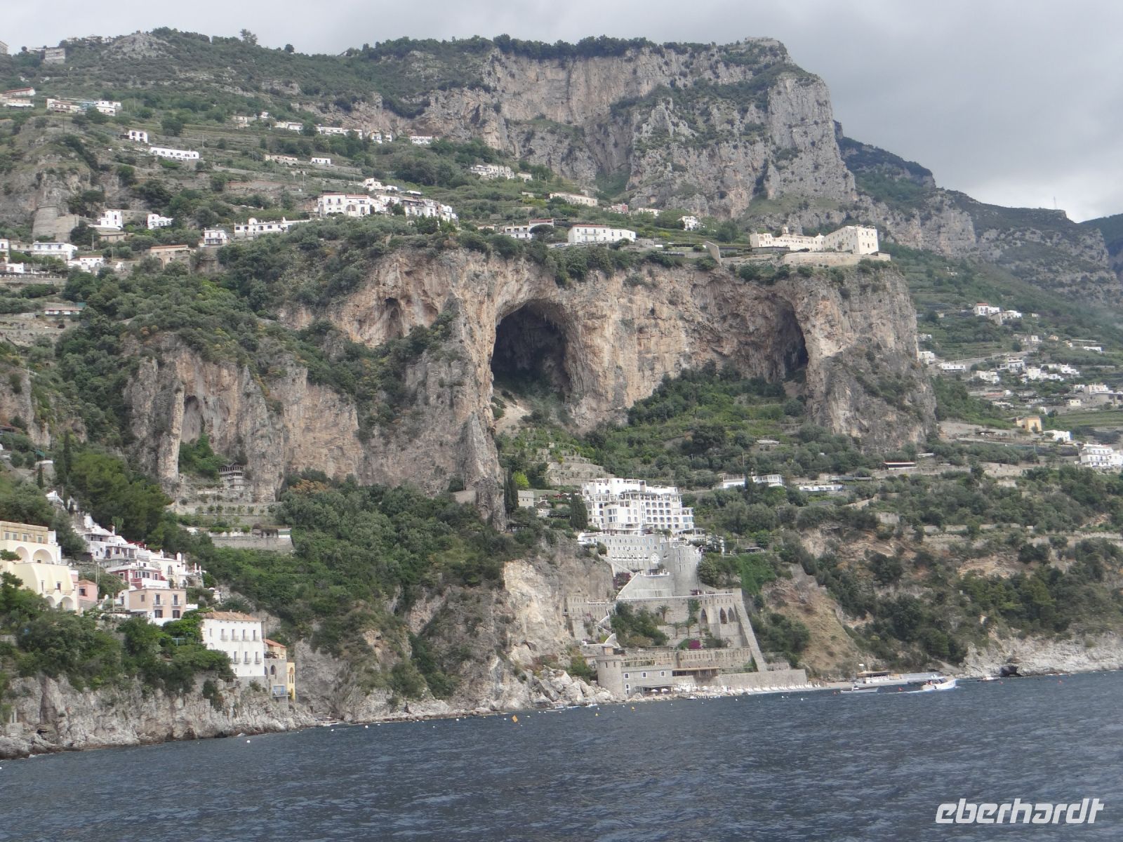 Entlang der Costiera Amalfitana zieht das Schiff. Seit 1997 gehört sie zum UNESCO-Weltkulturerbe und erstreckt sich auf einer Länge von ca. 40 Kilometer zwischen Positano und Vietri sul Mare. Es ist viel schöner, sich die Küste vom Wasser aus anzusehen, denn hinter jeder Kurve warten neue Orte, Villen, Terrassen und ungezähmtes Gelände auf uns, was man von der Straße nicht sieht.