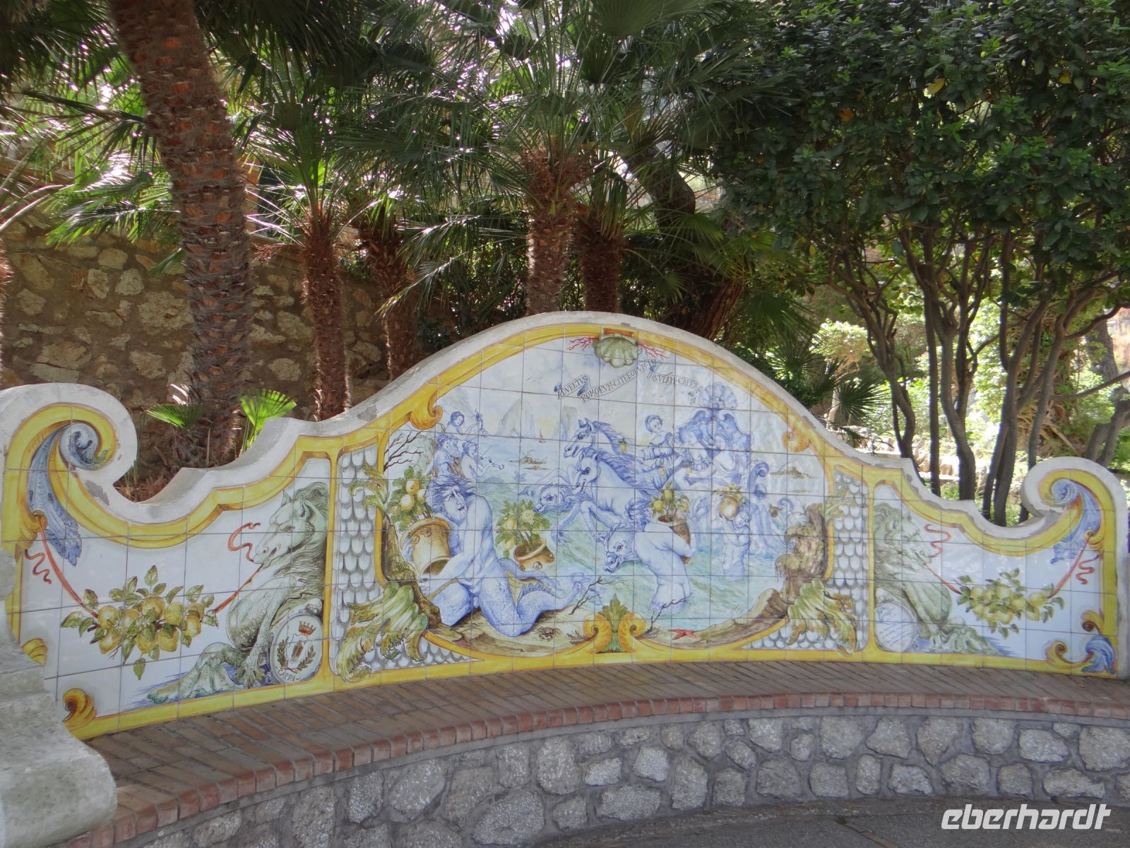 Ein Minibus wartet auf uns, er sieht ein bisschen aus wie eingelaufen. Doch das Matchboxauto passt perfekt durch die schmalen Straßen. Hin und wieder kommt ein anderer kleiner Bus entgegen, am besten an noch engeren Stellen oder in Kurven. Da der Italiener nur die Richtung nach vorne kennt, zurückfahren käme einer Niederlage gleich, schieben sich beide Wagen zentimeterweise nach vorne, während die Insassen den Atem anhalten. Wer dann noch Atem habt, lässt die letzte Luft weichen auf der Straße nach Anacapri, die auch „Mamma Mia“ heißt. Ein herausragendes Straßenkunstwerk, erst xy gebaut. Bis dahin nutzte man die Phönizische Treppe über 800 Stufen – für Lebensmittel, die Post, alles, was man vom Hafen in den Ort transportieren musste.