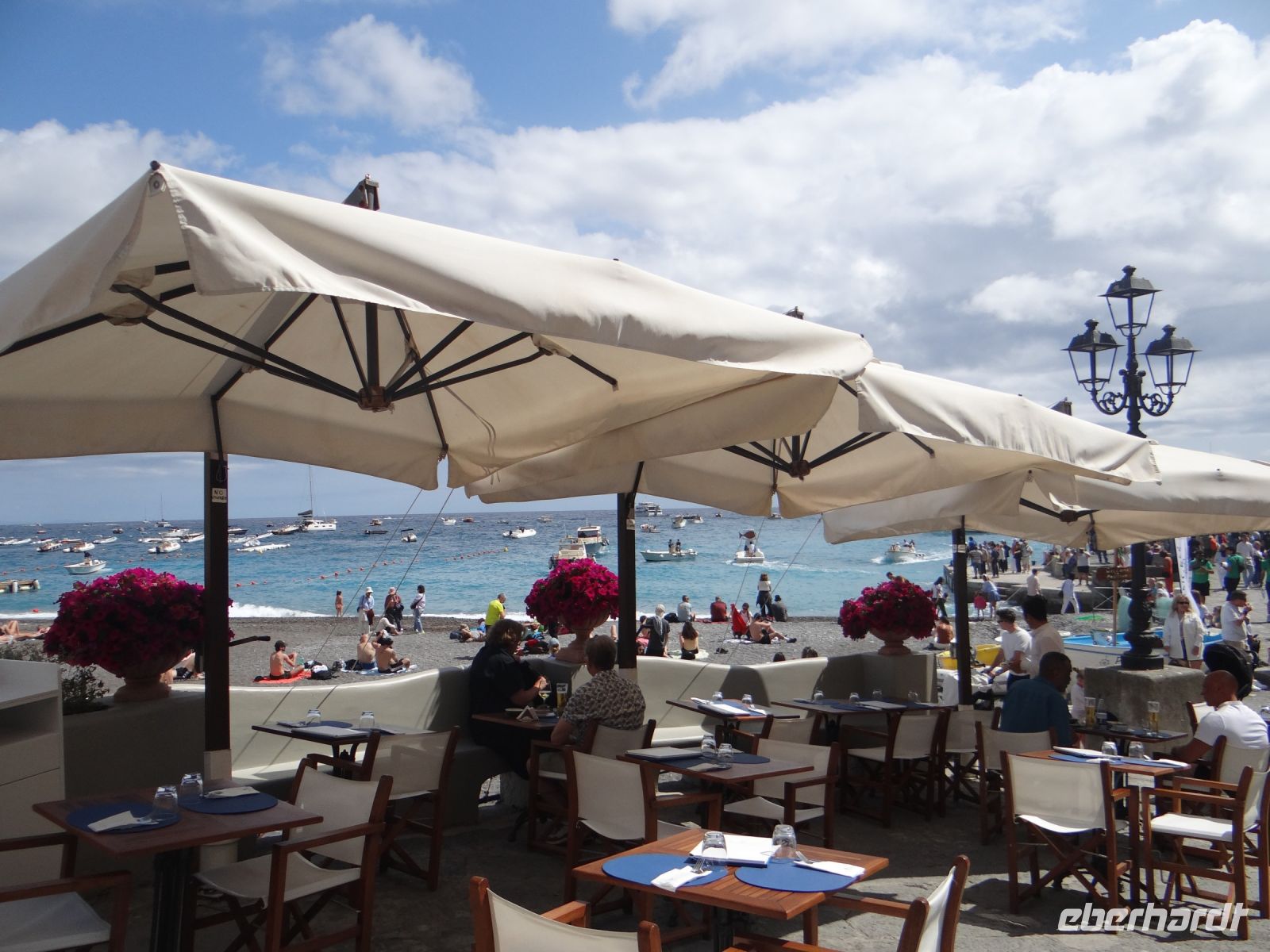 Den Wettkampf haben wir gesehen, nun geht es weiter mit unserem Programm. Der Wellengang ist nicht ohne, die Schiffe bewegen sich heftig und erschweren das An-Bord-Gehen. In Positano ist gar nicht so sicher, ob wir landen können. Unser junger Kapitän ist behutsam, bringt das Schiff vor Anker und uns an Land.