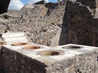Wie z.B. im Freudenhaus mit seinen anregenden Wandmalereien, das wir besuchen. Die Betten aus Stein liegen nun blank, früher werden sie sicher gepolstert gewesen sein.