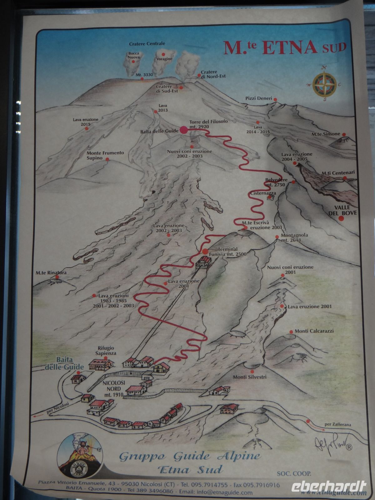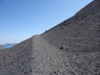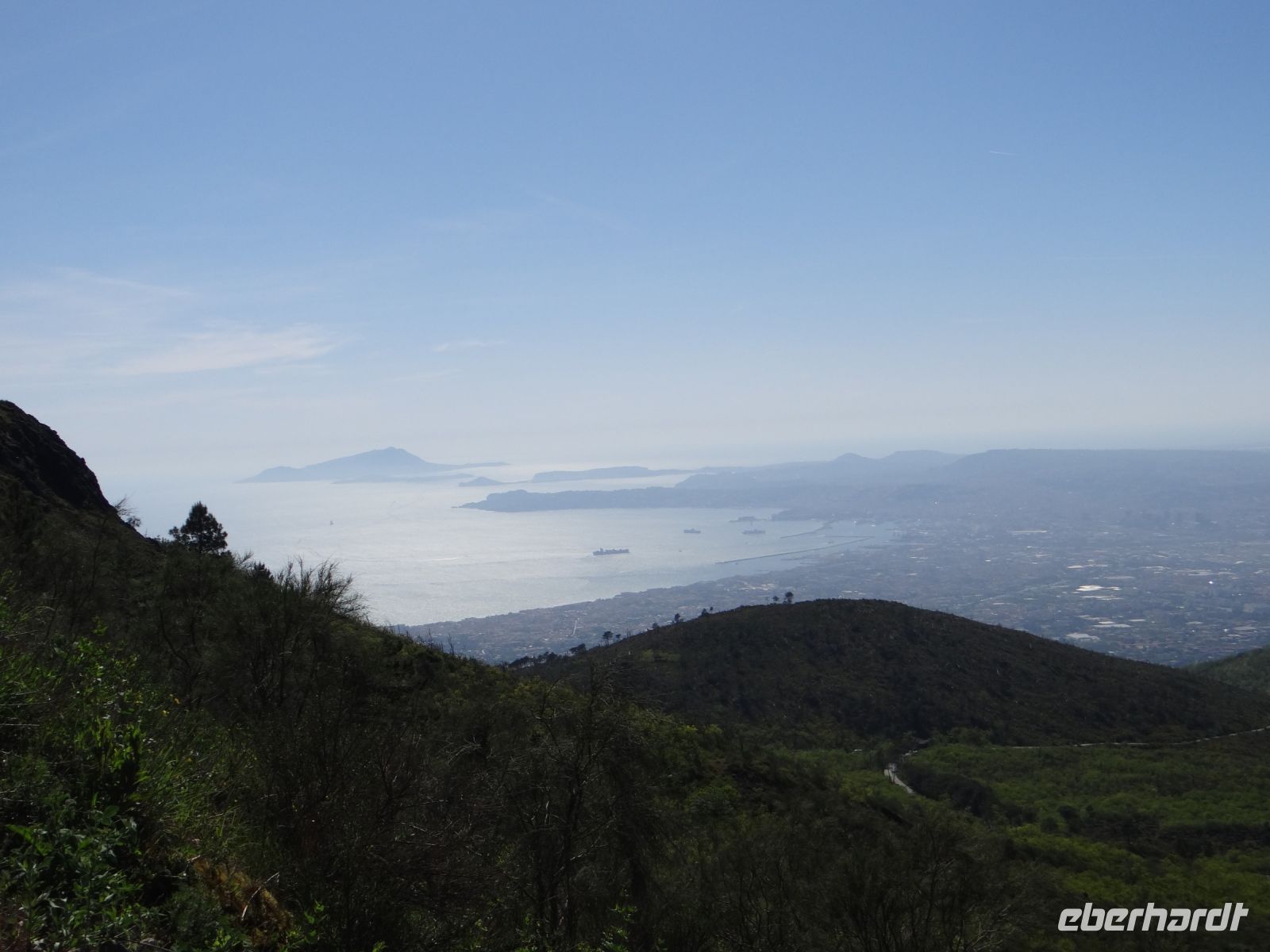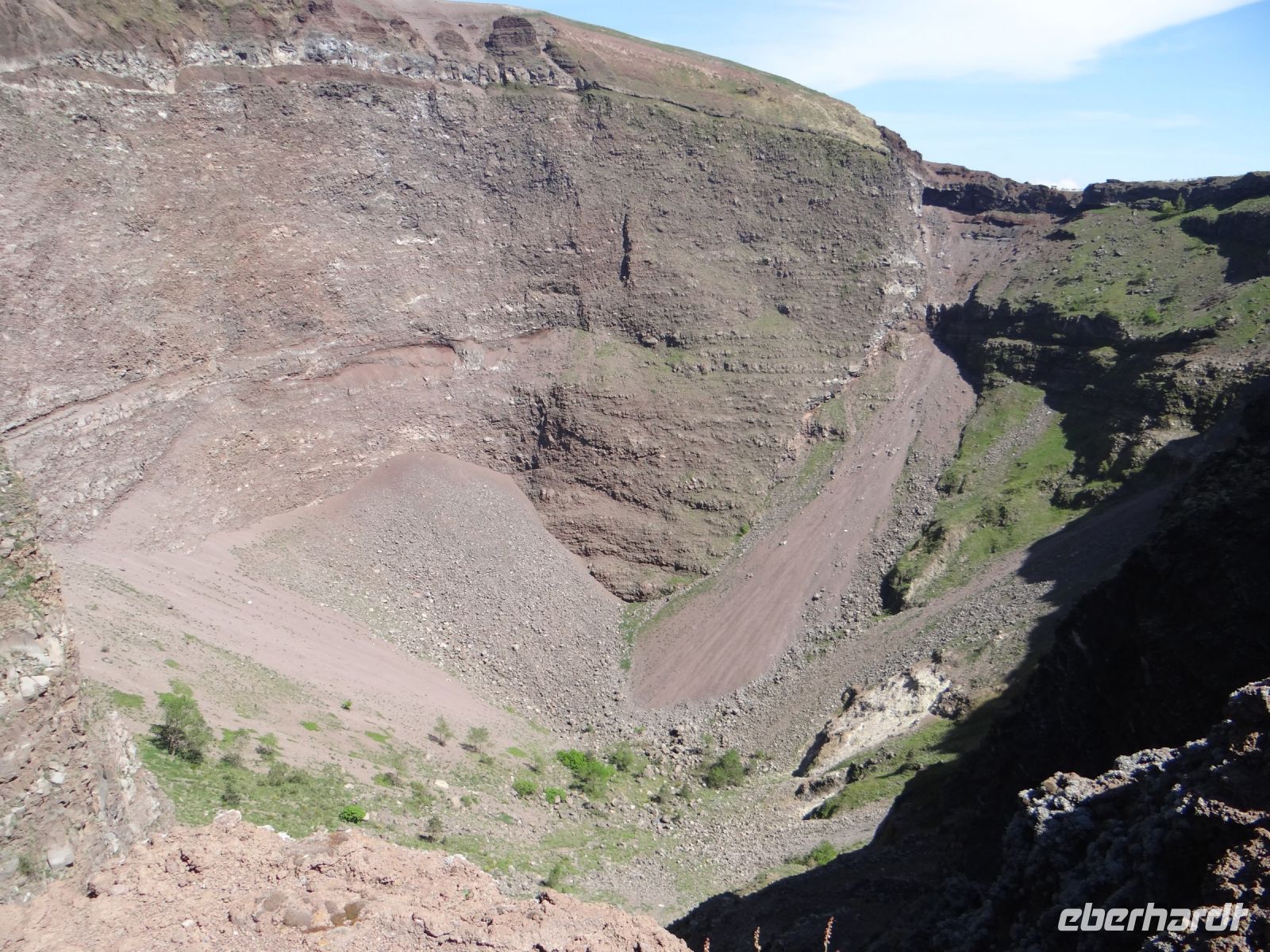 Der stetig nach oben führende Weg beginnt an der Südostflanke und läuft in Serpentinen nach oben. Am Kraterrand schaut man in die Tiefe, jedoch nicht bis auf den Grund. Auf der anderen Seite, im Osten, liegt Pompeji, ein klein wirkender brauner Bereich in der Ferne. Was mag noch alles unter der Erde liegen?