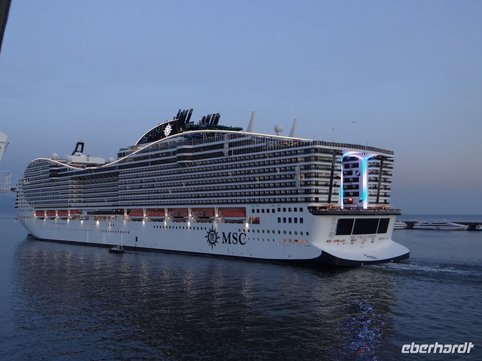 Ein riesengroßes Kreuzfahrtschiff liegt am Pier, mehr als elf Stockwerke hoch und über 300 m lang. Doch auch wir fahren auf der Rolltreppe in unserer Fähre hoch zur Rezeption, bekommen geschwind unsere Zimmerkarten und können uns im Abendsonnenschein an Deck setzen mit Blick auf Neapel und das Riesenschiff, das kurze Zeit später wie auf einem Teppich gezogen ganz sanft aus dem Hafen gleitet.