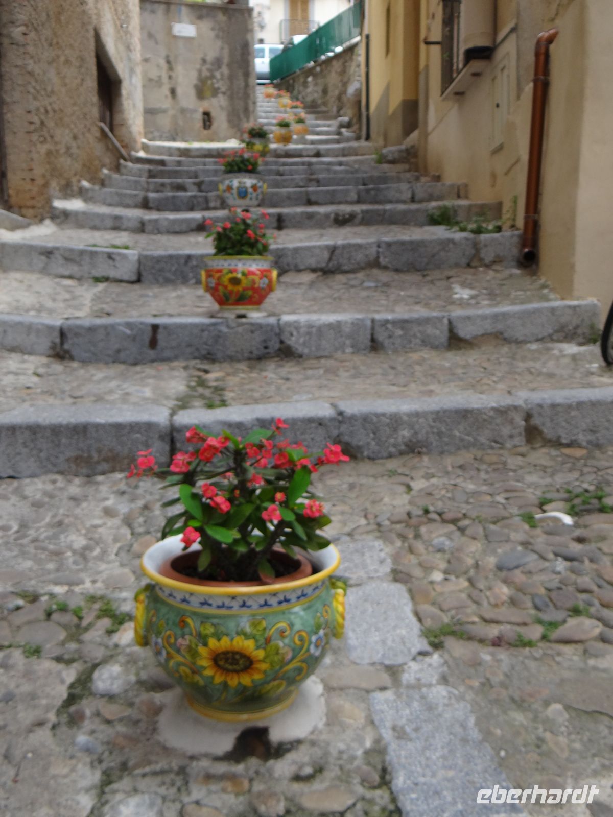 Bei der Anfahrt haben wir es sehen können: Der Rocca, der Fels, trägt eine Befestigungsmauer, wie eine Krone rundherum. Da stellt man sich die Frage, wie soll man überhaupt über unzugängliche Felswände über eine Mauer einfallen können? Und wie hält das Ganze dort droben fest? Ein meisterliches Bauwerk der Normannen.