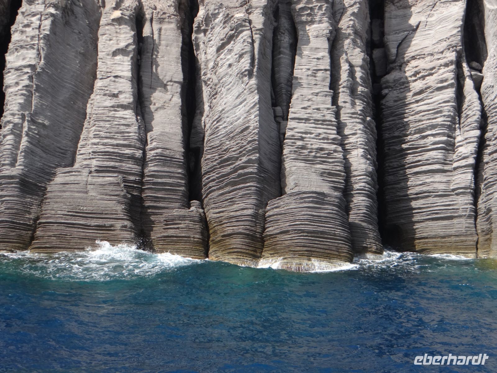 Doch wo ist sie? Heute geschlossen, da das Meer bewegt ist und keinen Zugang erlaubt. Ein kleines Loch im Felsen, durch das man sich im Ruderboot durchhangeln muss. Wo sonst unzählige Schiffe auf eine Umstiegsmöglichkeit warten, ist heute nichts los. Und angesichts dieser Situation ist man erstaunt, dass diese Grotte überhaupt entdeckt werden konnte. Übrigens war sie schon in der Antike bekannt. Denn dort gefundene Statuen zeugen davon, dass die Grotte als Nymphäum genutzt worden ist.