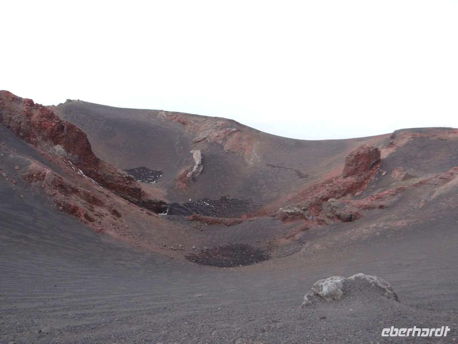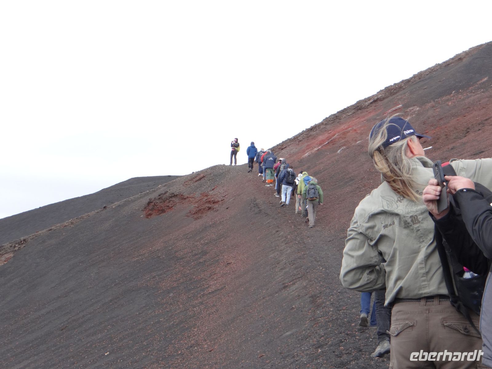 Ein qualifizierter Bergführer begleitet uns auf der Runde an der Flanke des Vulkans entlang. Plötzlich peitscht ein Wind, lässt die leichteren Lavasteinchen gegen unsere Beine schlagen, was spürbar ist. Wir stemmen uns dagegen. Mund zu, denn es knirscht schon ein wenig. Im kleinen Vulkankessel ist es nicht ruhiger, der Wind verfolgt uns. Jene, die Stöcke haben, halten sich daran fest. Es sind Naturgewalten, sowohl der Vulkan wie auch der Wind, die nicht alltäglich sind und uns unsere Verletzlichkeit vor Augen führen.