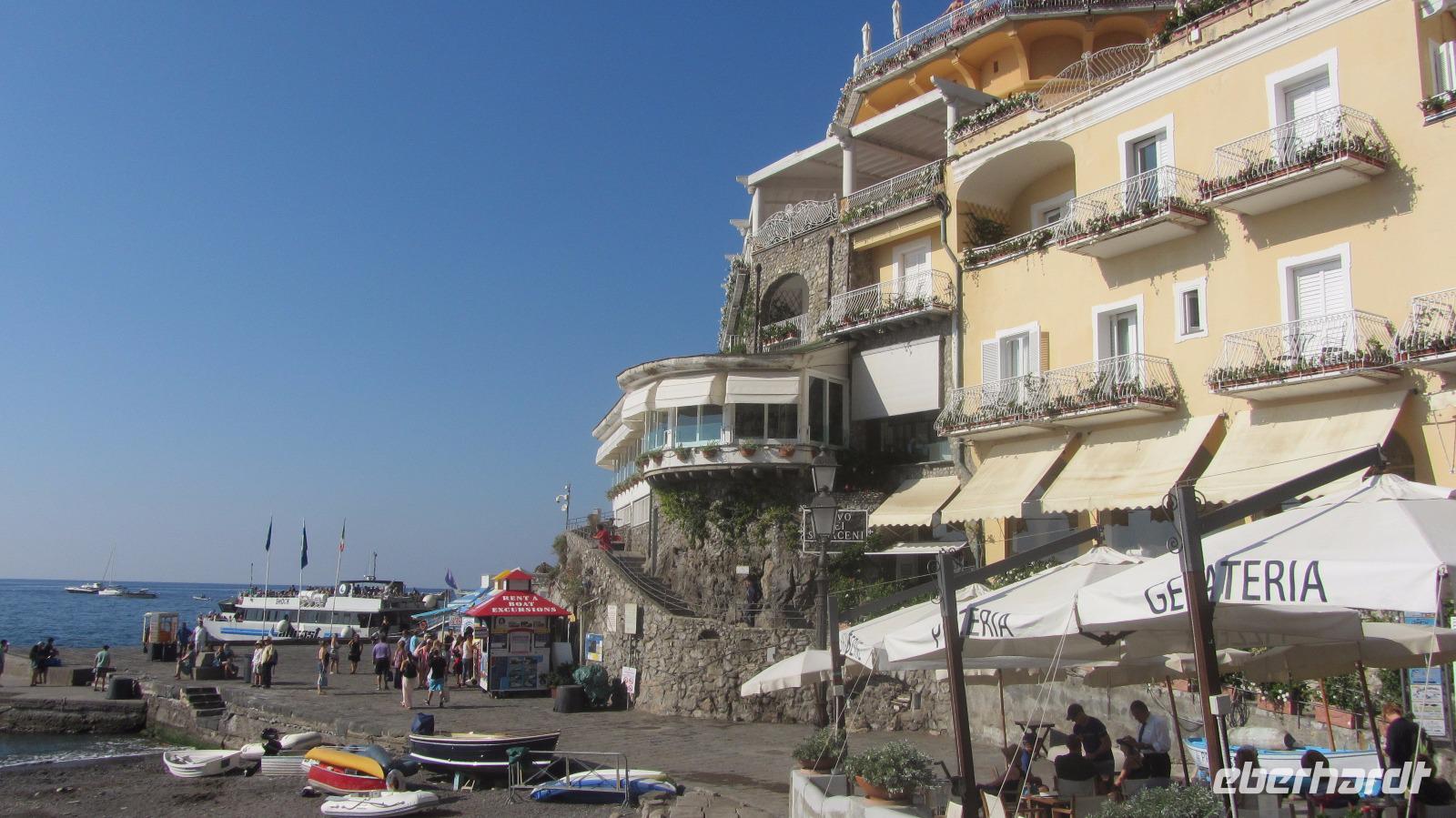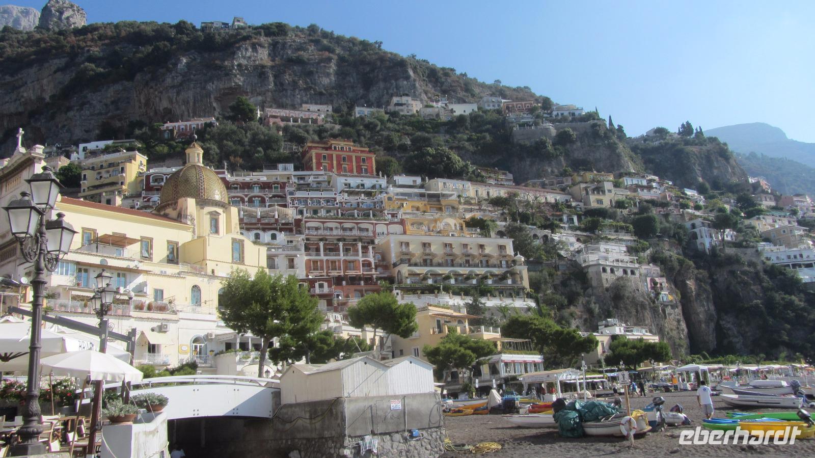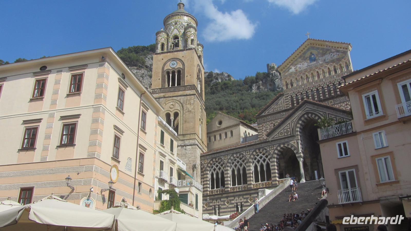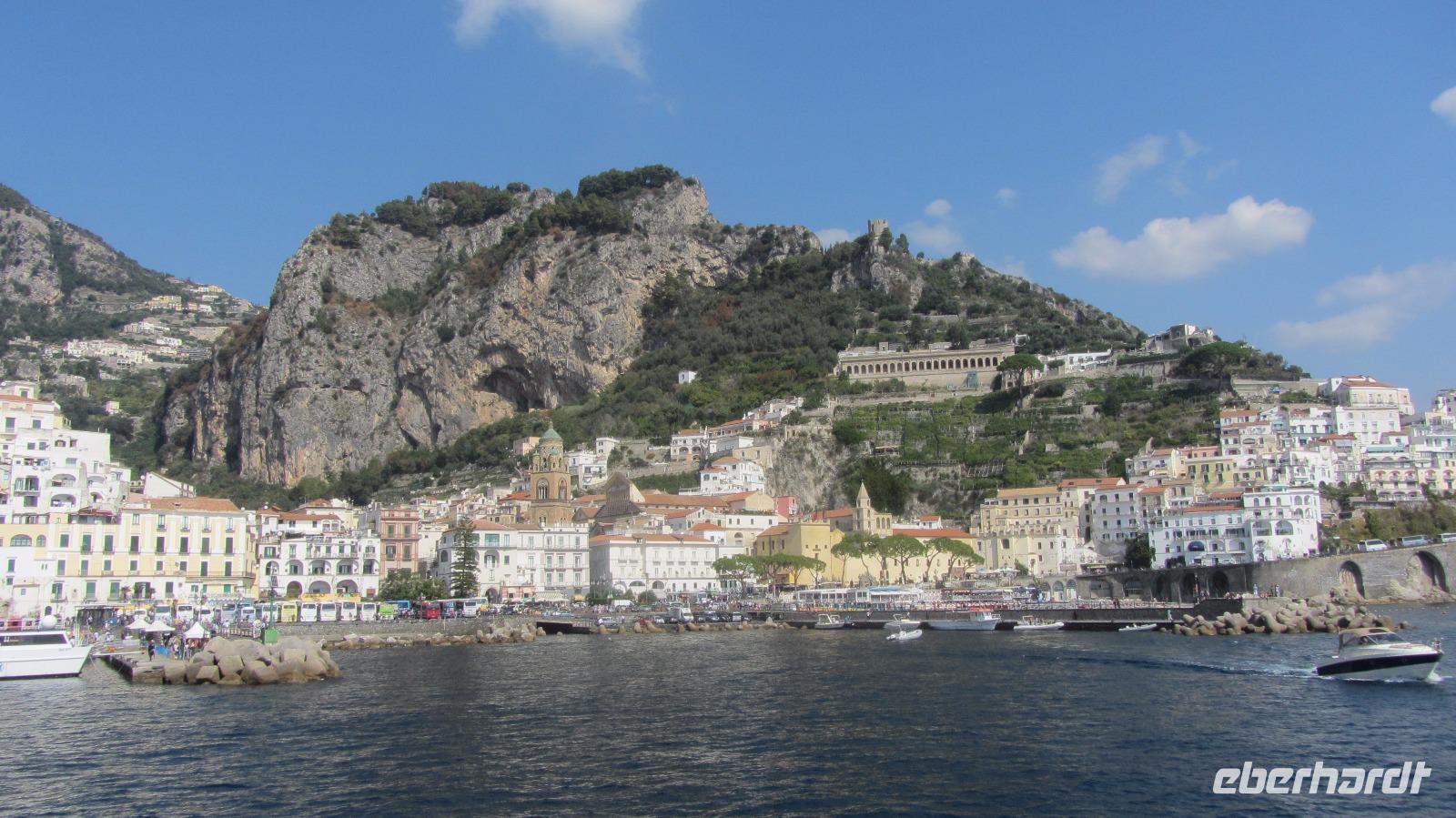 Heute steht gleich zum Auftakt unserer Reise die berühmte Amalfiküste auf dem Programm. Wir fahren mit unserem Reiseleiter Mathias und unserem versierten Busfahrer Antonio nach Positano. Unterwegs können wir die ersten fantastischen Aussichten bewundern. In Positano bummeln wir gemeinsam mit Mathias durch die Altstadt und bummeln durch die kleinen Gassen. Mathias zeigt uns die Besonderheiten der Stadt, aber auch die Cafés, wo sich später ein Cappuccino lohnt. Anschließend haben wir Zeit für einen Bummel oder einen Café, wie in Italien der Espresso bezeichnet wird. Mit dem Boot geht es nun weiter nach Amalfi. Die Bootsfahrt führt entlang der wunderschönen Küste und ermöglicht uns bei strahlendem Sonnenschein Blicke auf die felsige Küste. In Amalfi angekommen, spazieren wir zum Markt und lassen es uns in einer berühmten Patisserie schmecken. Mit Cappuccino und kleinen Süßigkeiten gestärkt, schauen wir uns den Dom von Amalfi näher an und bewundern die Geschichte und Architektur. Anschließend spazieren wir durch die kleinen Gassen der Stadt, erst durch die ruhigeren und dann durch das lebendige Treiben.