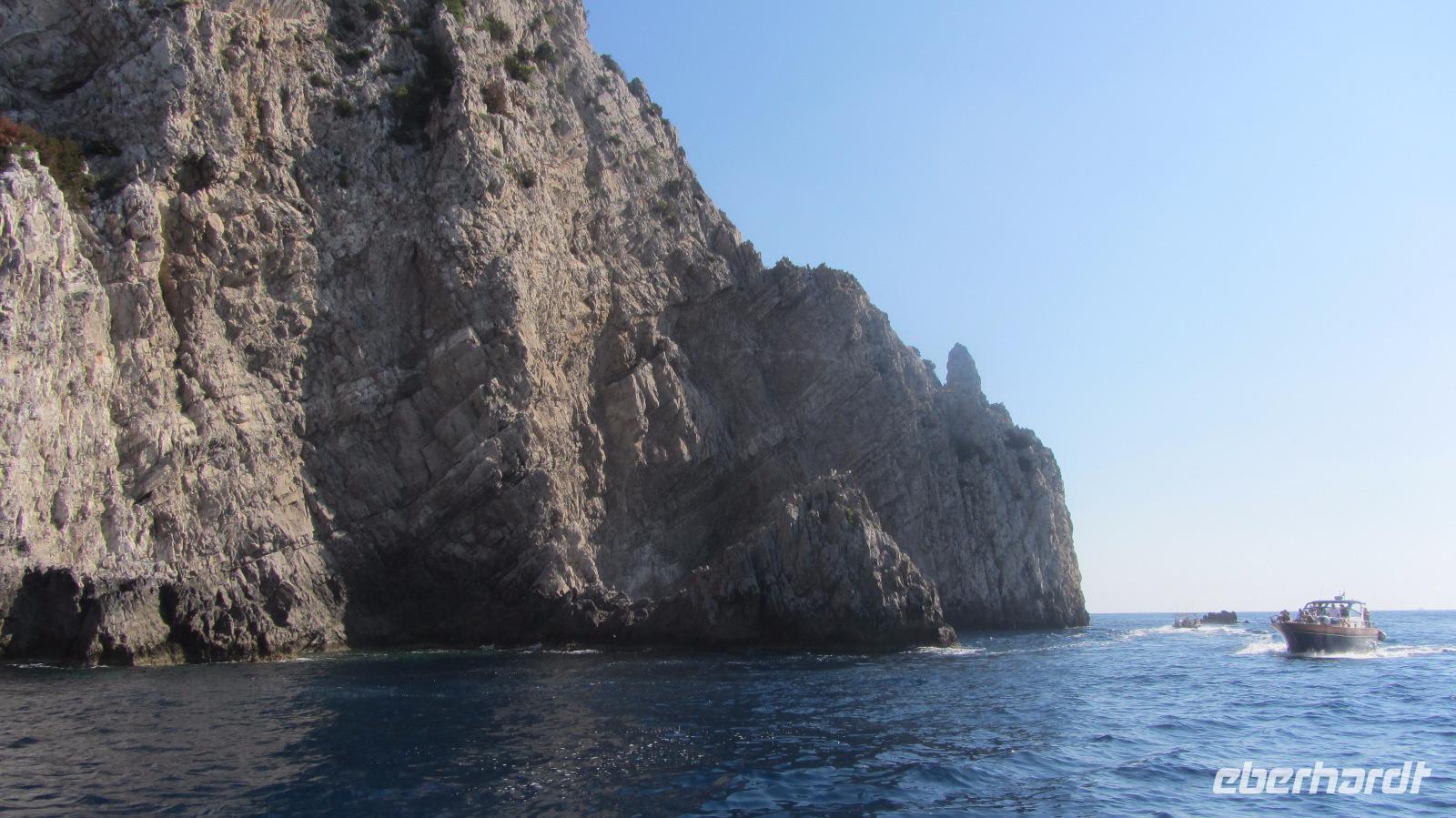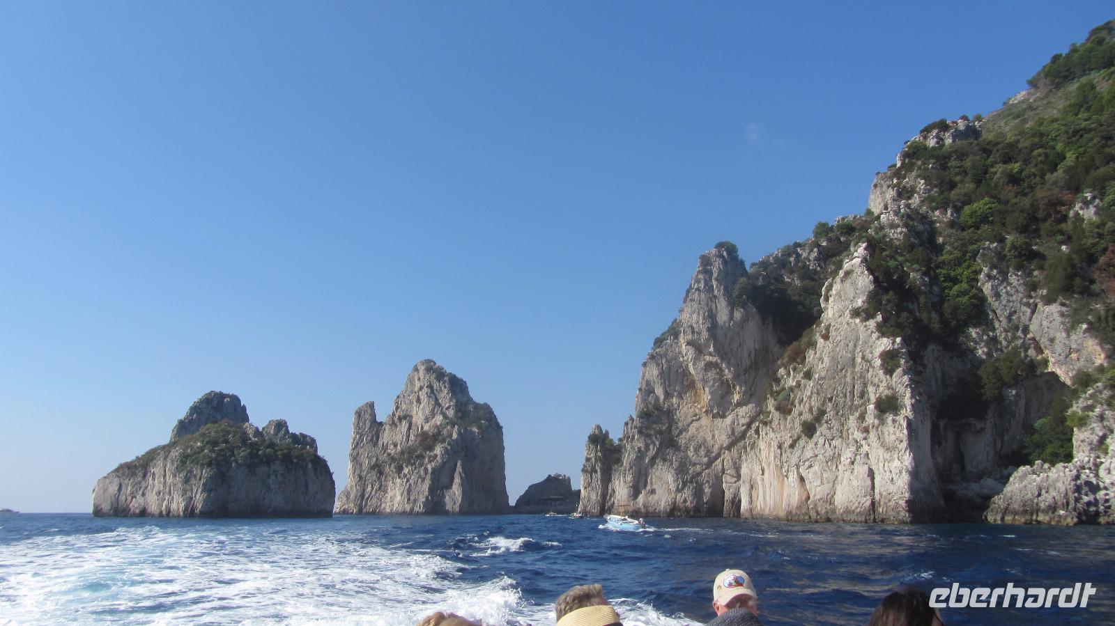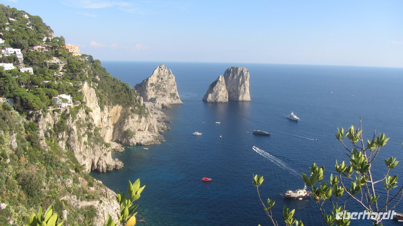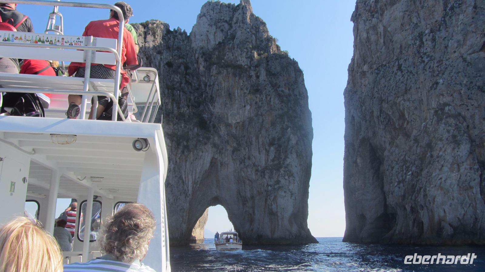Auf den heutigen Tag waren wir alle gespannt. Die Insel Capri wartet auf uns - viel besungen und erzählt wurde über sie. Wir starten zum Hafen von Sorrent und setzen mit der Fähre in circa 25 Minuten über. Am Hafen organisiert unser Reiseleiter Mathias ein Boot für uns und wir unternehmen eine Insel-Rundfahrt um Capri. Vom Meer aus hat man eine herrliche Sicht auf die felsige Insel. Wir sehen die blaue Grotte, die leider geschlossen ist wegen starkem Wellengang, fahren dann weiter zur grünen Grotte. Unser Boot fährt erstaunlich dicht an die Grotte heran und hier erkennen wir die beeindruckende Farbe des grünen Wassers und erblicken sogar einige Korallen. Weiter umrunden wir die Insel und kommen bis zum Arco Naturale, einem natürlichen Steinbogen. Bei strahlend blauem Himmel genießen wir diese Bootsfahrt, während Mathias uns erzählt, was wir sehen. Wieder an Land nehmen wir Platz im Lieblingsrestaurant von Mathias und genießen einmal wieder Cappuccino und Süßes. Weiter geht es nun mit einem örtlichen Bus nach Anacapri. Wir fahren entlang der beeindruckenden Küstenstraßen, die sprichwörtlich „Mama Mia" genannt wird, was wir später gut verstehen. In Anacapri spazieren wir durch die Stadt bis zur Villa San Michele, wo wir uns das traumhaft gelegene Haus näher anschauen und anschließend auf der Dachterrasse Platz nehmen, um uns eine Mittagspause mit traumhaften Ausblick zu gönnen. Anschließend erkunden wir auch die Gassen der Altstadt von Anacapri bis wir mit dem Bus weiter nach Capri fahren. Hier verzaubert uns der Blick vom berühmten Belvedere, dem Balkon von Capri. Weiter bummeln wir durch die Straßen bis zur Parfümerie ... und den Augustus Gärten, wo wir jetzt auch den Blick auf die berühmten Felsen von Capri genießen können. Auf dem Rückweg finden wir noch ein paar Souvenirs und bewundern eine Trauung, die heute in der Kirche stattfindet. Es wird nun schon langsam ruhiger auf der Insel, denn die Tagestouristen fahren längst zurück. Beeindruckt von dem perfekten Tag fahren wir zum Hafen zurück und nach kurzer Wartezeit geht es mit Fähre und Bus zurück zum Hotel, wo das schmackhafte Abendessen auf uns wartet und wir müde aber zufrieden ins Bett fallen.