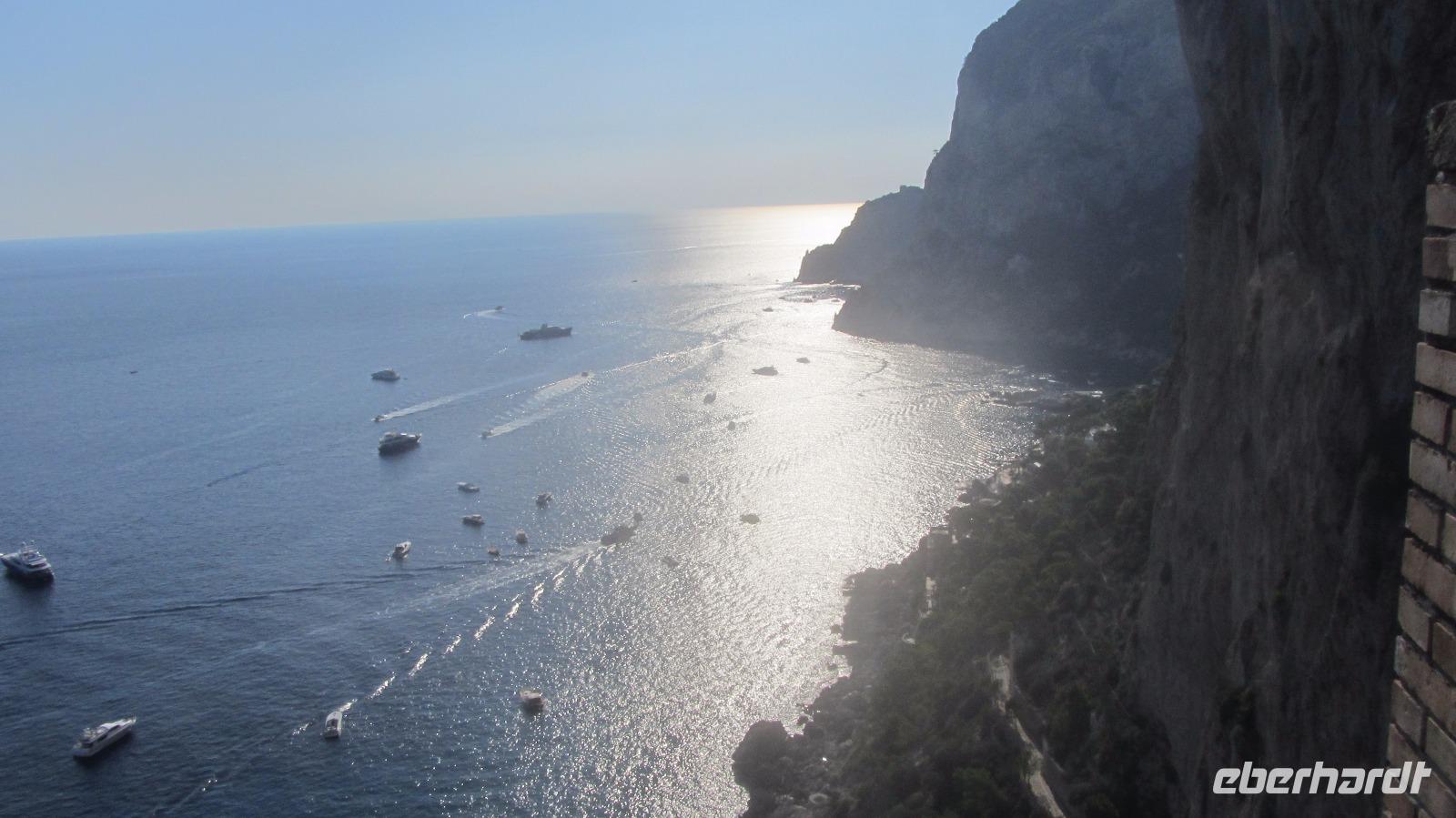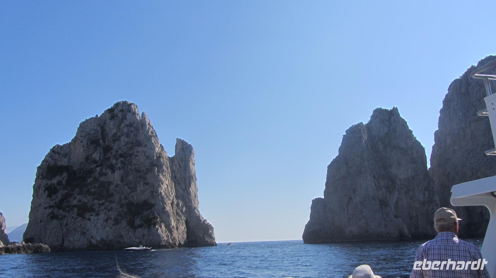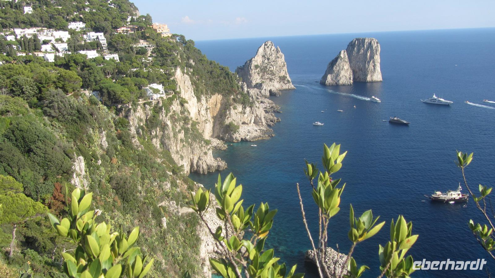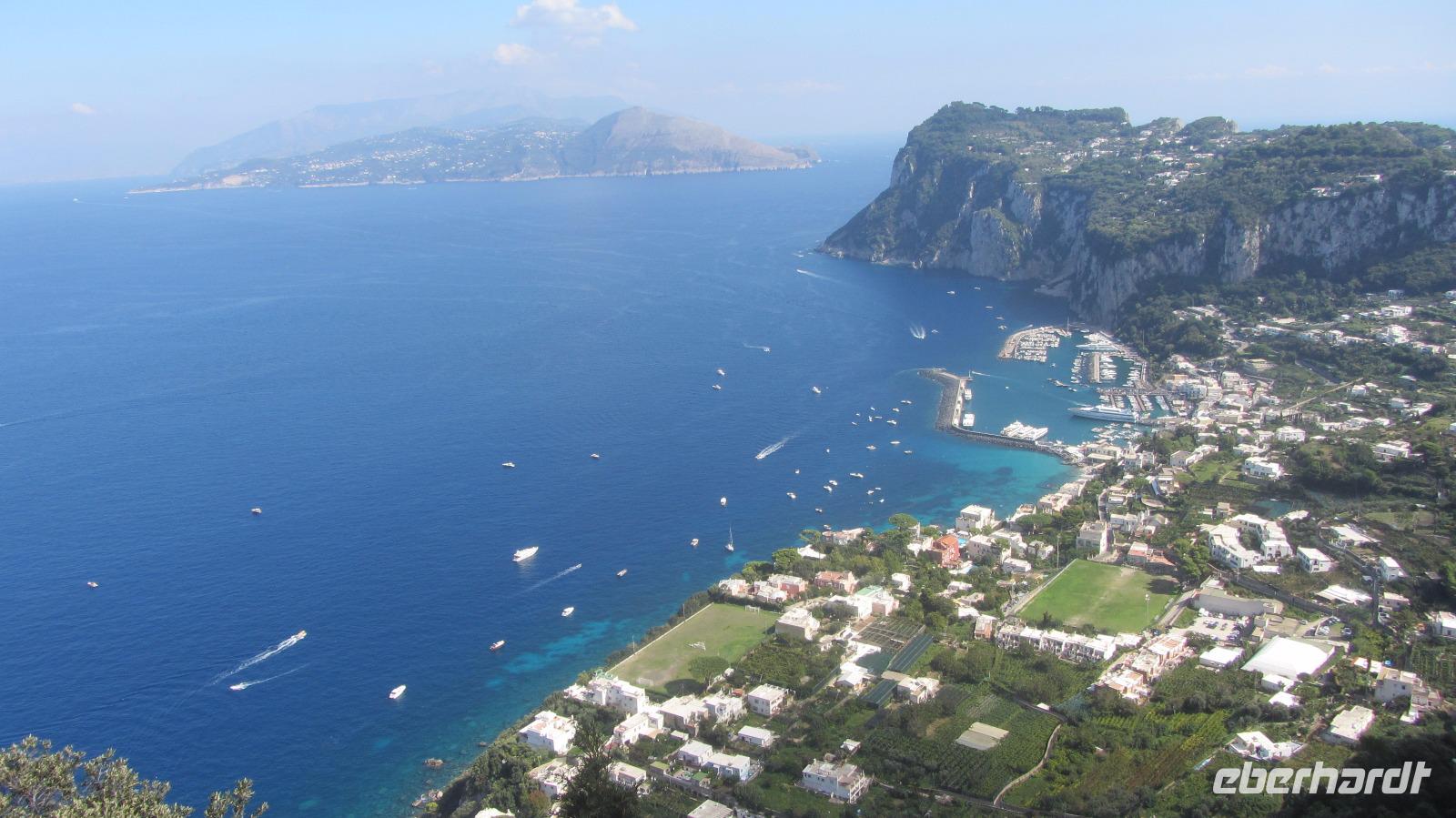Auf den heutigen Tag waren wir alle gespannt. Die Insel Capri wartet auf uns - viel besungen und erzählt wurde über sie. Wir starten zum Hafen von Sorrent und setzen mit der Fähre in circa 25 Minuten über. Am Hafen organisiert unser Reiseleiter Mathias ein Boot für uns und wir unternehmen eine Insel-Rundfahrt um Capri. Vom Meer aus hat man eine herrliche Sicht auf die felsige Insel. Wir sehen die blaue Grotte, die leider geschlossen ist wegen starkem Wellengang, fahren dann weiter zur grünen Grotte. Unser Boot fährt erstaunlich dicht an die Grotte heran und hier erkennen wir die beeindruckende Farbe des grünen Wassers und erblicken sogar einige Korallen. Weiter umrunden wir die Insel und kommen bis zum Arco Naturale, einem natürlichen Steinbogen. Bei strahlend blauem Himmel genießen wir diese Bootsfahrt, während Mathias uns erzählt, was wir sehen. Wieder an Land nehmen wir Platz im Lieblingsrestaurant von Mathias und genießen einmal wieder Cappuccino und Süßes. Weiter geht es nun mit einem örtlichen Bus nach Anacapri. Wir fahren entlang der beeindruckenden Küstenstraßen, die sprichwörtlich „Mama Mia" genannt wird, was wir später gut verstehen. In Anacapri spazieren wir durch die Stadt bis zur Villa San Michele, wo wir uns das traumhaft gelegene Haus näher anschauen und anschließend auf der Dachterrasse Platz nehmen, um uns eine Mittagspause mit traumhaften Ausblick zu gönnen. Anschließend erkunden wir auch die Gassen der Altstadt von Anacapri bis wir mit dem Bus weiter nach Capri fahren. Hier verzaubert uns der Blick vom berühmten Belvedere, dem Balkon von Capri. Weiter bummeln wir durch die Straßen bis zur Parfümerie ... und den Augustus Gärten, wo wir jetzt auch den Blick auf die berühmten Felsen von Capri genießen können. Auf dem Rückweg finden wir noch ein paar Souvenirs und bewundern eine Trauung, die heute in der Kirche stattfindet. Es wird nun schon langsam ruhiger auf der Insel, denn die Tagestouristen fahren längst zurück. Beeindruckt von dem perfekten Tag fahren wir zum Hafen zurück und nach kurzer Wartezeit geht es mit Fähre und Bus zurück zum Hotel, wo das schmackhafte Abendessen auf uns wartet und wir müde aber zufrieden ins Bett fallen.