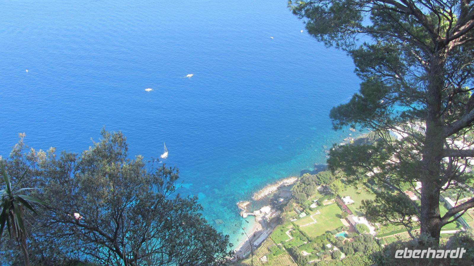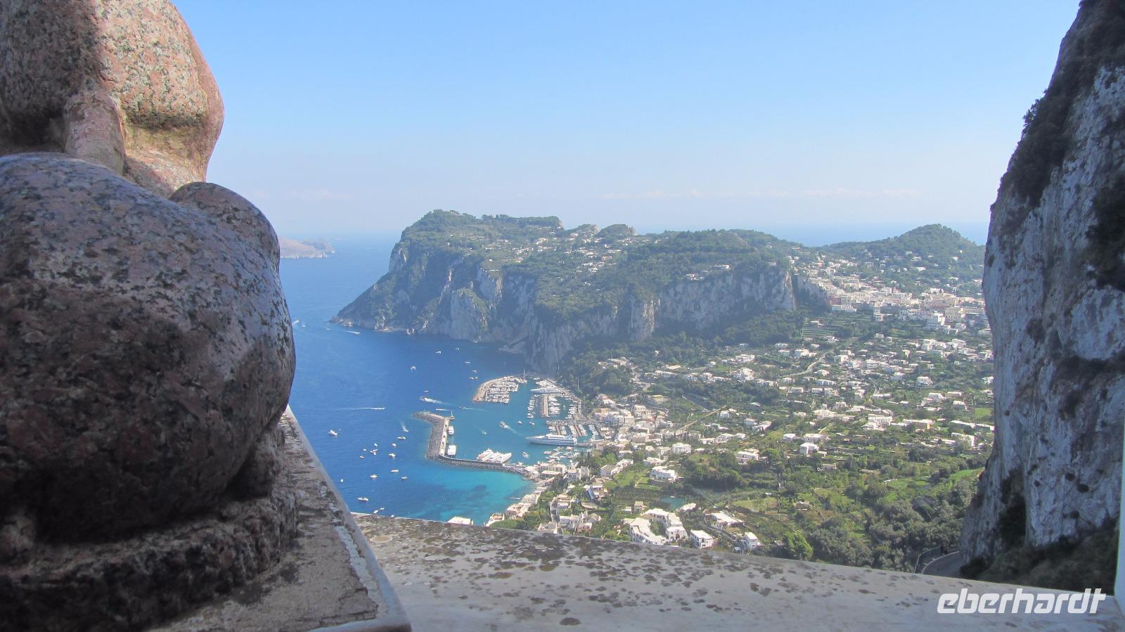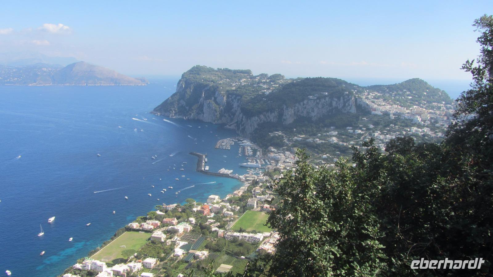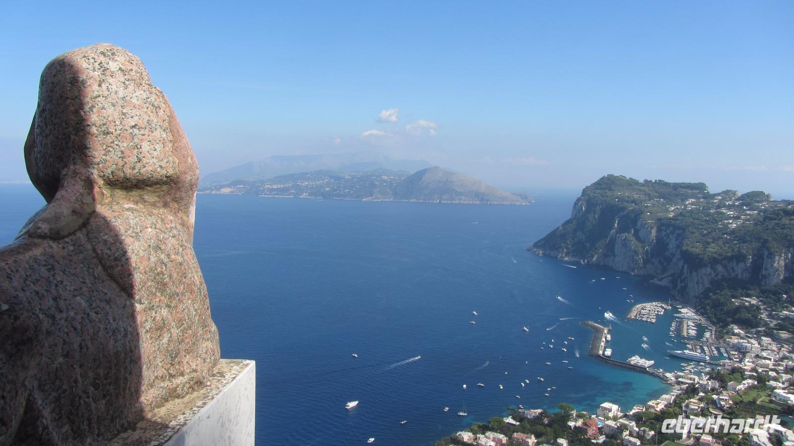 Auf den heutigen Tag waren wir alle gespannt. Die Insel Capri wartet auf uns - viel besungen und erzählt wurde über sie. Wir starten zum Hafen von Sorrent und setzen mit der Fähre in circa 25 Minuten über. Am Hafen organisiert unser Reiseleiter Mathias ein Boot für uns und wir unternehmen eine Insel-Rundfahrt um Capri. Vom Meer aus hat man eine herrliche Sicht auf die felsige Insel. Wir sehen die blaue Grotte, die leider geschlossen ist wegen starkem Wellengang, fahren dann weiter zur grünen Grotte. Unser Boot fährt erstaunlich dicht an die Grotte heran und hier erkennen wir die beeindruckende Farbe des grünen Wassers und erblicken sogar einige Korallen. Weiter umrunden wir die Insel und kommen bis zum Arco Naturale, einem natürlichen Steinbogen. Bei strahlend blauem Himmel genießen wir diese Bootsfahrt, während Mathias uns erzählt, was wir sehen. Wieder an Land nehmen wir Platz im Lieblingsrestaurant von Mathias und genießen einmal wieder Cappuccino und Süßes. Weiter geht es nun mit einem örtlichen Bus nach Anacapri. Wir fahren entlang der beeindruckenden Küstenstraßen, die sprichwörtlich „Mama Mia" genannt wird, was wir später gut verstehen. In Anacapri spazieren wir durch die Stadt bis zur Villa San Michele, wo wir uns das traumhaft gelegene Haus näher anschauen und anschließend auf der Dachterrasse Platz nehmen, um uns eine Mittagspause mit traumhaften Ausblick zu gönnen. Anschließend erkunden wir auch die Gassen der Altstadt von Anacapri bis wir mit dem Bus weiter nach Capri fahren. Hier verzaubert uns der Blick vom berühmten Belvedere, dem Balkon von Capri. Weiter bummeln wir durch die Straßen bis zur Parfümerie ... und den Augustus Gärten, wo wir jetzt auch den Blick auf die berühmten Felsen von Capri genießen können. Auf dem Rückweg finden wir noch ein paar Souvenirs und bewundern eine Trauung, die heute in der Kirche stattfindet. Es wird nun schon langsam ruhiger auf der Insel, denn die Tagestouristen fahren längst zurück. Beeindruckt von dem perfekten Tag fahren wir zum Hafen zurück und nach kurzer Wartezeit geht es mit Fähre und Bus zurück zum Hotel, wo das schmackhafte Abendessen auf uns wartet und wir müde aber zufrieden ins Bett fallen.