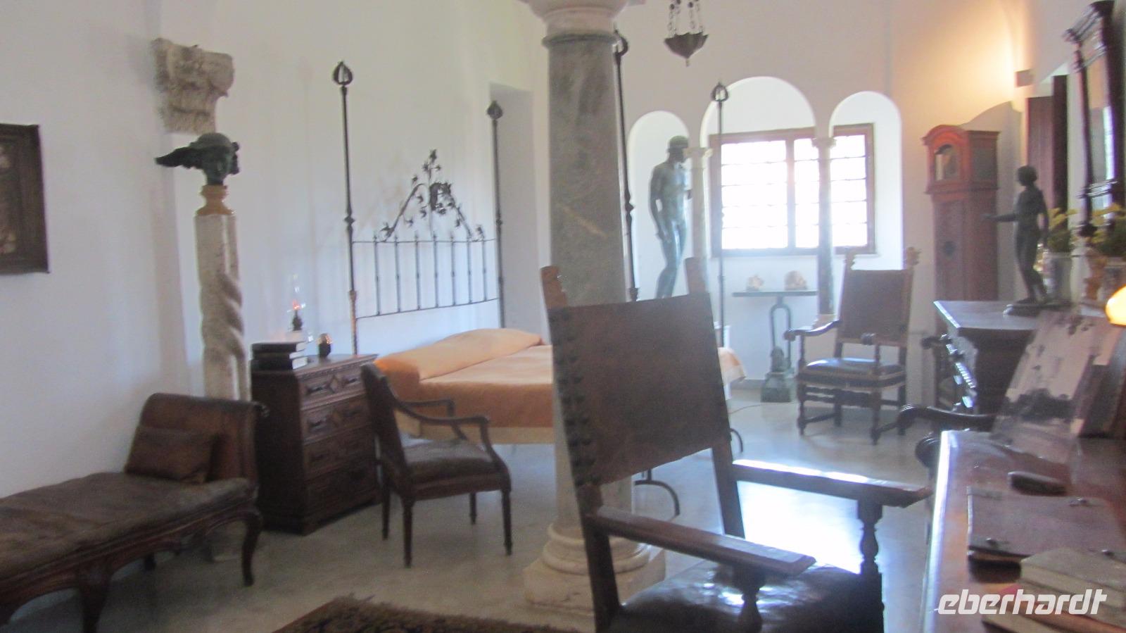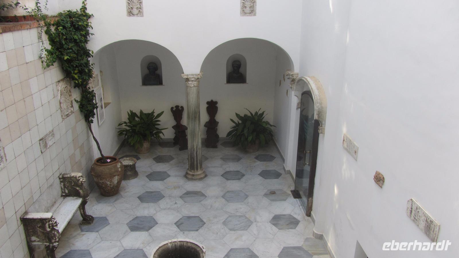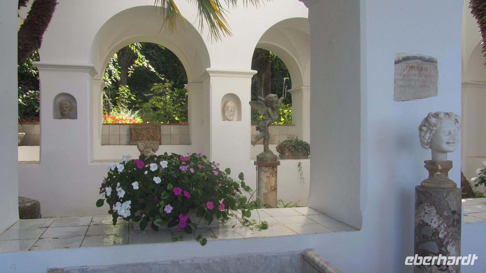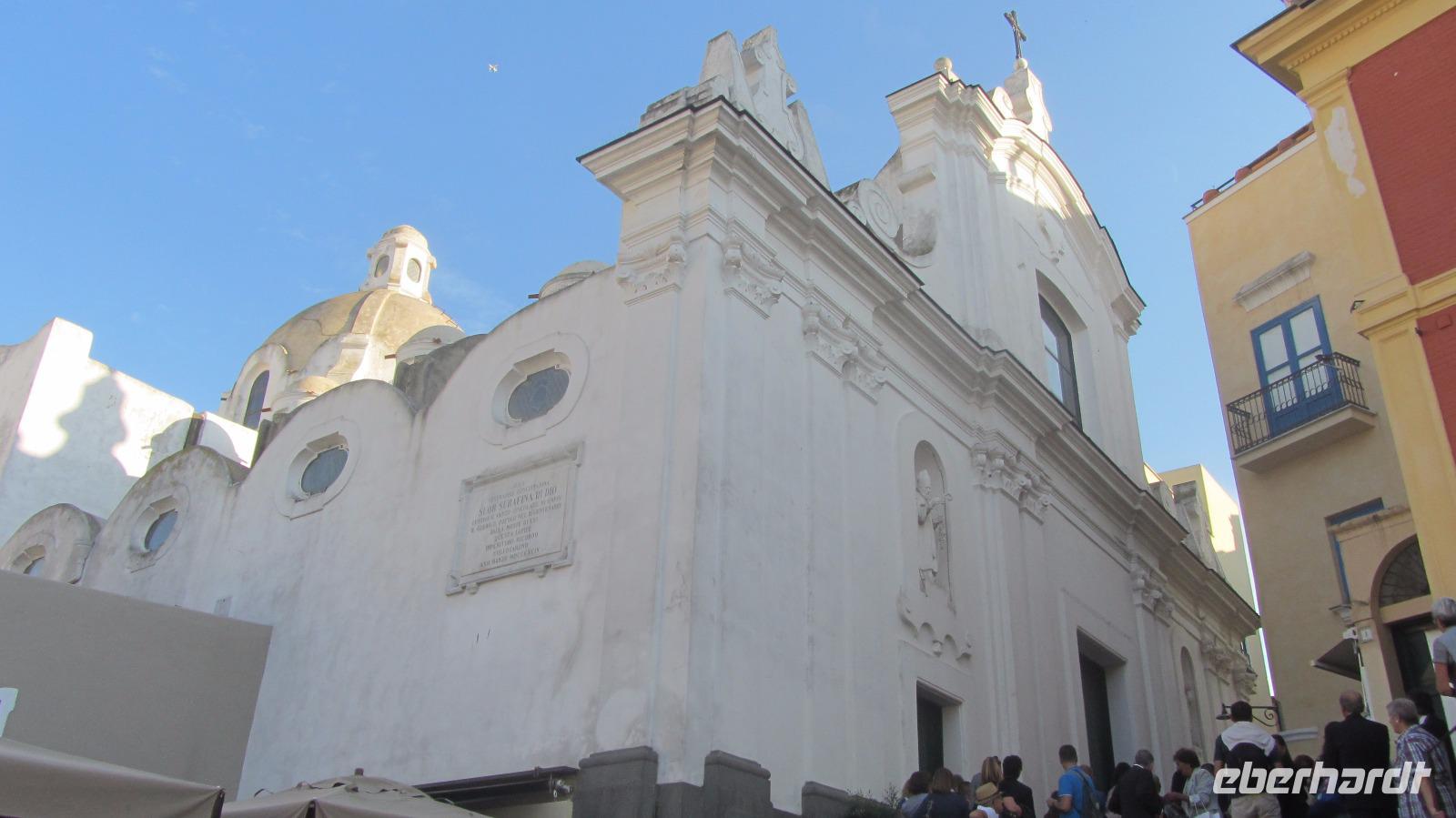 Auf den heutigen Tag waren wir alle gespannt. Die Insel Capri wartet auf uns - viel besungen und erzählt wurde über sie. Wir starten zum Hafen von Sorrent und setzen mit der Fähre in circa 25 Minuten über. Am Hafen organisiert unser Reiseleiter Mathias ein Boot für uns und wir unternehmen eine Insel-Rundfahrt um Capri. Vom Meer aus hat man eine herrliche Sicht auf die felsige Insel. Wir sehen die blaue Grotte, die leider geschlossen ist wegen starkem Wellengang, fahren dann weiter zur grünen Grotte. Unser Boot fährt erstaunlich dicht an die Grotte heran und hier erkennen wir die beeindruckende Farbe des grünen Wassers und erblicken sogar einige Korallen. Weiter umrunden wir die Insel und kommen bis zum Arco Naturale, einem natürlichen Steinbogen. Bei strahlend blauem Himmel genießen wir diese Bootsfahrt, während Mathias uns erzählt, was wir sehen. Wieder an Land nehmen wir Platz im Lieblingsrestaurant von Mathias und genießen einmal wieder Cappuccino und Süßes. Weiter geht es nun mit einem örtlichen Bus nach Anacapri. Wir fahren entlang der beeindruckenden Küstenstraßen, die sprichwörtlich „Mama Mia" genannt wird, was wir später gut verstehen. In Anacapri spazieren wir durch die Stadt bis zur Villa San Michele, wo wir uns das traumhaft gelegene Haus näher anschauen und anschließend auf der Dachterrasse Platz nehmen, um uns eine Mittagspause mit traumhaften Ausblick zu gönnen. Anschließend erkunden wir auch die Gassen der Altstadt von Anacapri bis wir mit dem Bus weiter nach Capri fahren. Hier verzaubert uns der Blick vom berühmten Belvedere, dem Balkon von Capri. Weiter bummeln wir durch die Straßen bis zur Parfümerie ... und den Augustus Gärten, wo wir jetzt auch den Blick auf die berühmten Felsen von Capri genießen können. Auf dem Rückweg finden wir noch ein paar Souvenirs und bewundern eine Trauung, die heute in der Kirche stattfindet. Es wird nun schon langsam ruhiger auf der Insel, denn die Tagestouristen fahren längst zurück. Beeindruckt von dem perfekten Tag fahren wir zum Hafen zurück und nach kurzer Wartezeit geht es mit Fähre und Bus zurück zum Hotel, wo das schmackhafte Abendessen auf uns wartet und wir müde aber zufrieden ins Bett fallen.