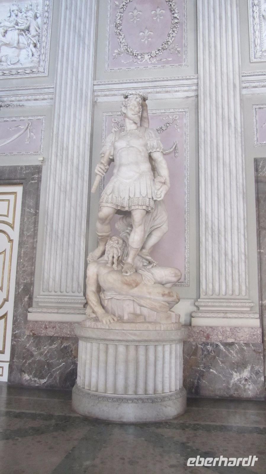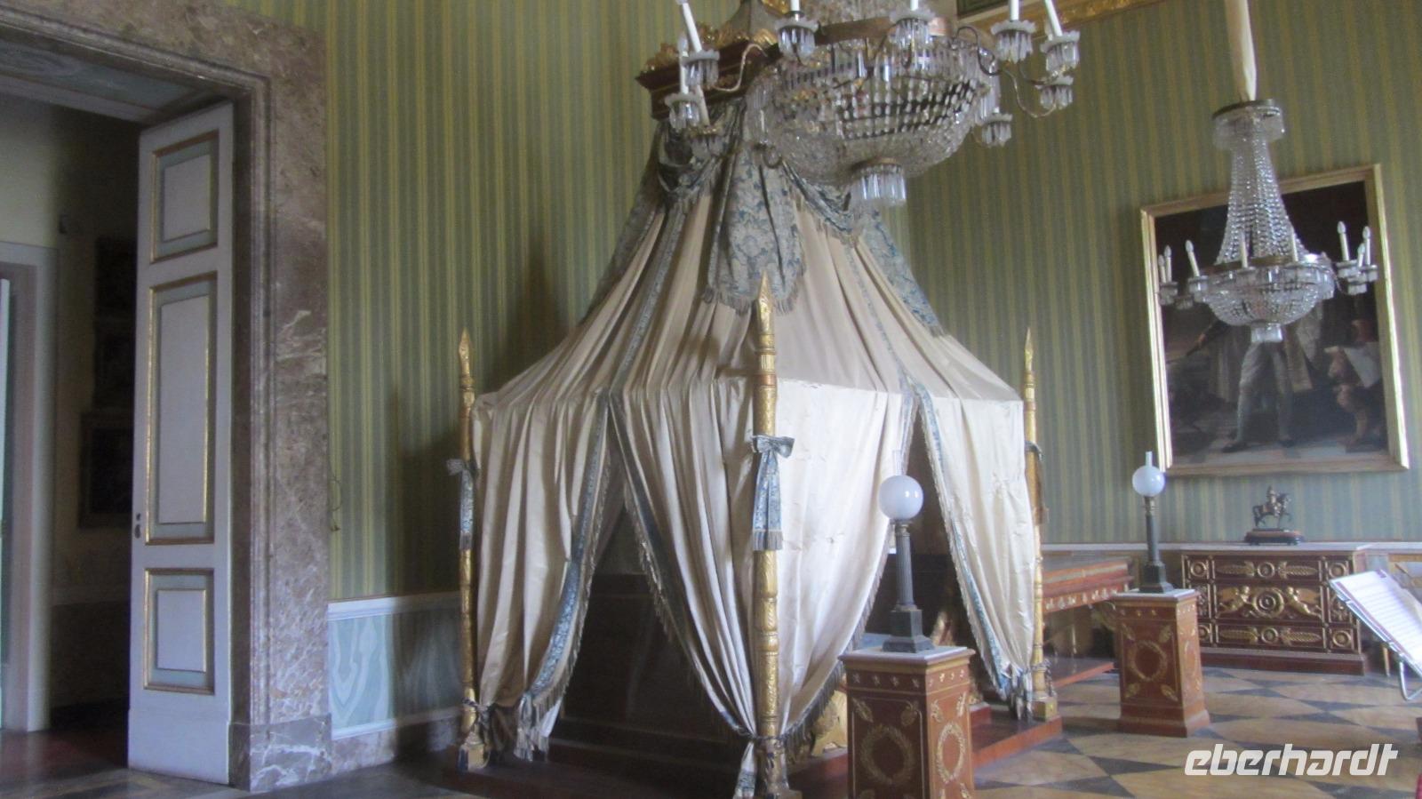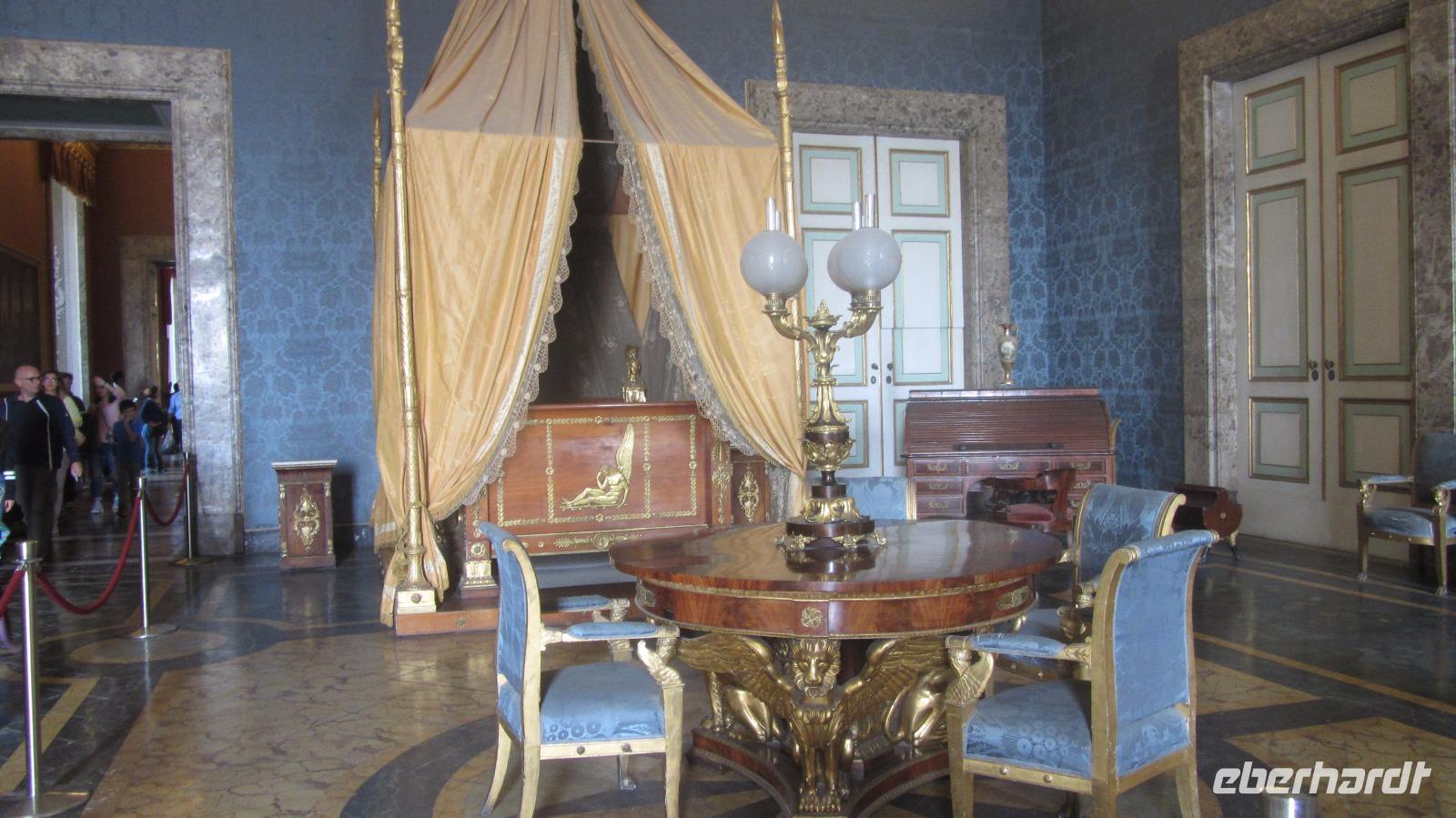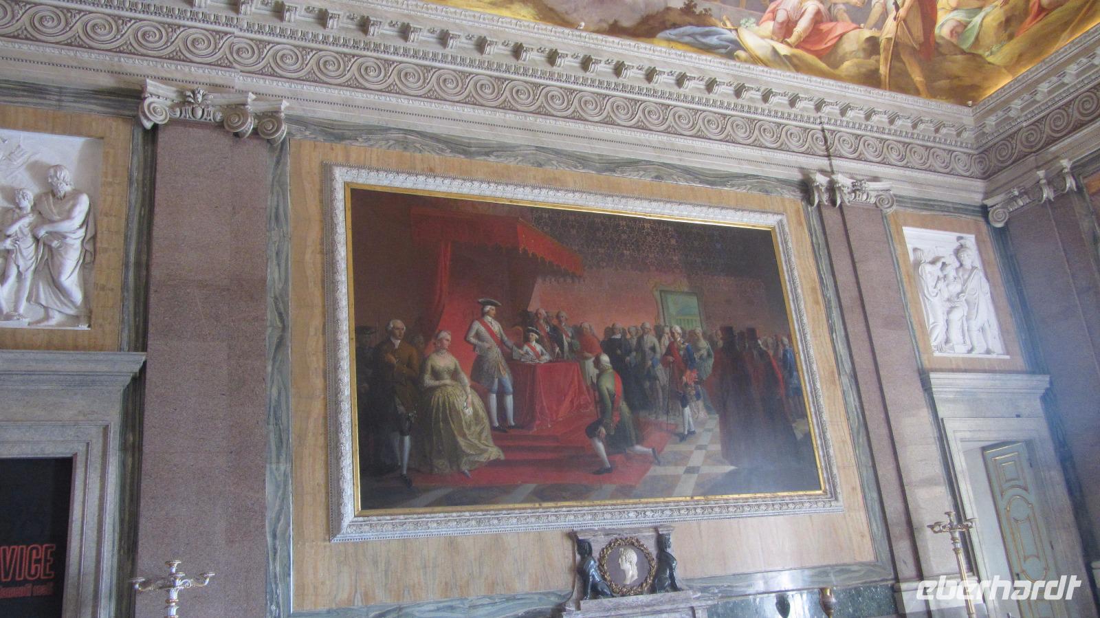 Leider haben auch viele andere an diesem Sonntag den Wunsch, das Schloss zu besuchen, so dass sich zwei sehr lange Schlangen davor bilden. Mit gutem Zureden unseres Reiseleiters Mathias können wir nach kurzer Wartezeit an den Schlangen vorbei gehen und gelangen in den prächtigen Bau. . Das Schloss gehört zu den größten Schlössern in Europa und sollte dem Schloss Versaille ähneln. Zuerst wollen wir uns die Gärten anschauen. Die Weite des Gartens beeindruckt, wir schauen uns um und Mathias erklärt Wissenswertes dazu. Anschließend möchten wir das prächtige Schloss von innen anschauen. Leider wollen das viele andere auch und wir müssen nun doch anstehen. Nach etwas Zeit im Gedränge haben wir es dann doch endlich geschafft. Allein die majestätische Prunktreppe aus Marmor, die wir leider nicht in Ruhe erklimmen können, weil das Gedränge groß ist, ist beeindruckend. Die Königsgemächer im ersten Stock mit dem imposanten Thronsaal und der Palastkapelle, die eine Kopie der Kapelle von Versailles ist, schauen wir uns genau an. Trotz einiger Veränderungen der Ausstattung der Räume im Laufe der Jahrhunderte sind doch noch heute viele Möbel erhalten. Besonders beeindrucken uns die praktischen Dinge, wie zum Beispiel, das erste BD, was im Badezimmer zu sehen ist. Aber auch die filigranen Arbeiten, Gemälde, die viel über die damalige Zeit berichten, erklärt uns Mathias näher.