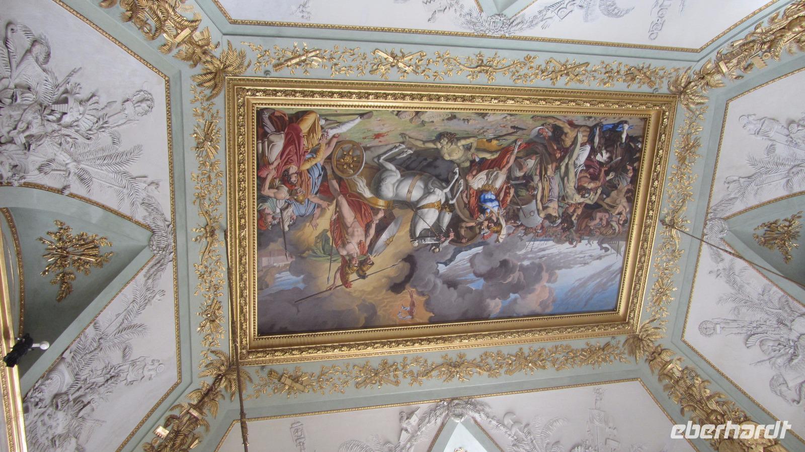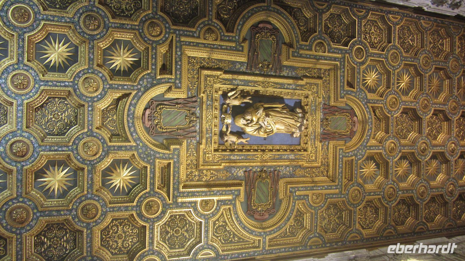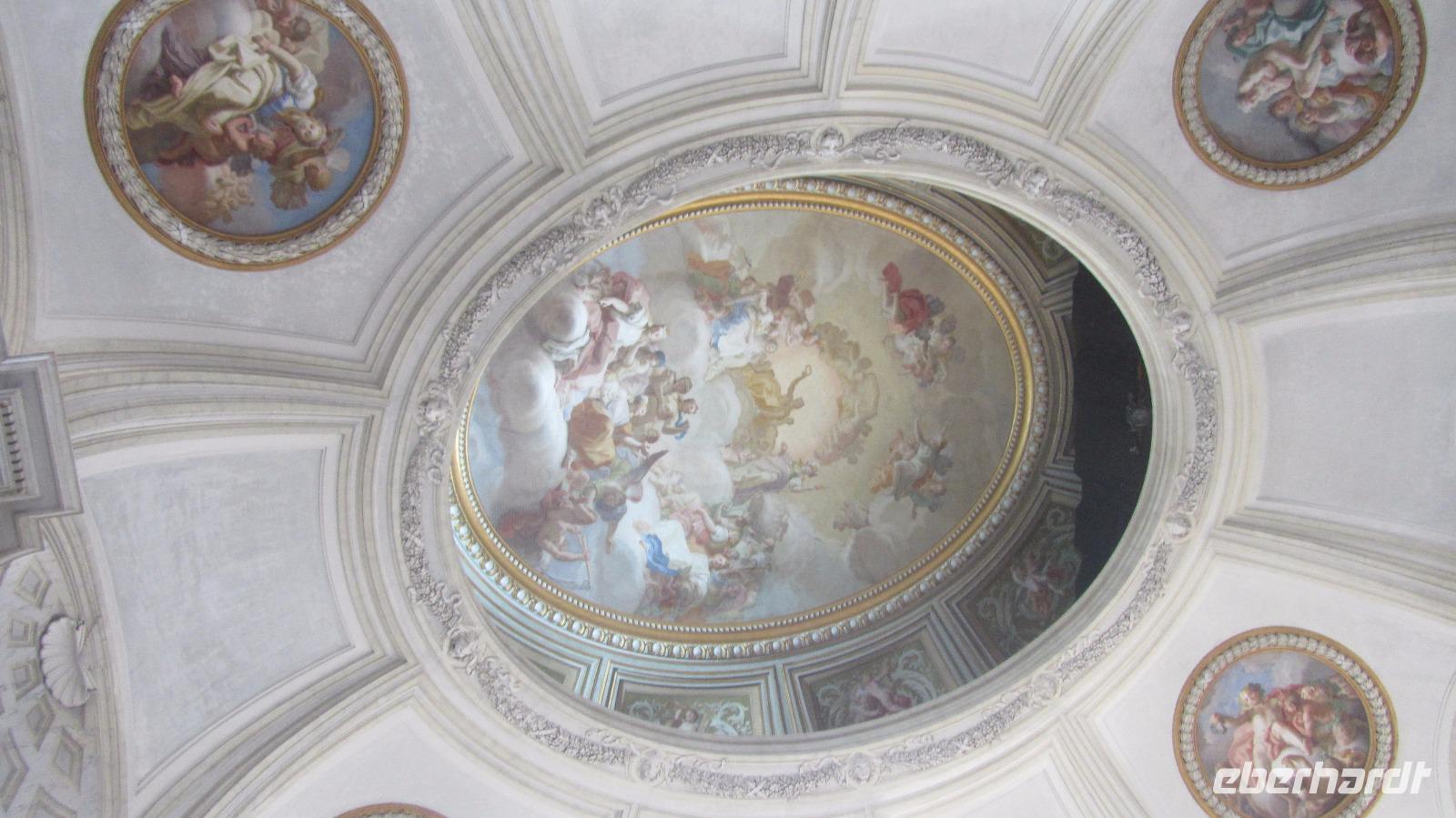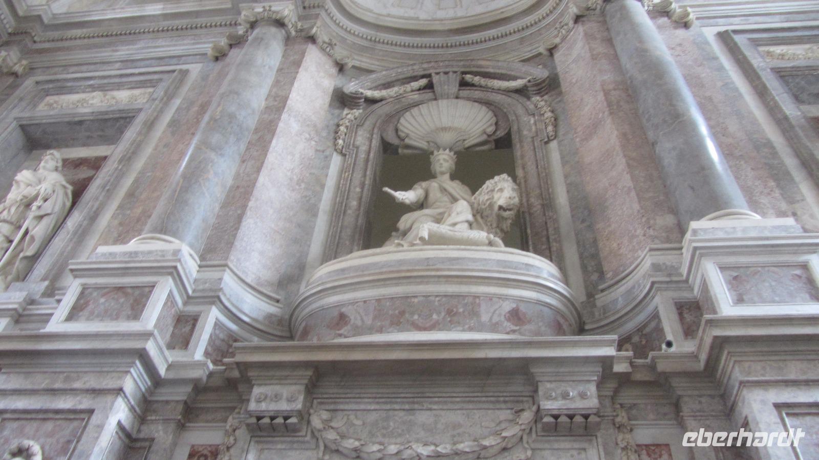 Leider haben auch viele andere an diesem Sonntag den Wunsch, das Schloss zu besuchen, so dass sich zwei sehr lange Schlangen davor bilden. Mit gutem Zureden unseres Reiseleiters Mathias können wir nach kurzer Wartezeit an den Schlangen vorbei gehen und gelangen in den prächtigen Bau. . Das Schloss gehört zu den größten Schlössern in Europa und sollte dem Schloss Versaille ähneln. Zuerst wollen wir uns die Gärten anschauen. Die Weite des Gartens beeindruckt, wir schauen uns um und Mathias erklärt Wissenswertes dazu. Anschließend möchten wir das prächtige Schloss von innen anschauen. Leider wollen das viele andere auch und wir müssen nun doch anstehen. Nach etwas Zeit im Gedränge haben wir es dann doch endlich geschafft. Allein die majestätische Prunktreppe aus Marmor, die wir leider nicht in Ruhe erklimmen können, weil das Gedränge groß ist, ist beeindruckend. Die Königsgemächer im ersten Stock mit dem imposanten Thronsaal und der Palastkapelle, die eine Kopie der Kapelle von Versailles ist, schauen wir uns genau an. Trotz einiger Veränderungen der Ausstattung der Räume im Laufe der Jahrhunderte sind doch noch heute viele Möbel erhalten. Besonders beeindrucken uns die praktischen Dinge, wie zum Beispiel, das erste BD, was im Badezimmer zu sehen ist. Aber auch die filigranen Arbeiten, Gemälde, die viel über die damalige Zeit berichten, erklärt uns Mathias näher.
