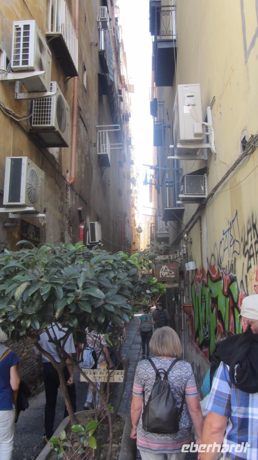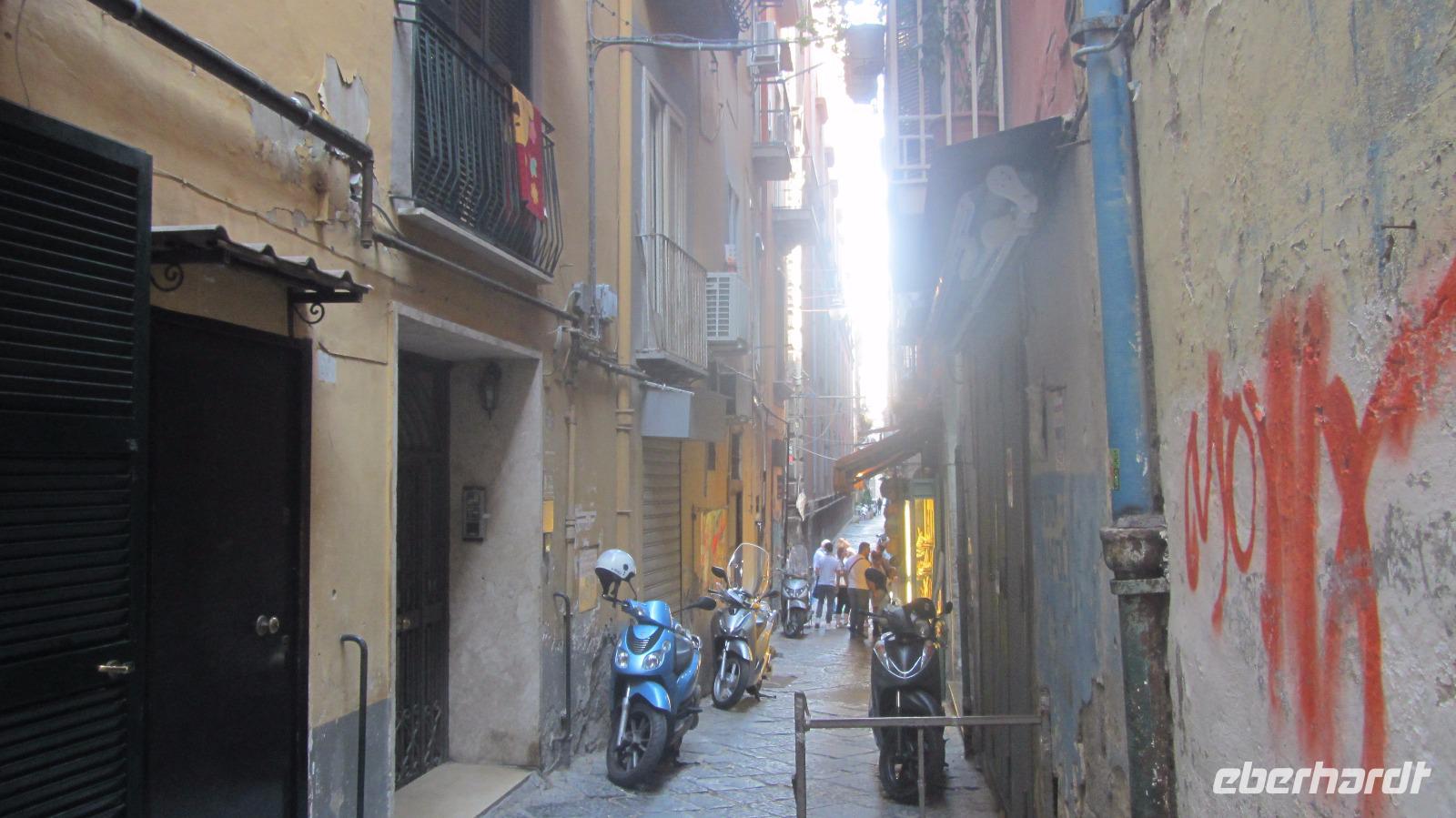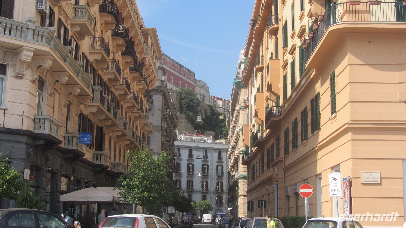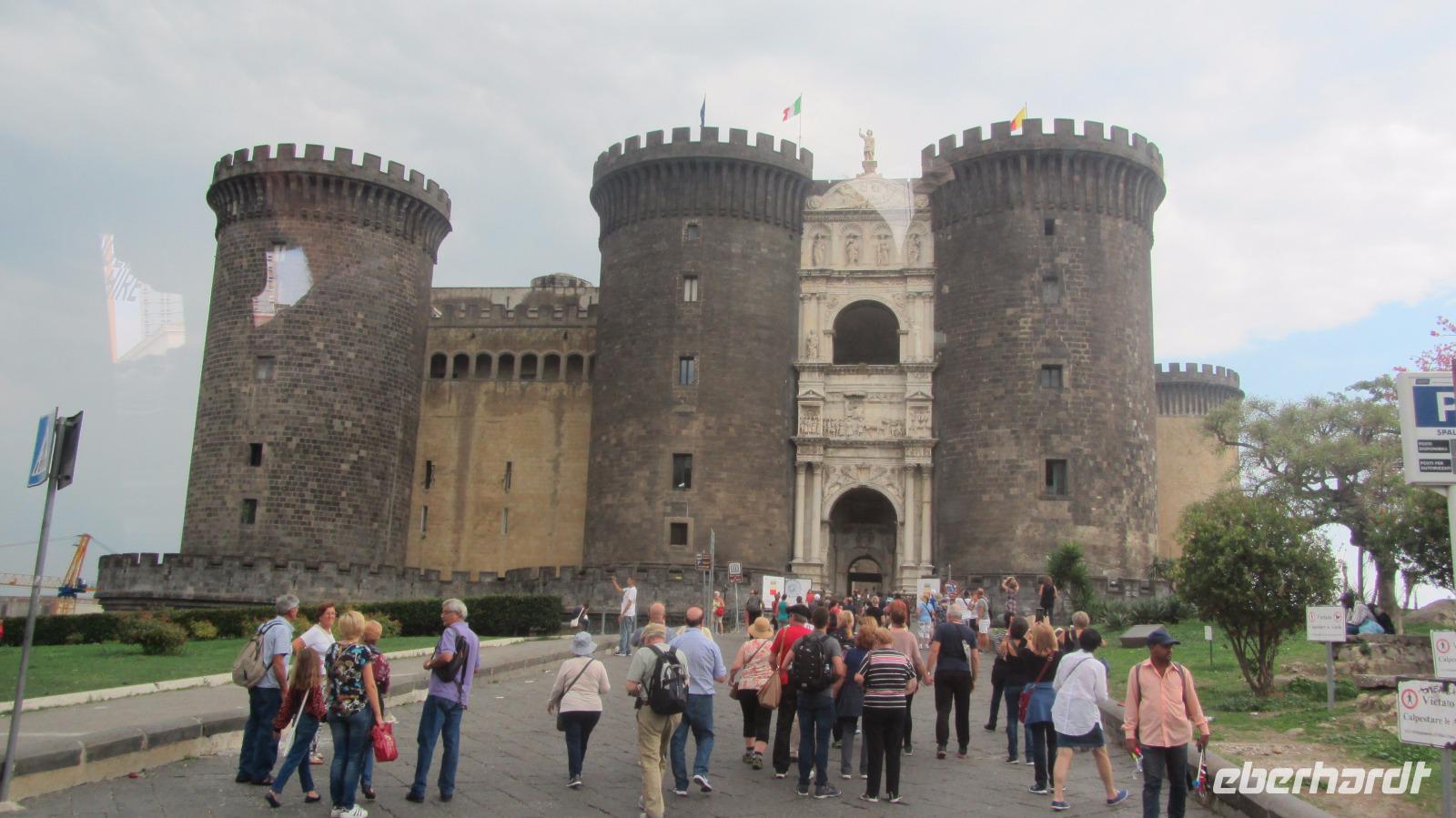 Heute steht die Metropole Neapel auf dem Plan. Wir sind gespannt, was uns erwartet. Wir fahren dieses Mal mit dem Circumvesuviana in Richtung Neapel. Unser Zug startet in Sorrent und bringt uns nach ca. 1 Stunde Fahrt nach Neapel, wo Mathias auf uns wartet. Da heute die Busse und die Metro in Neapel streiken, haben wir kurzfristig einen Bus organisiert, der uns am Vormittag die entfernteren Höhepunkte zeigt. Camillo ist ein besonderer Busfahrer, denn er hat Spaß dabei, uns auch abgelegene Ecken der Stadt zu zeigen und wir fahren durch Gassen, die wir sonst nie sehen würden. Immer wenn er einen Stau sieht, fährt er einfach in eine andere Richtung oder Gasse. Neapel ist die „Stadt, deren Häuser mit Wäscheleinen zusammengehalten werden" heißt ein Sprichwort. Wir sehen diese engen Gassen, wo überall die Wäsche hängt. Mit der Besichtigung starten wir spontan am „hässlichsten" Platz der Stadt und besuchen die Kirche Santa Maria del Carmine auf dem Piazza Mercato. Anschließend fahren wir entlang der Küste mit fantastischen Aussichten und enden am Castello Nuovo. Von der kleinen Insel spazieren wir entlang der Küste bis zum Piazza Plebiscito. Vor dem Königspalast befindet sich nicht nur der berühmteste Platz in Neapel, sondern auch der größte und repräsentativste. Durch das berühmte Café Gambrinus und die berühmte Einkaufspassage Umberto, die auch an das berühmte Mailänder Einkaufscenter erinnert, spazieren wir weiter zum Theaterhaus, was aktuell leider eingerüstet ist und gönnen uns hier einen schnellen Kaffee.