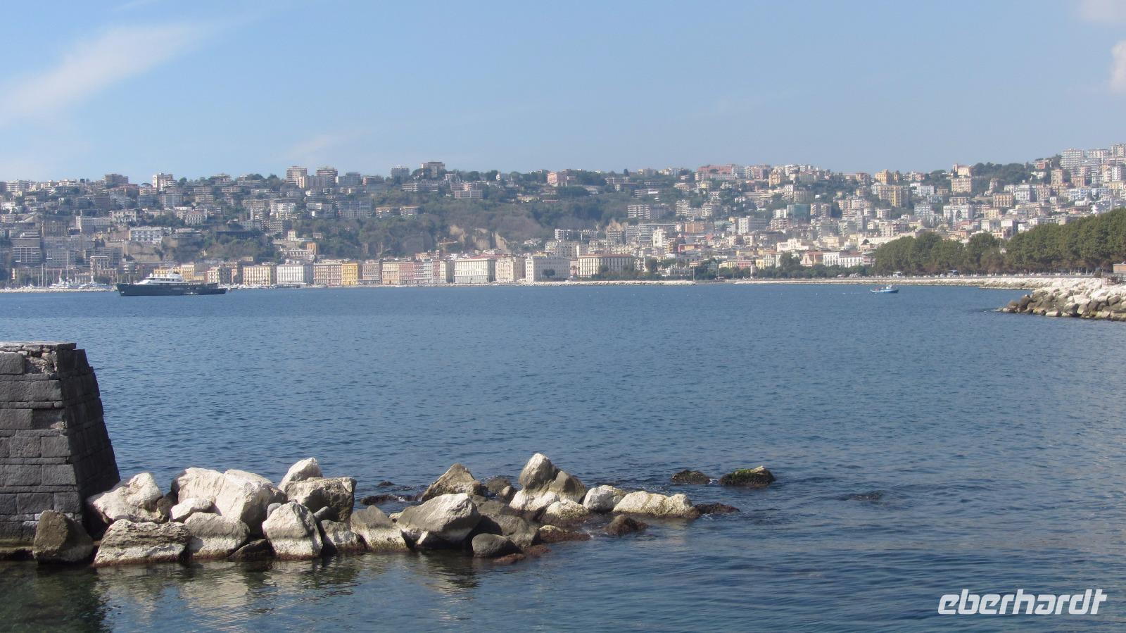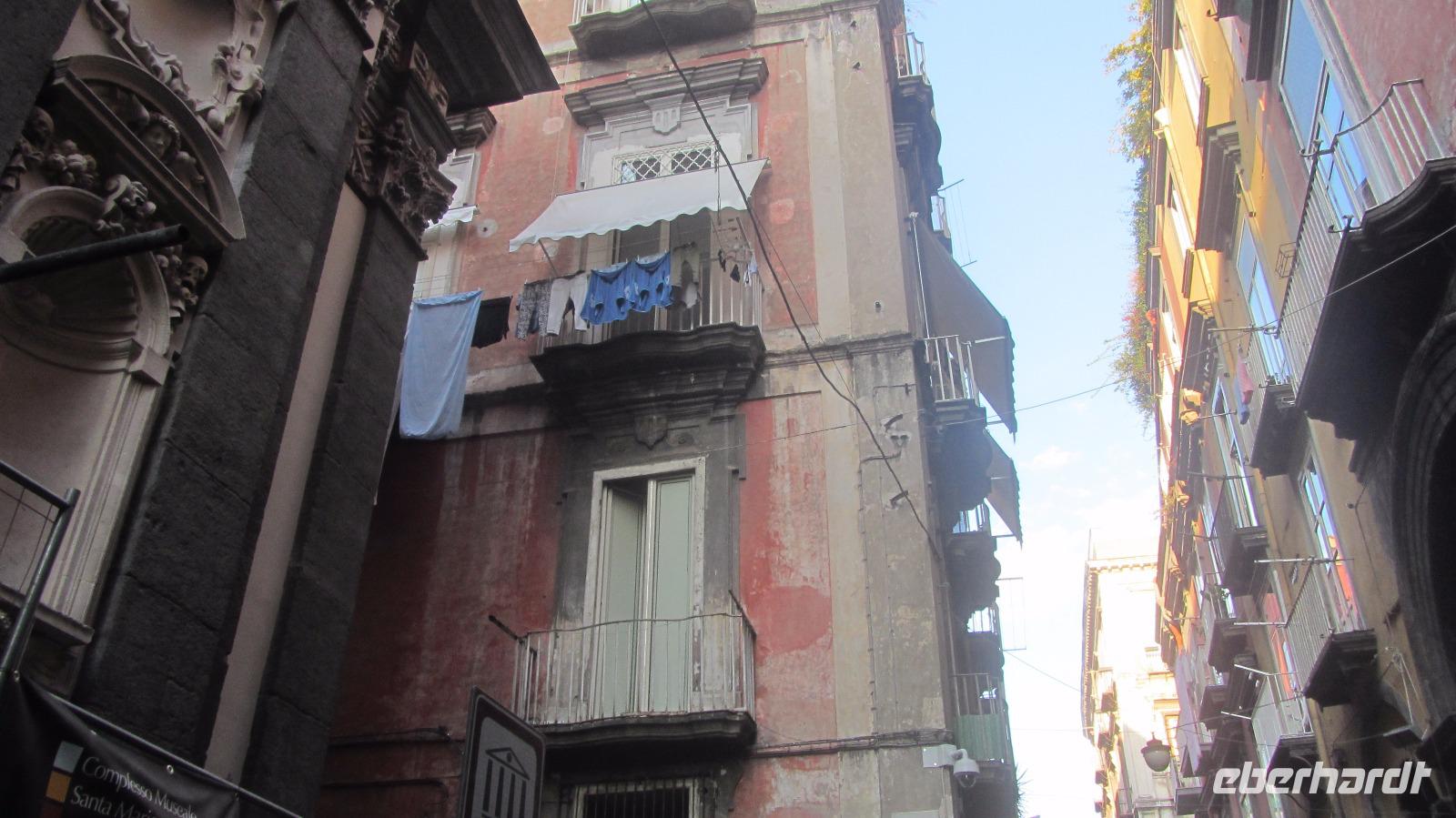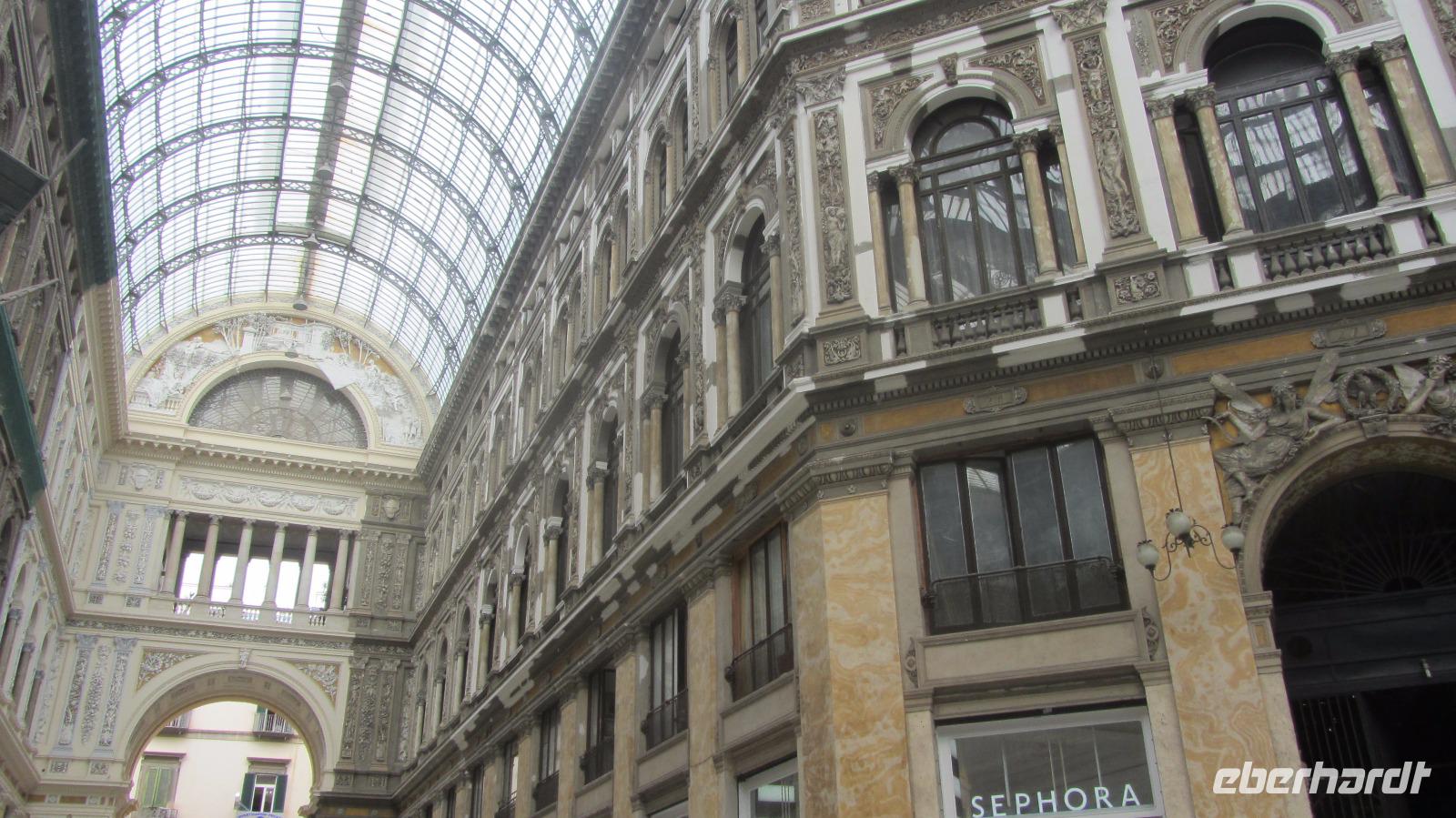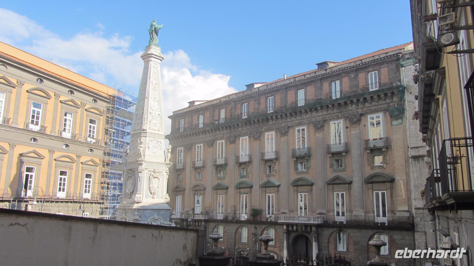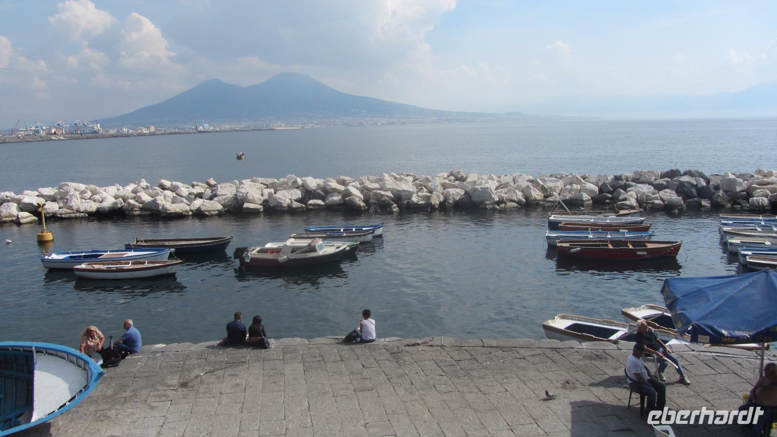 Heute steht die Metropole Neapel auf dem Plan. Wir sind gespannt, was uns erwartet. Wir fahren dieses Mal mit dem Circumvesuviana in Richtung Neapel. Unser Zug startet in Sorrent und bringt uns nach ca. 1 Stunde Fahrt nach Neapel, wo Mathias auf uns wartet. Da heute die Busse und die Metro in Neapel streiken, haben wir kurzfristig einen Bus organisiert, der uns am Vormittag die entfernteren Höhepunkte zeigt. Camillo ist ein besonderer Busfahrer, denn er hat Spaß dabei, uns auch abgelegene Ecken der Stadt zu zeigen und wir fahren durch Gassen, die wir sonst nie sehen würden. Immer wenn er einen Stau sieht, fährt er einfach in eine andere Richtung oder Gasse. Neapel ist die „Stadt, deren Häuser mit Wäscheleinen zusammengehalten werden" heißt ein Sprichwort. Wir sehen diese engen Gassen, wo überall die Wäsche hängt. Mit der Besichtigung starten wir spontan am „hässlichsten" Platz der Stadt und besuchen die Kirche Santa Maria del Carmine auf dem Piazza Mercato. Anschließend fahren wir entlang der Küste mit fantastischen Aussichten und enden am Castello Nuovo. Von der kleinen Insel spazieren wir entlang der Küste bis zum Piazza Plebiscito. Vor dem Königspalast befindet sich nicht nur der berühmteste Platz in Neapel, sondern auch der größte und repräsentativste. Durch das berühmte Café Gambrinus und die berühmte Einkaufspassage Umberto, die auch an das berühmte Mailänder Einkaufscenter erinnert, spazieren wir weiter zum Theaterhaus, was aktuell leider eingerüstet ist und gönnen uns hier einen schnellen Kaffee.