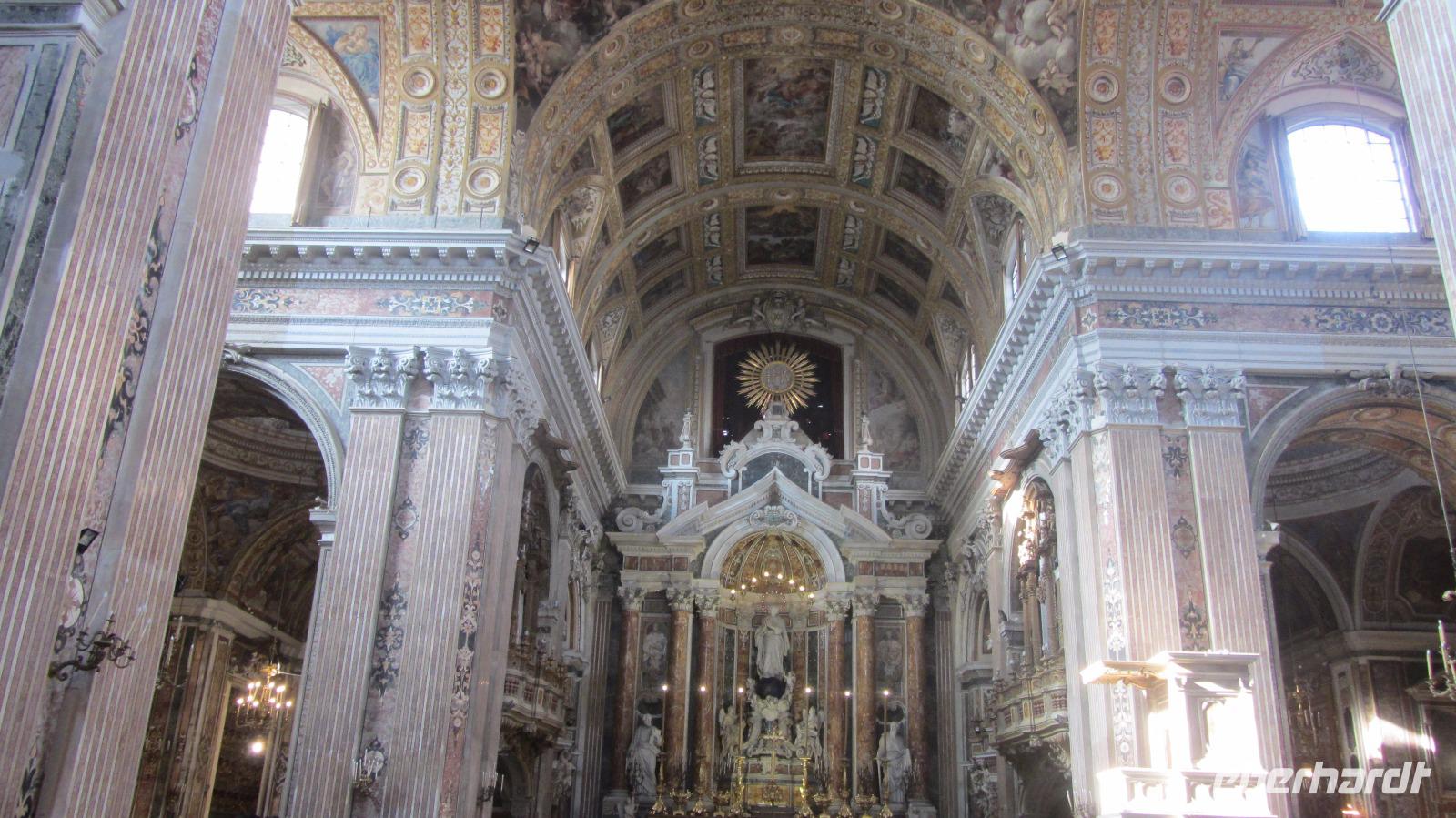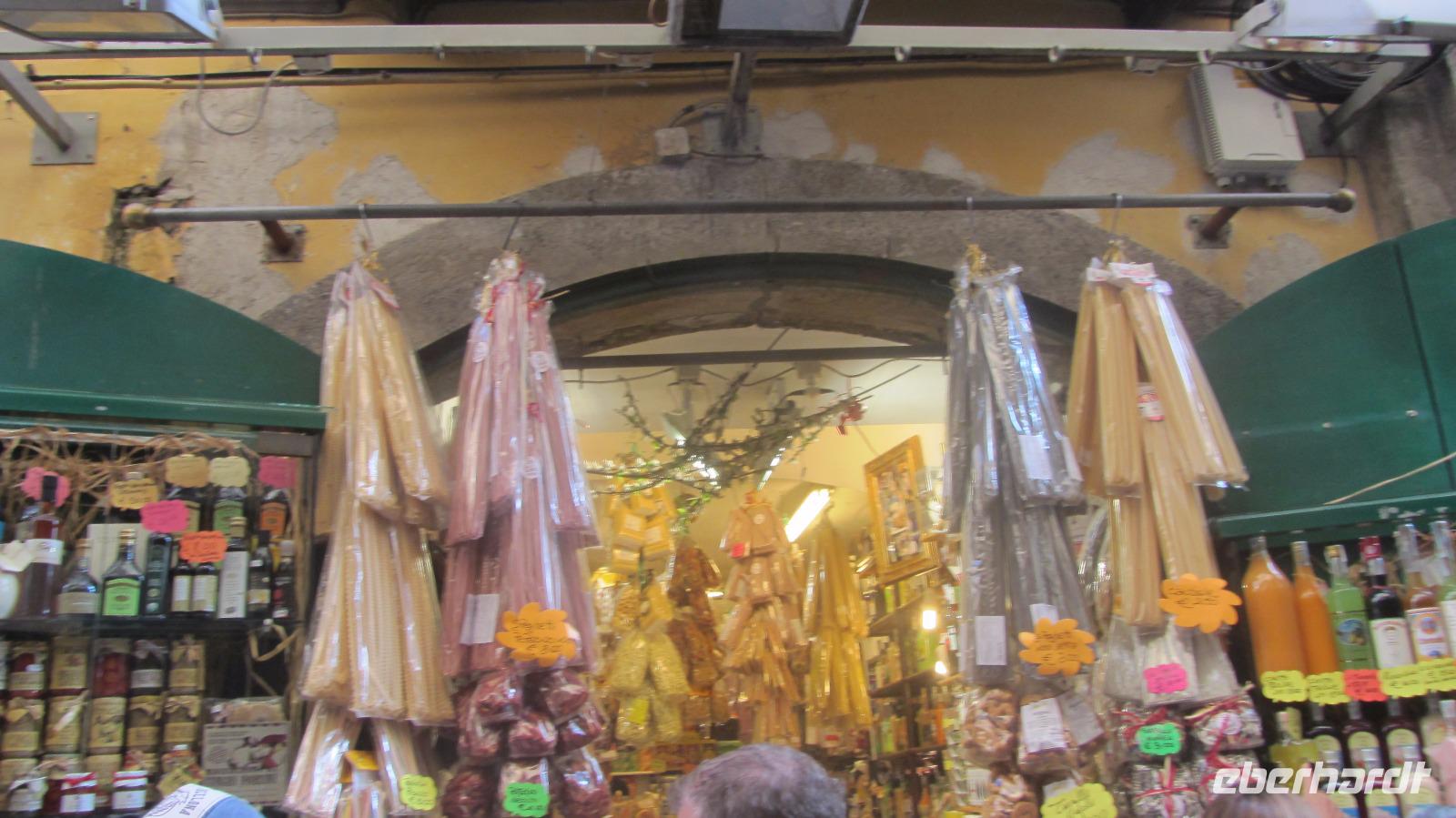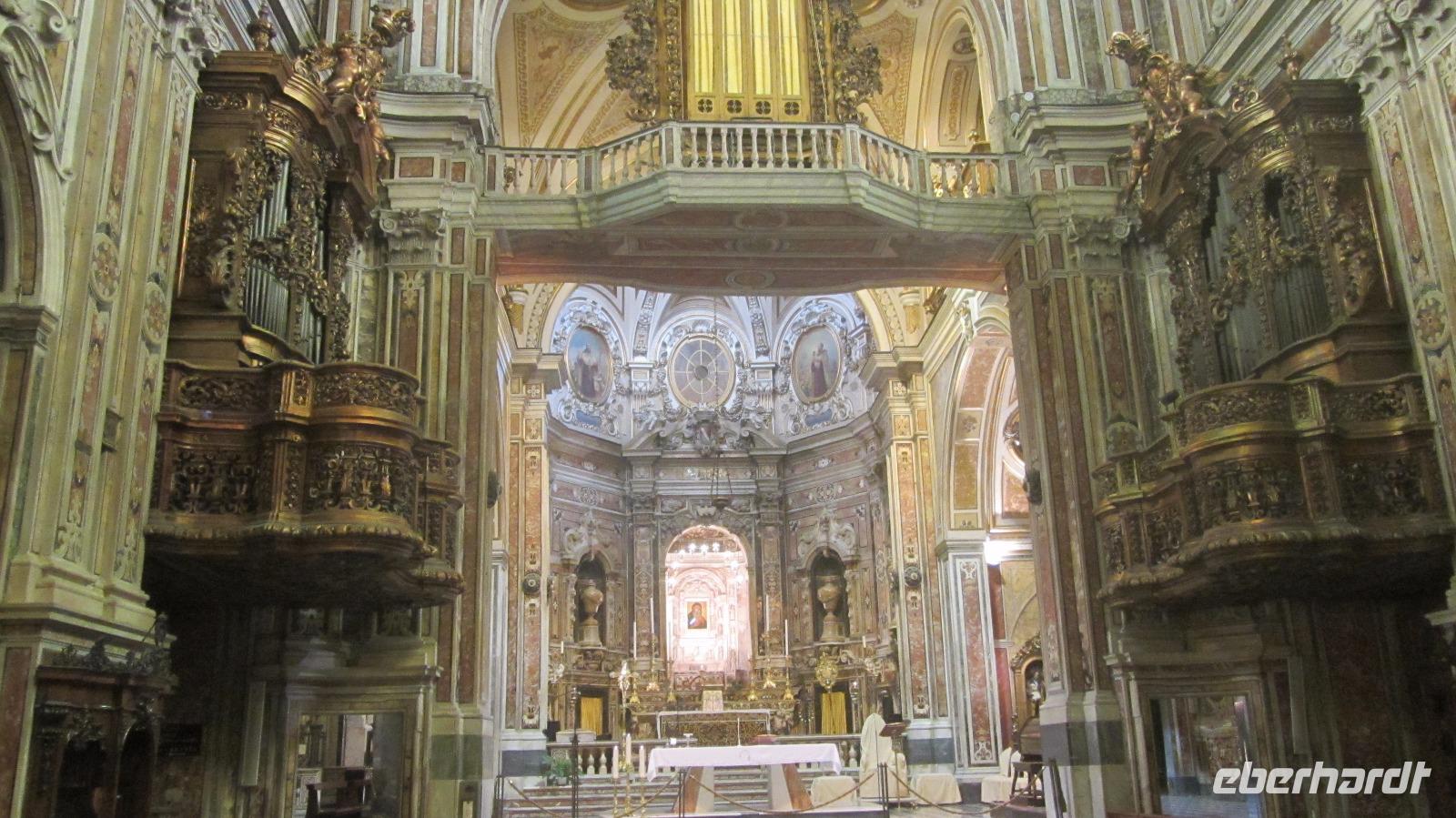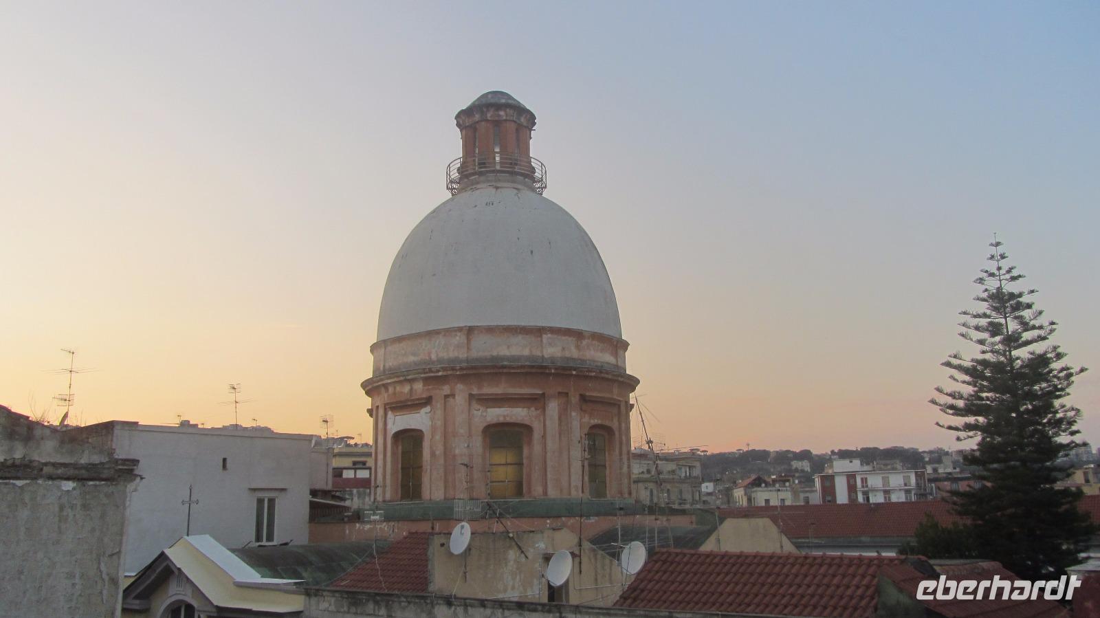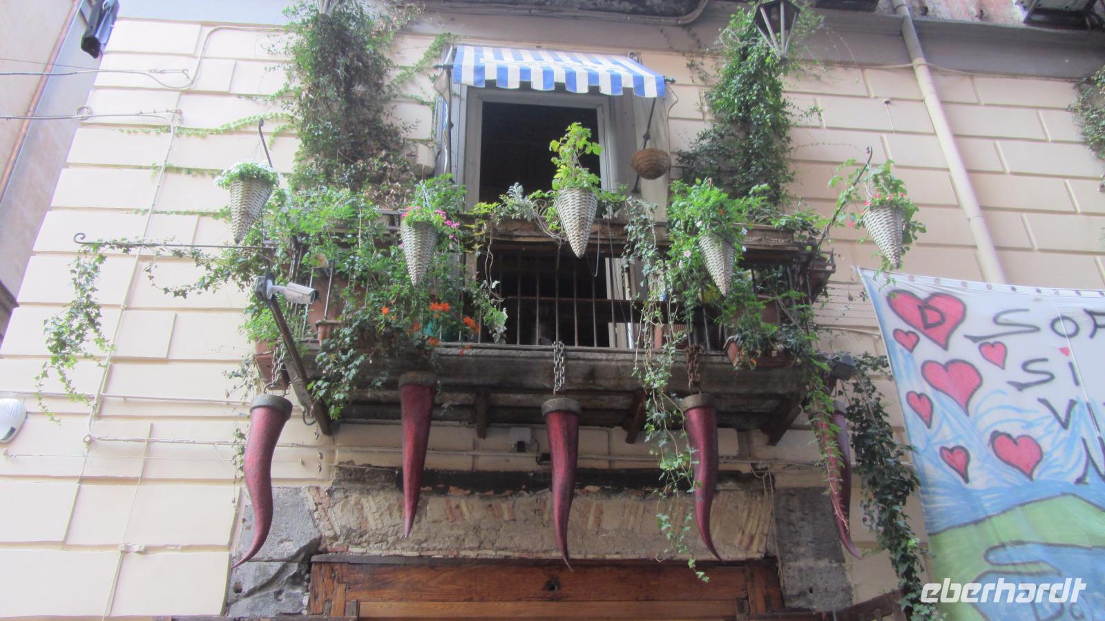 Heute steht die Metropole Neapel auf dem Plan. Wir sind gespannt, was uns erwartet. Wir fahren dieses Mal mit dem Circumvesuviana in Richtung Neapel. Unser Zug startet in Sorrent und bringt uns nach ca. 1 Stunde Fahrt nach Neapel, wo Mathias auf uns wartet. Da heute die Busse und die Metro in Neapel streiken, haben wir kurzfristig einen Bus organisiert, der uns am Vormittag die entfernteren Höhepunkte zeigt. Camillo ist ein besonderer Busfahrer, denn er hat Spaß dabei, uns auch abgelegene Ecken der Stadt zu zeigen und wir fahren durch Gassen, die wir sonst nie sehen würden. Immer wenn er einen Stau sieht, fährt er einfach in eine andere Richtung oder Gasse. Neapel ist die „Stadt, deren Häuser mit Wäscheleinen zusammengehalten werden" heißt ein Sprichwort. Wir sehen diese engen Gassen, wo überall die Wäsche hängt. Mit der Besichtigung starten wir spontan am „hässlichsten" Platz der Stadt und besuchen die Kirche Santa Maria del Carmine auf dem Piazza Mercato. Anschließend fahren wir entlang der Küste mit fantastischen Aussichten und enden am Castello Nuovo. Von der kleinen Insel spazieren wir entlang der Küste bis zum Piazza Plebiscito. Vor dem Königspalast befindet sich nicht nur der berühmteste Platz in Neapel, sondern auch der größte und repräsentativste. Durch das berühmte Café Gambrinus und die berühmte Einkaufspassage Umberto, die auch an das berühmte Mailänder Einkaufscenter erinnert, spazieren wir weiter zum Theaterhaus, was aktuell leider eingerüstet ist und gönnen uns hier einen schnellen Kaffee.