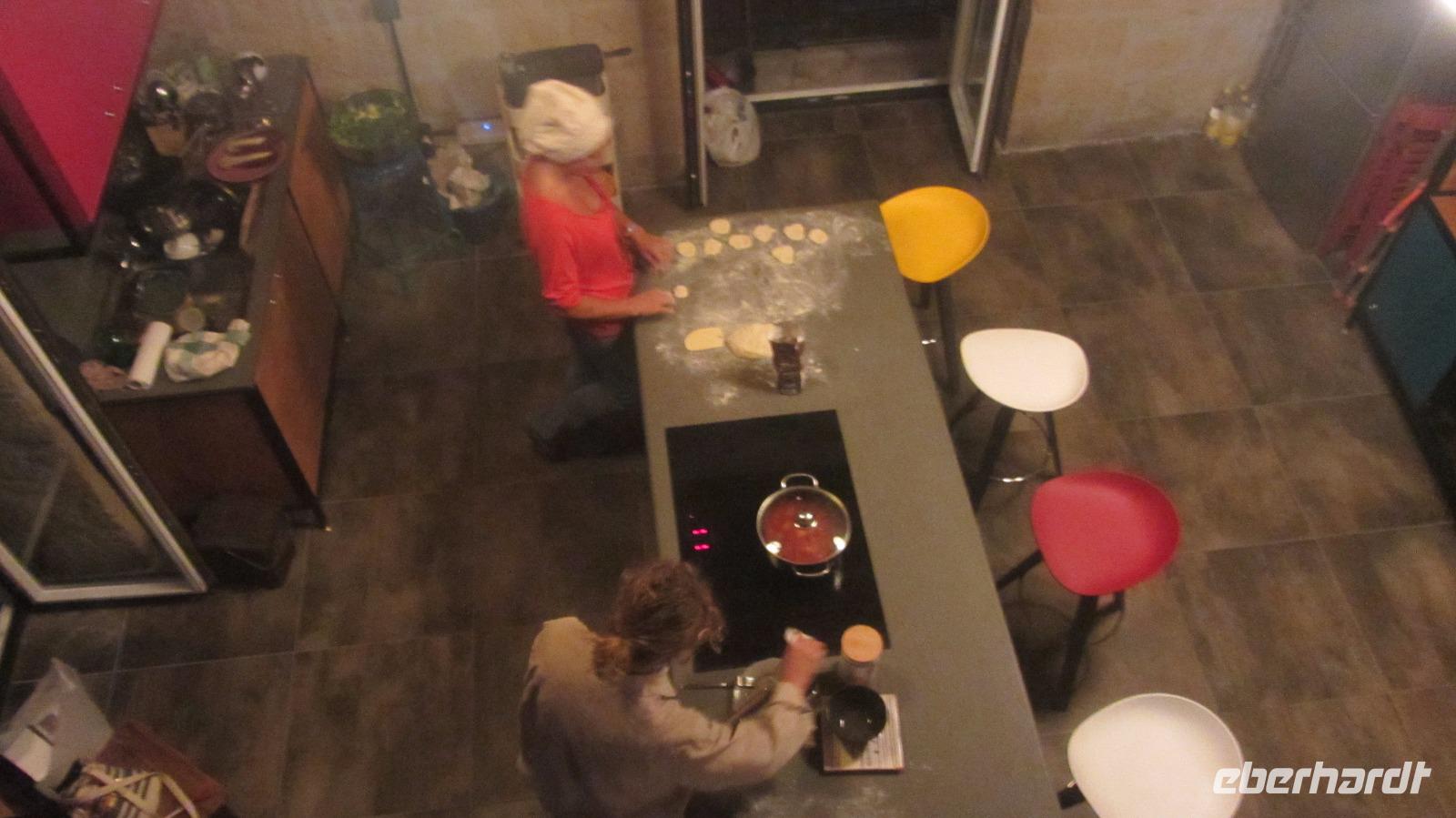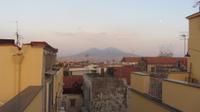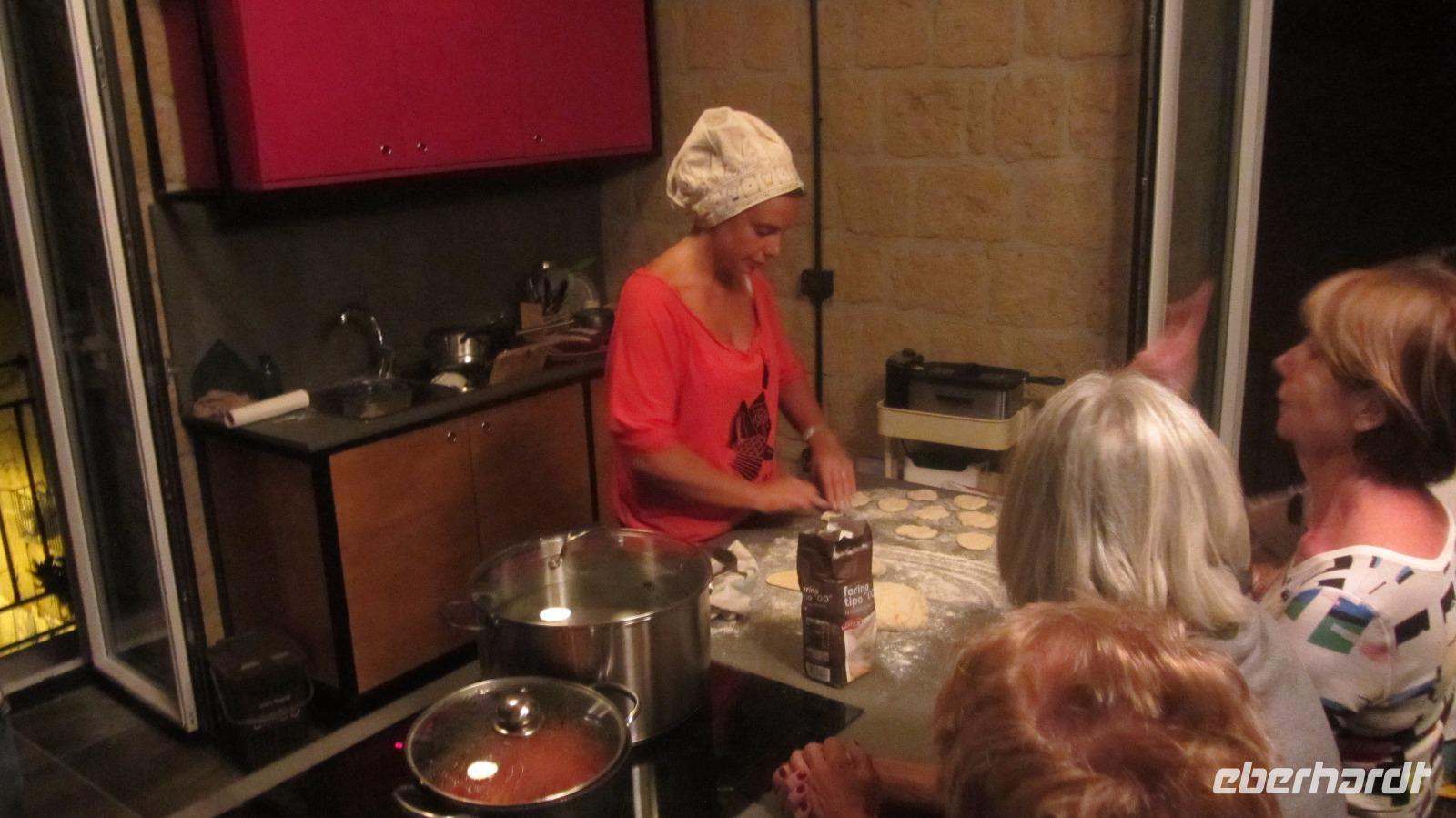 Anschließend holt uns unser Bus wieder ab und wir fahren nun in Richtung Altstadt. Vorbei am Piazza Dante, einem der wichtigsten Plätze der Stadt, spazieren wir durch die Tore zur Altstadt bis zum Piazza Bellini, ein lebhafter kleiner Platz, an dem sich einige Restaurants befinden. Hier machen wir unsere Mittagspause - einige ziehen durch die Stadt, andere gönnen sich eine erholsame Pause, denn nun möchten wir die engen, verwinkelten Gassen der Altstadt erkunden. 1995 wurde die gesamte Altstadt zum UNESCO-Weltkulturerbe erklärt. Gemeinsam mit Mathias spazieren wir durch Galerien, kleine Hotels und immer weiter durch das Gewühl in den Gassen. Wenn man genau hinschaut, fallen so viele liebevoll gestaltete Kleinigkeiten in der Stadt auf. Wir besuchen die Kirchen San Domenico Maggiore, die Basilika di Santa Chiara und die von außen modern aussehende Kirche Gesù Nuovo in Neapel- jede Kirche hat etwas Besonderes zu bieten. Nach einer kleinen Eis-Pause geht es weiter zur so genannten Krippenstraße. Mitten in den Gassen liegt die berühmte Via San Gregorio Armeno. Hier sehen wir wunderschöne Krippenfiguren - handgefertigte Kunstschätze und bunte Plastikfiguren. Neben den traditionellen Figuren von Jesus, Maria und Josef werden auch "typische Charaktere" als Krippenfiguren dargestellt. Überall wird das rote Corno (ähnlich einer Chilli-Schote) verkauft, der typische Glücksbringer aus Neapel. Zum Abschluss sehen wir uns noch die Basilika San Lorenzo Maggiore näher an und bekommen auch einen kleinen Einblick, was sich in Neapel noch unter der Stadt alles befindet. Wir stellen gemeinsam fest, dass ein Wiederkommen auf jeden Fall lohnenswert wäre. Nun ist es aber Zeit, bei unserer heutigen Gast-Familie einzukehren und unser Abendessen zu kochen. Wir besuchen Livio und seine Frau in ihrem Bed&Breakfast Magma. Zuerst nehmen wir unseren Aperitif und eine Vorspeise auf der Dachterrasse ein, von der wir einen herrlichen Blick über die Dächer Neapels und auf den Vesuv genießen. Anschließend lernen wir in gelockerter Atmosphäre wie man Pizza und Gnocchi selbst herstellt. Bei Wein und italienischer Musik macht das zusammen noch viel mehr Spaß. Danach wird natürlich auch alles verkostet. Zum Abschluss genießen wir Limoncello und Kuchen. Ein anstrengender, aber spannender Tag geht mit einem entspannten Abend in netter Gesellschaft zu Ende - die Gruppe ist noch ein Stück näher zusammen gerückt. Müde, aber voller neuer Eindrücke kehren wir zurück in unser Hotel.