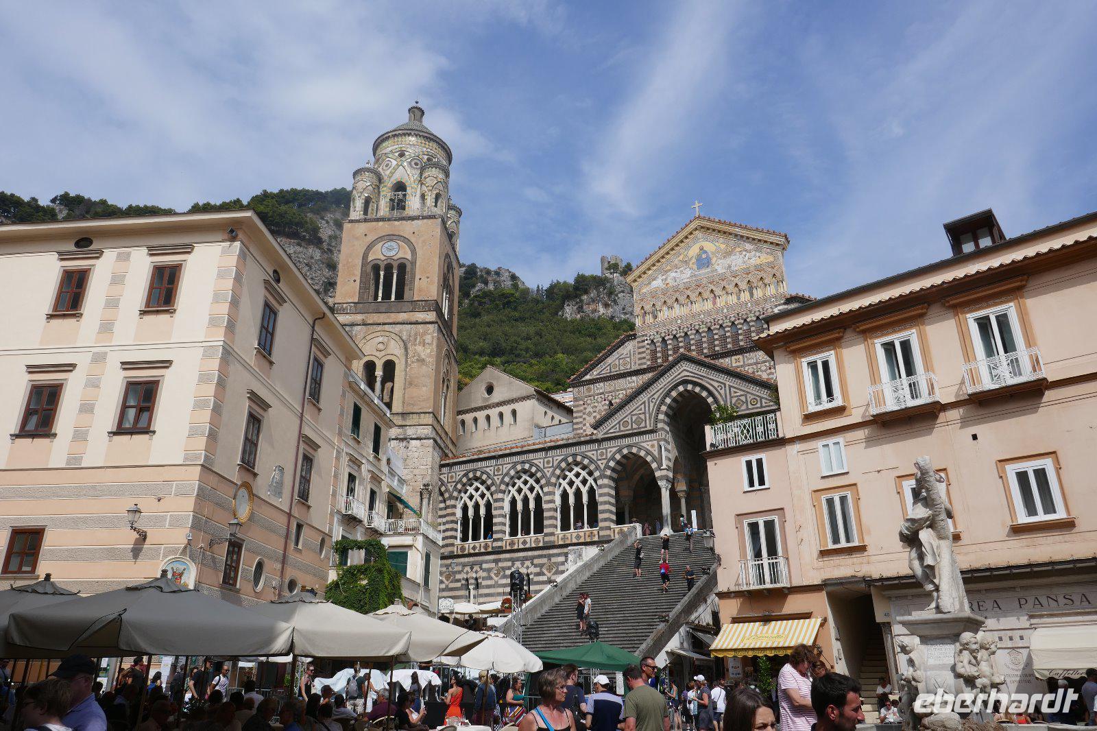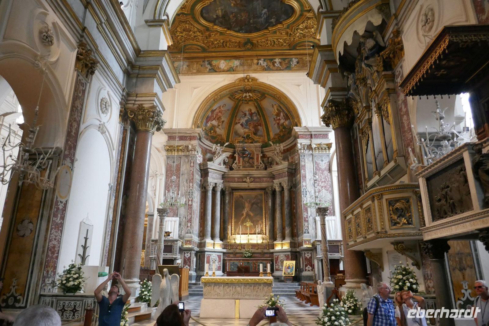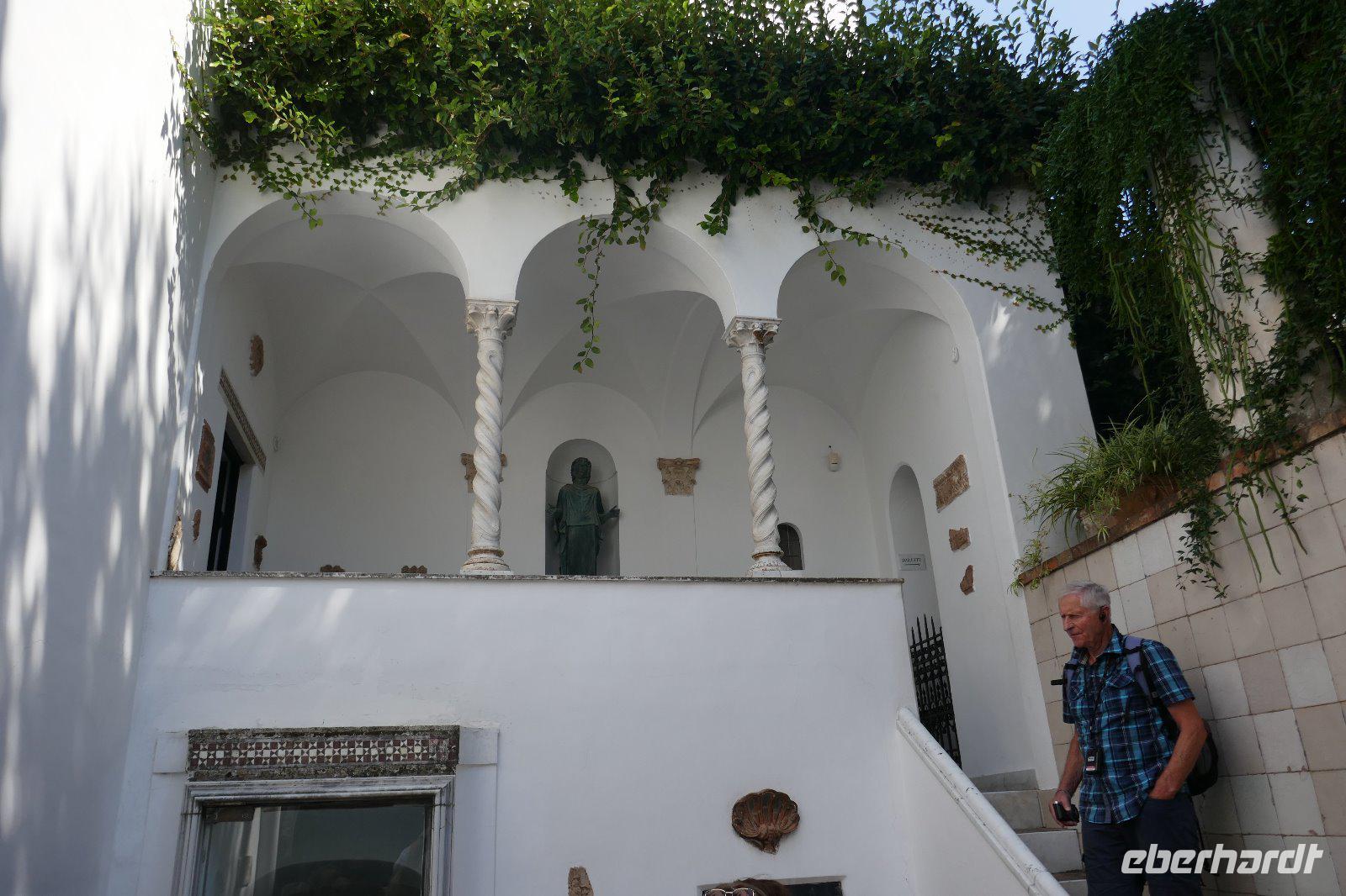 Die Amalfiküste, der Ort wo die Zitronen blühen, sei die schönste Küste der Welt. Unsere Gruppe wollte sich heute selbst ein Bild davon machen. Senkrecht aufragende Felswände am glitzernden Tyrrhenischen Meer. Man hatte das Gefühl zwischen Himmel und dem Abgrund zu sein. Hier wurde in abenteuerlicher Weise eine der schönsten Küstenstraßen gebaut. An jeder Ecke ein interessantes Fotomotiv. Und einige der schönsten Dörfer Italiens scheinen fast wie an den Felsabhängen zu kleben. Positano war unser erster Stopp. Schon John Steinbeck nannte ihn „der einizige senkrechte Ort der Welt". Alle steilen Gassen laufen auf den kleinen Strand zu. Wir schlenderten durch die Gassen Positanos und dann setzten wir die Fahrt mit dem Boot fort. Eine ganz andere Perspektive - Gigantisch wirkt das Felsmasiv, das sogar einen Fjord besitzt. So steuerten wir Amalfi an. Entlang viele Villen bekannter Persönlichkeiten u. Grandhotels, die sich wie eine Perlenschnur entlang der Küste anreihen. Im Gegensatz zu Positano bietet Amalfi einen majestätischen Dom. Mit seiner pinsittoresk-bunten Fassade - ein kunstgeschichtliches Highlight - manifestiert er die Seerepublik Amalfis aus dem 11. Jahrhundert. Eine Besichtigung unter fachkundiger Führung von Esther war ein Erlebnis, besonders die Krypta, in dem die Reliquien des Hl. Andreas liegen. Natürlich durfte die Besichtigung des Papiermuseums nicht fehlen. Hier erfuhren wir viel über die Herstellung geschöpften Papiers. Übrigens der Vatikan bezieht heute noch Papier von der Amalfiküste.Zwischendurch hatte jeder auf auch seine Weise Gelegenheit diesen Ort zu entdecken. So mancher stellte auch fest, dass Schönheit seinen Preis hat. Kurve für Kurve, Serpentine für Serpentine hangelten wir uns dann in entgegengesetzter Richtung zurück zum Hotel. Nun wird dem letzten Bewusst, warum man hier nur mit einem einheimischen Busfahrer unterwegs sein kann. Staus sind auf Strecke manchmal inbegriffen und kostenlos. Geübt und mit der nötigen Gelassenheit umfährt er jede noch so kleine „Klippe". Tourist und andere große Gefährte sind für unseren italienischen Fahrer kein Problem. Am Ende kamen wir nach einem tollen Tag wieder wohlbehalten im Hotel an.
