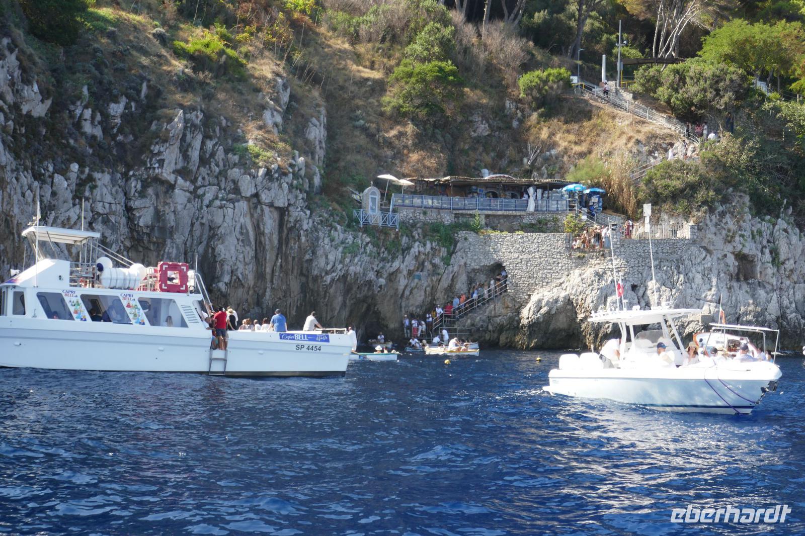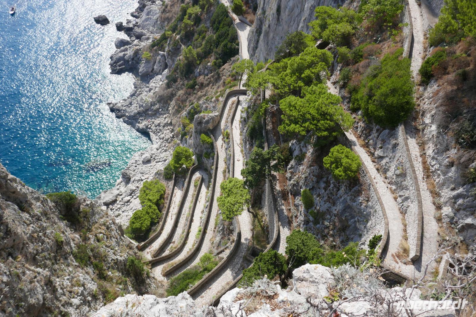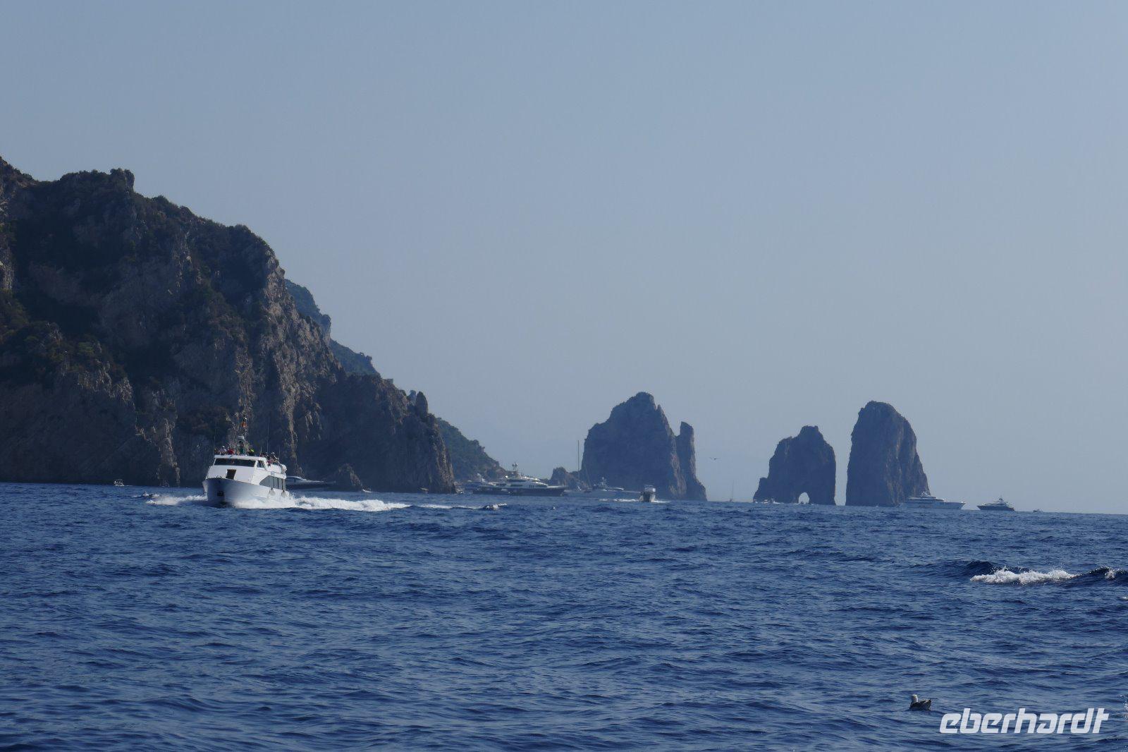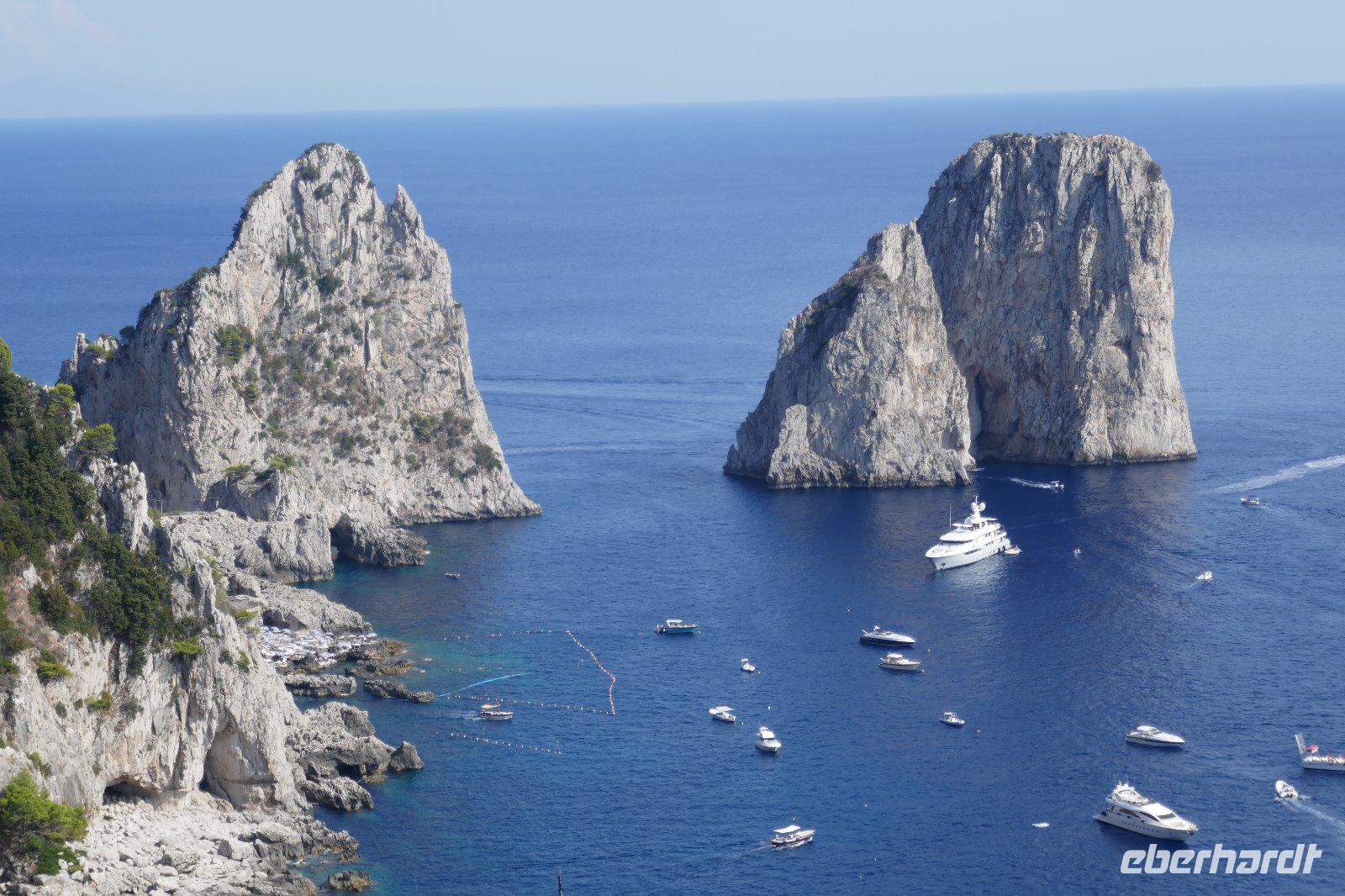 Jeder verbindet mit der Insel Capri etwas anderes. Ob es das Lied ist von der Sonne, die bei Capri rot im Meer versinkt oder einfach nur das Wassereis „Capri-Sonne". Vielleicht kommen auch die vielen Erinnerungen an die Fahrten mit dem Ford-Capri bei diesem Besuch zurück. Unsere Gruppe machte sich jedenfalls heute von Sorrent aus auf, die Insel zu erobern. Mit der Fähre setzt man hinüber und bevor wir dort ankamen hieß es sich einreihen in den Strom der vielen Tagestouristen. Wegen zahlreicher Grotten und dem schönen Blick auf das Meer wird die Insel nicht umsonst auch die Diva des Mittelmeers genannt. Als Einstieg eine Inselrundfahrt. Dabei fehlte natürlich nicht die Blaue Grotte. Von der Ferne erlebten wir diese. Ein Blick auf die bekannte Grotte aus der Fern hat genügt. Viele weitere Grotten und herrliche Motive folgten. Die Liebenden gaben sich einen Kuss bei der Durchfahrt durch den die Faraglioni-Felsen und schon waren wir wieder am Ausgangspunkt.Als nächstes steuerten wir Anacapri an. Nur mit Kleinbussen zu erreichen hatten wir auf der spannenden Fahrt immer wieder schöne Ausblicke aufs Meer. Eine Stelle wird sogar wegen der Enge u. dem sichtbaren Abgrund „Mama Mia" genannt. Am Ziel in Anacapri war es Mittag und Zeit eine Kleinigkeit zu sich zu nehmen. Danach spazierten wir gemeinsam auf der einzigen Straße zur Villa Munthe. Dabei wurde an einem Stand für Limoncello die Köstlichkeit probiert. Gemeinsam besichtigten wir das Haus und den Garten Munthes, der einer der schönsten in Italien ist. Danach brachten uns die Kleinbusse nach Capri zurück, wo wir entlang edler Geschäfte zu den Augustusgärten spazierten. Noch einen Blick auf die Straße, die Krupp bauen ließ und dann hieß es nach einer ausgiebigen Freizeit Abschied nehmen von Capri, der Diva des Mittelmeers und es ging wieder zurück zum Festland nach Sorrento. Das Versinken der roten Sonne live über Capri erlebten wir in tollen Rotschattierungen. Ein schöner Ausflugstag mit vielen Eindrücken ging zu Ende.