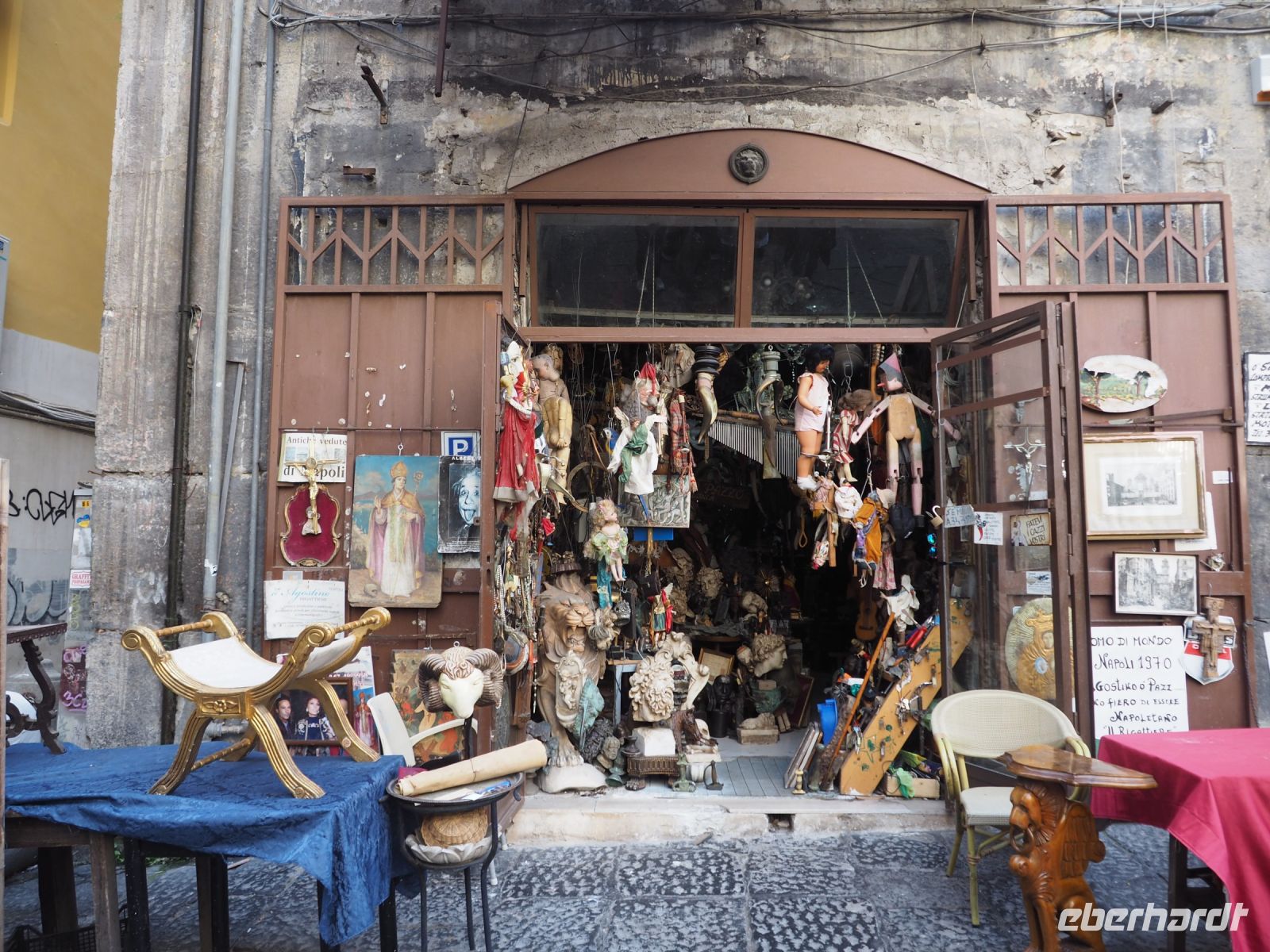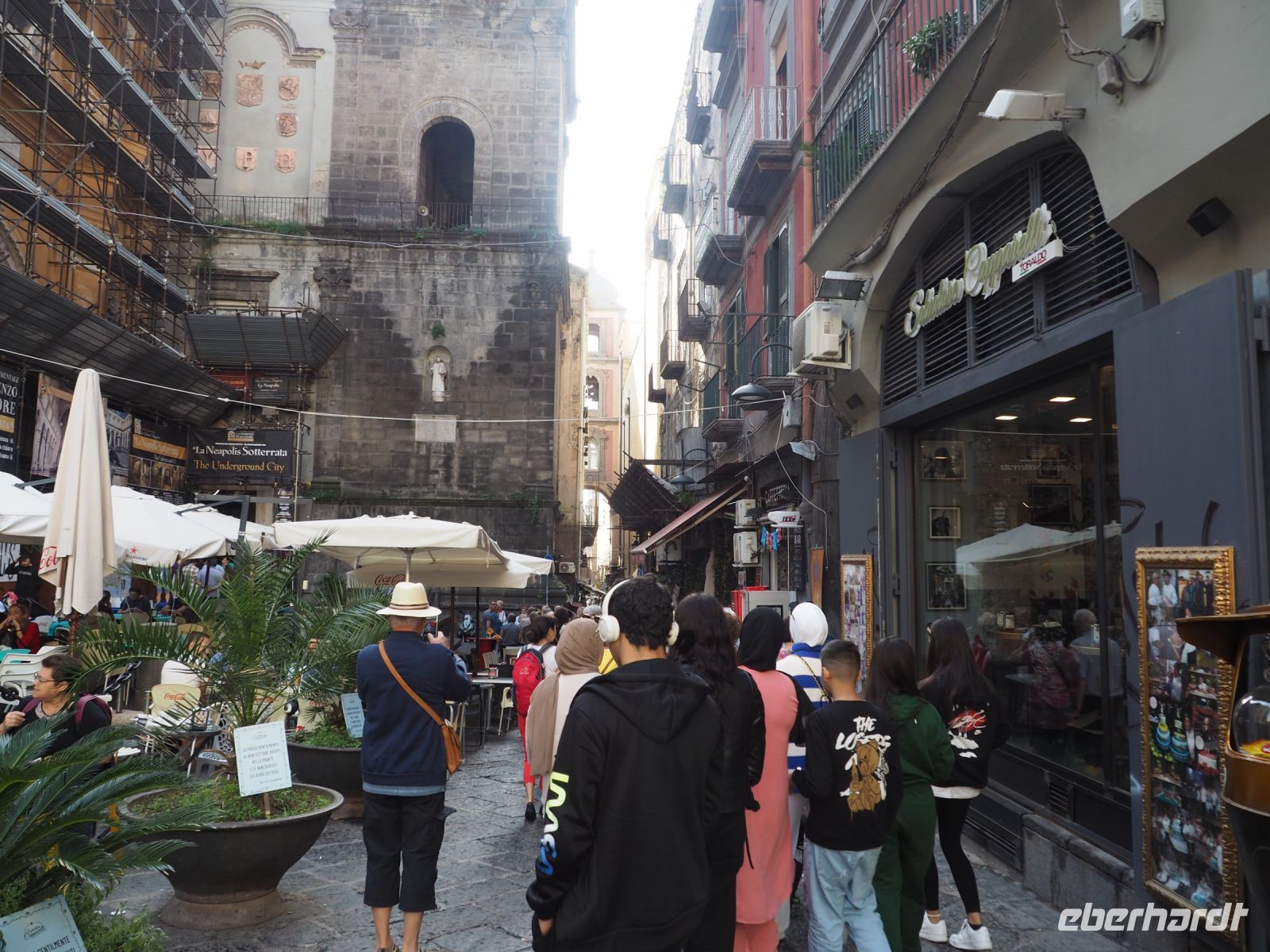 In den engen Gassen der neapolitanischen Altstadt kommt man aus dem Staunen nicht mehr heraus! Kleine Lädchen und Geschäfte, in denen nicht nur die Waren des alltäglichen Lebens angeboten werden, sondern auch das eine oder andere Souvenir, viele Menschen und dazwischen immer wieder schöne Plätze mit Cafés und mächtigen Kirchen.