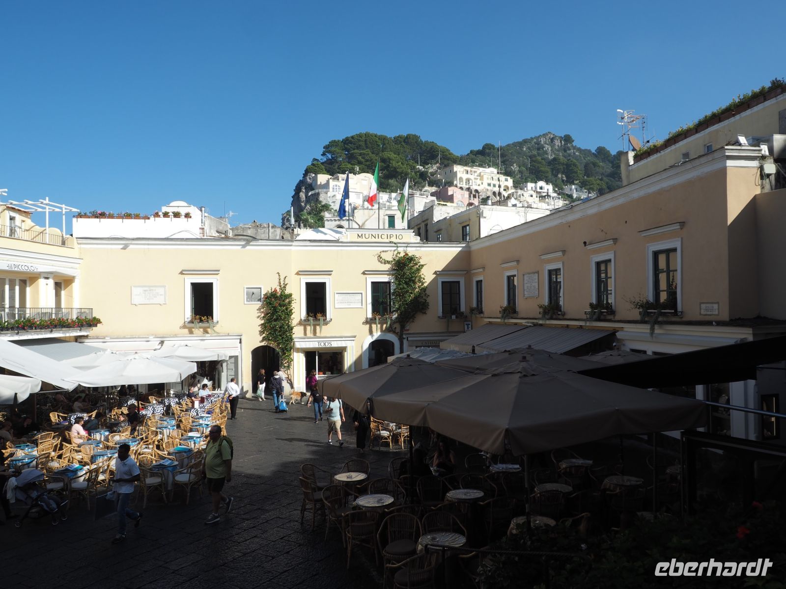 Nachdem das Schiff an der Marina Grande angelegt hatte, ging es sogleich mit ei-nem der kleinen Inselbusse hinauf ins Städtchen Capri. Dort wollte die ‚Piazzetta‘, das Wohnzimmer Capris, erkundet werden. Es erwartete uns auch ein kleiner Spaziergang durch die pittoresken Gassen bis zu den Augustusgärten.