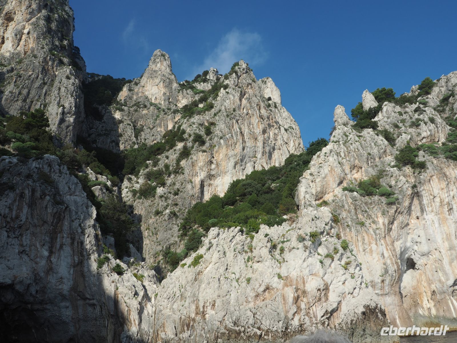 Mit einem Inselbus ging es nun hinunter, direkt an die Marina Grande, von wo aus wir eine Rundfahrt mit einem Schiff starteten. Ein unvergleichliches Erlebnis, einmal rund um Capri herum! Viele Höhlen und Grotten konnte man vom Boot aus erspähen, überragt von hohen Felsen, die von dichter grüner Vegetation bewachsen waren. Auf diesem kleinen Fleckchen Erde, Capri, gibt es eine unglaublich große Vielfalt an Pflanzen und Blumen.