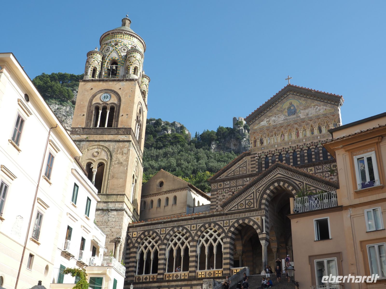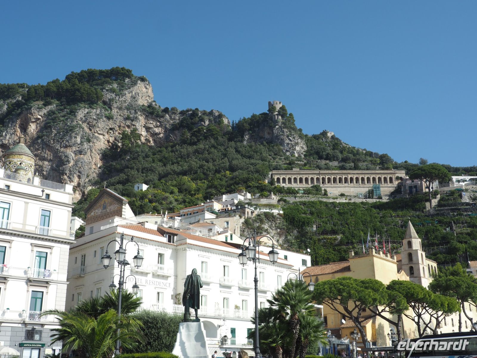 Nach einem Fotostopp erreichten wir Amalfi, das einmal eine mächtige Seerepublik gewesen ist. Durch Handel mit dem Orient sind seine Einwohner reich geworden. Die Herstellung von Papier war einmal ganz wichtig gewesen. Noch heute existiert das so genannte Mühlental. Nur von den einstigen Mühlen ist heute nicht mehr viel übrig.