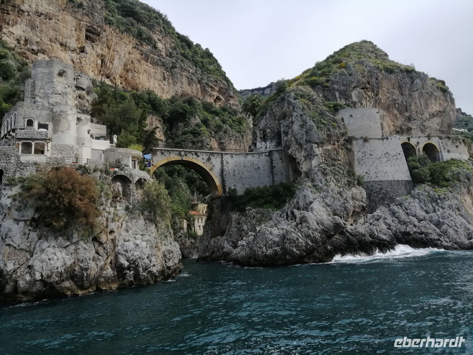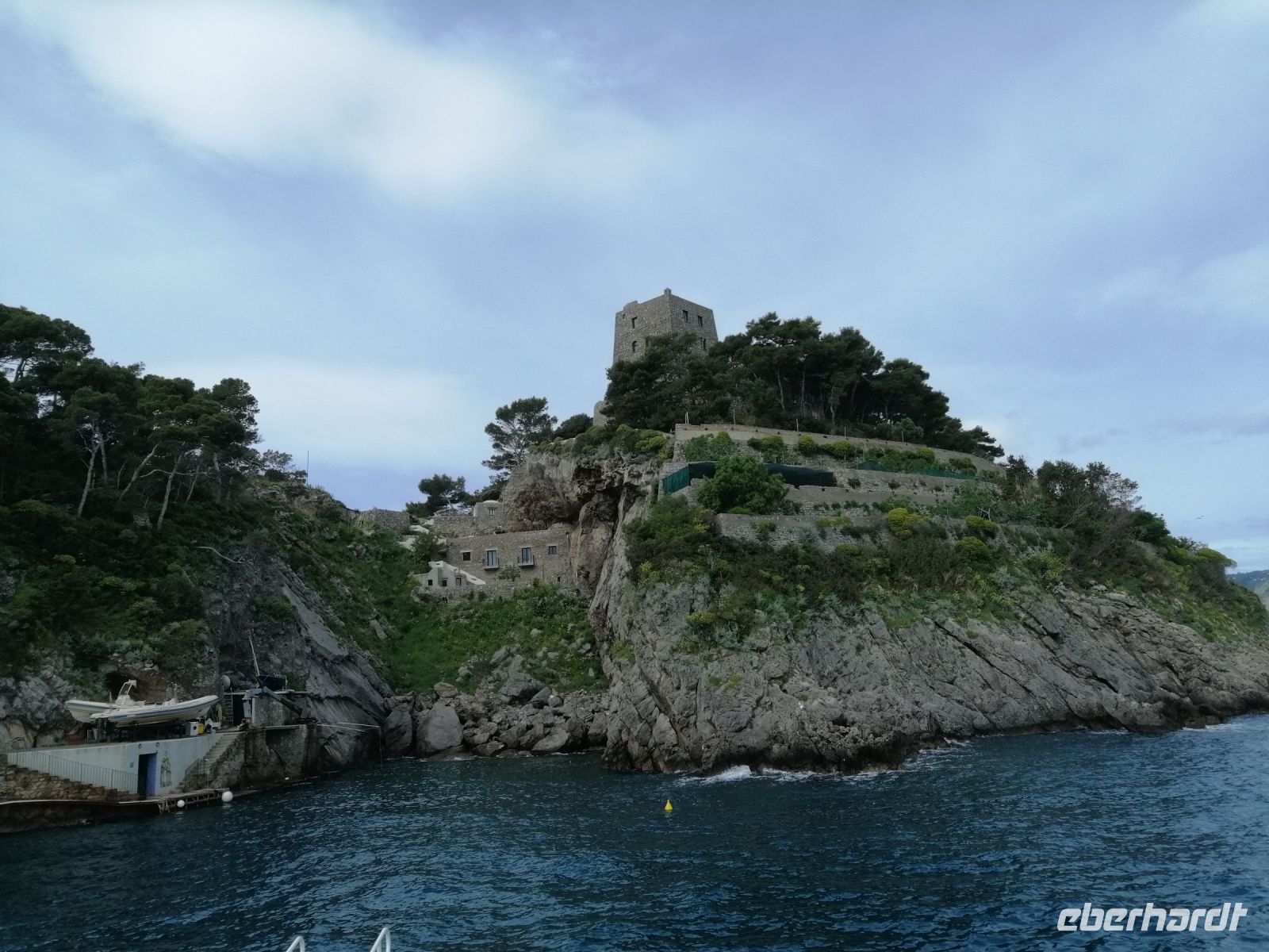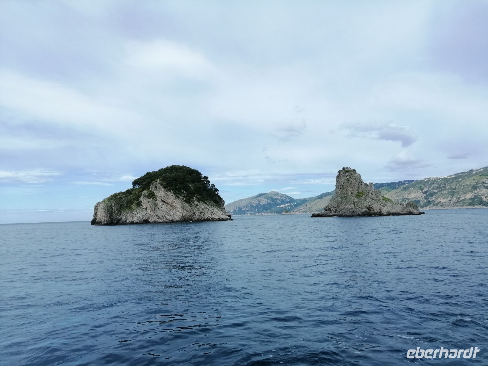 Heute steht der Ausflug mit einem Schiff nach Amalfi auf dem Programm! Ich teilte an alle Reisegäste die Audiogeräte aus und wir trafen uns im Hotel mit unserer heutigen Fremdenführerin Luciana und spazierten zum Hafen von Sorrent. Ein bisschen Sorgen wegen dem Regenwetter hatten wir am Anfang schon: denn es nieselte sogar ein wenig vor sich hin. Mit einem fast extra für uns gecharterten kleineren Bott, starteten wir unseren Schiffsausflug gegen 9 Uhr Richtung Amalfi. Mit einem kurzen Zwischenstopp im Fischerdorf Marina di Puolo, wo noch viele andere Passagiere eingestiegen sind, mit wunderschönen Aussichten sowohl Richtung Capri aber auch Richtung Küste, erreichten wir gegen 9:40 Uhr Punta Campanella – das äußerste Ende der Halbinsel von Sorrent. Wir fuhren an der kleinen, unbewohnten Insel Scoglio Vetara vorbei und unser Kapitän gab uns immer wieder die Möglichkeit in Ruhe ein paar gute Fotos zu machen, indem er sein Schiff um 360 Grad drehte. Auch Luciana versorgte uns während der Fahrt mit spannenden Informationen zu den Sachen, die wir gerade sahen. Besonders maistätisch präsentierten sich die drei Inseln: La Castelluccia, La Rotonda und Gallo Lungo. Auf der letzten Insel, die von oben wie ein Delfin aussieht und mit dem russischen Choreografen und Tänzer Leonid Massine zusammen hängt, befindet sich momentan ein Luxus-Hotel. Es gibt sogar eine spezielle Anlage, die Süßwasser für das Hotel produziert, frisches Gemüse wird im eigenen Gemüsegarten geerntet, der inzwischen mehr als hundert Jahre alt ist. Das Inseltrio wird oft als „Les Sirenuse“ von Einheimischen bezeichnet – und zwar, weil die felsigen Außenposten angeblich die Sirenen beherbergten. Es hieß, dass die Inseln für viele Bootsunglücke verantwortlich seien, weil die Sirenen die Seemänner verzauberten und ihre Schiffe zum Kentern brachten.