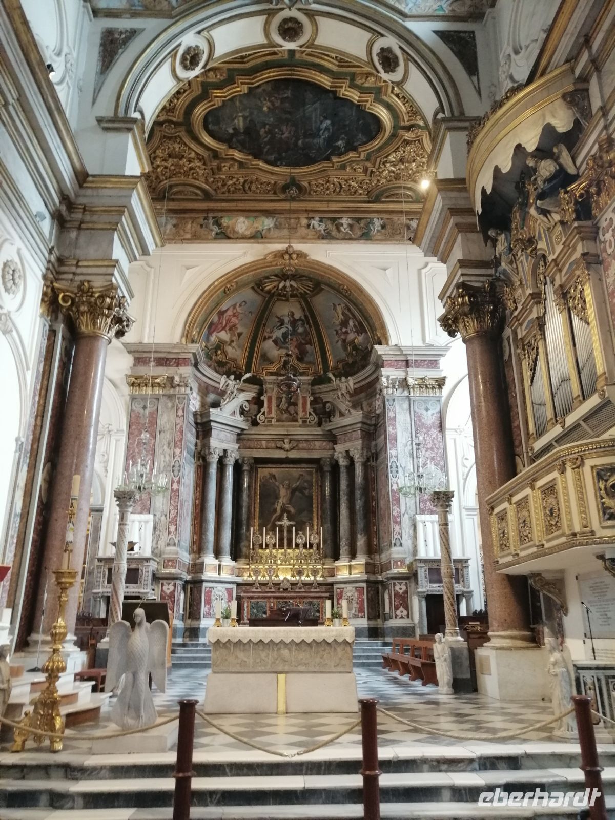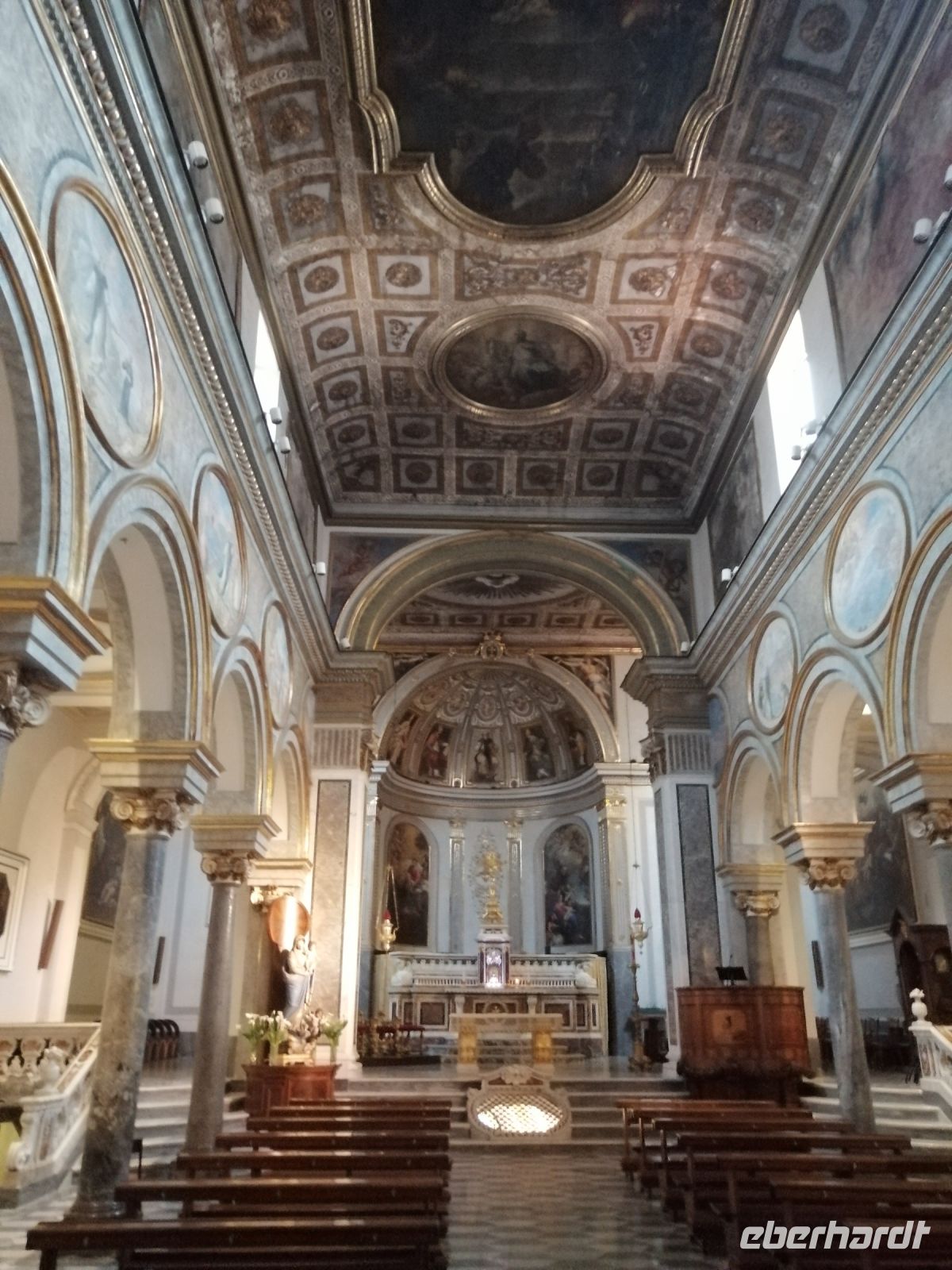 Wie spazierten an der Sedil Dominova vorbei, die im 14. Jahrhundert erbaut wurde, um Streitigkeiten zwischen Adligen zu schlichten und später zum Sitz der Società Operaia di Mutuo Soccorso wurde. Anschließend besichtigten wir die prächtige Kathedrale von Sorrent (Dom) und erfuhren von Laura, dass die Kathedrale im 11. Jahrhundert erbaut und ursprünglich eine ziemlich kleine Kirche war und erst später, im frühen 15. Jahrhundert im romantischen Stil, von dem Erzbischof Falangola umgebaut und erheblich vergrößert wurde. Sie repräsentiert mehrere verschiedene Epochen in der Geschichte von Italiens Kunst und Architektur.