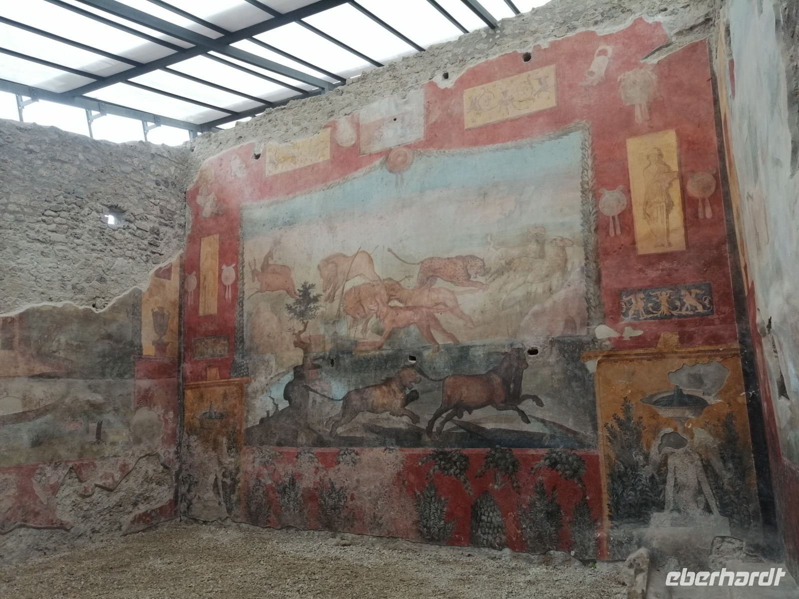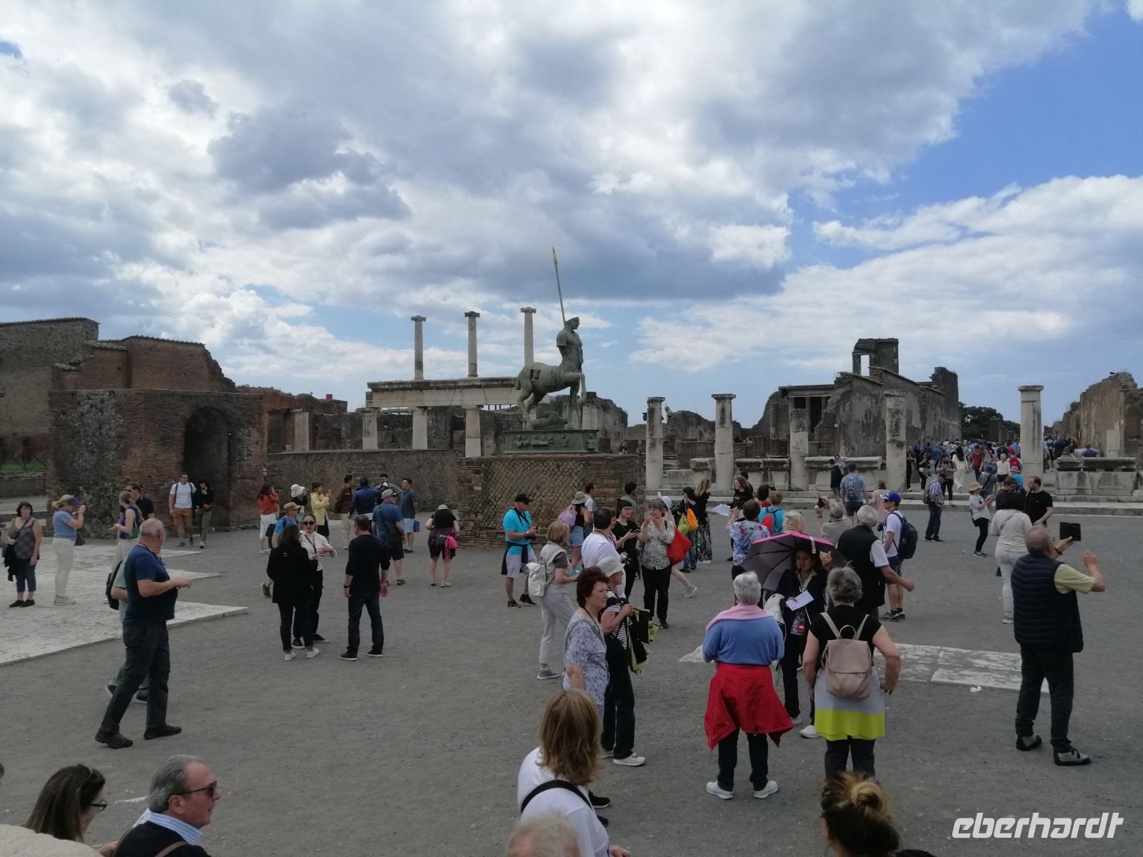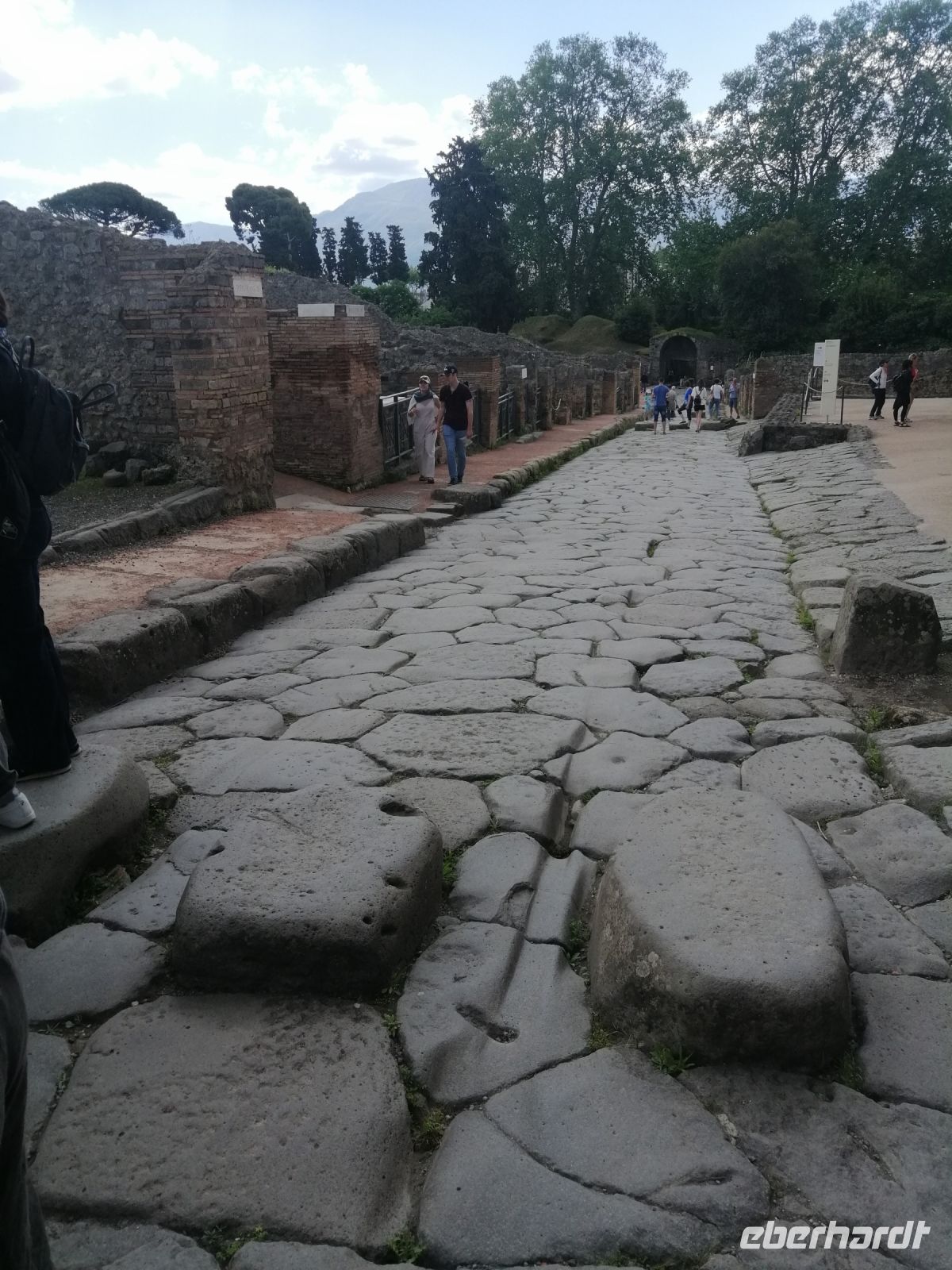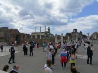 Nach dem Frühstück im Hotel starteten wir unseren heutigen Ausflug nach Pompej mit dem kleinen Reisebus. Unser heutige Busfahrer Antonio begrüßte die Reisegäste mit der lustigen Audioaufnahme mit der weiblichen Stimme, was sofort für gute Laune im Bus sorgte! Auf dem Busparkplatz in Pompej trafen wir uns mit der neuen Fremdenführerin Laura, die ab heute uns mehrere Tage begleiten wird. Die Besichtigung des Freilichtmuseums von Pompej starteten wir im Theaterviertel. Die Laura erzählte uns, dass die Zuschauerränge in drei Abschnitte unterteilt wurden: der unterste Abschnitt (der Ima genannt), war Senatoren, Richtern und anderen Adligen vorbehalten, im mittleren Abschnitt (Medien genannt), saß die Mittelschicht und der oberste (der Summa genannt), war den Plebejern vorbehalten. Anschließend spazierten wir entlang der tiefen, mit großen Kopfsteinpflastern befestigten Straße Richtung des Hauses von Menader (Casa del Menandro) und besuchten es. Laura erzählte uns, dass es sich bei dem Haus in Bezug auf Architektur, Dekoration und Inhalt um eines der reichsten und prächtigsten Häuser im antiken Pompej handelt. Das Haus umfasst fast 1.800 qm und wurde Ende der 20-er Jahre ausgegraben. Die alten Fresken und der Garten begeisterten uns sehr. Gleich danach besuchten wir das Wohnhauses der Familie Ceii (Casa die Ceii), das sich gegenüber befand. Während des weiteren Rundgangs durch die antike Stadt spazierten wir nicht nur entlang der Vicolo del Citanista, sondern schauten uns eine antike Bäckerei an, ein öffentliches Badehaus und ein Bordell (Lupanare) an. Auf dem Forum von Pompej informierte uns die Laura welche Rolle dieser Hauptplatz der Stadt in der damaligen Zeit spielte und ein Zentrum der Aktivitäten war. Sehr beeindruckt waren wir von den ausgegrabenen Leichen, die man heute als Gipsfiguren in der Nähe des Forums in einer Schauvitrine anschauen kann.