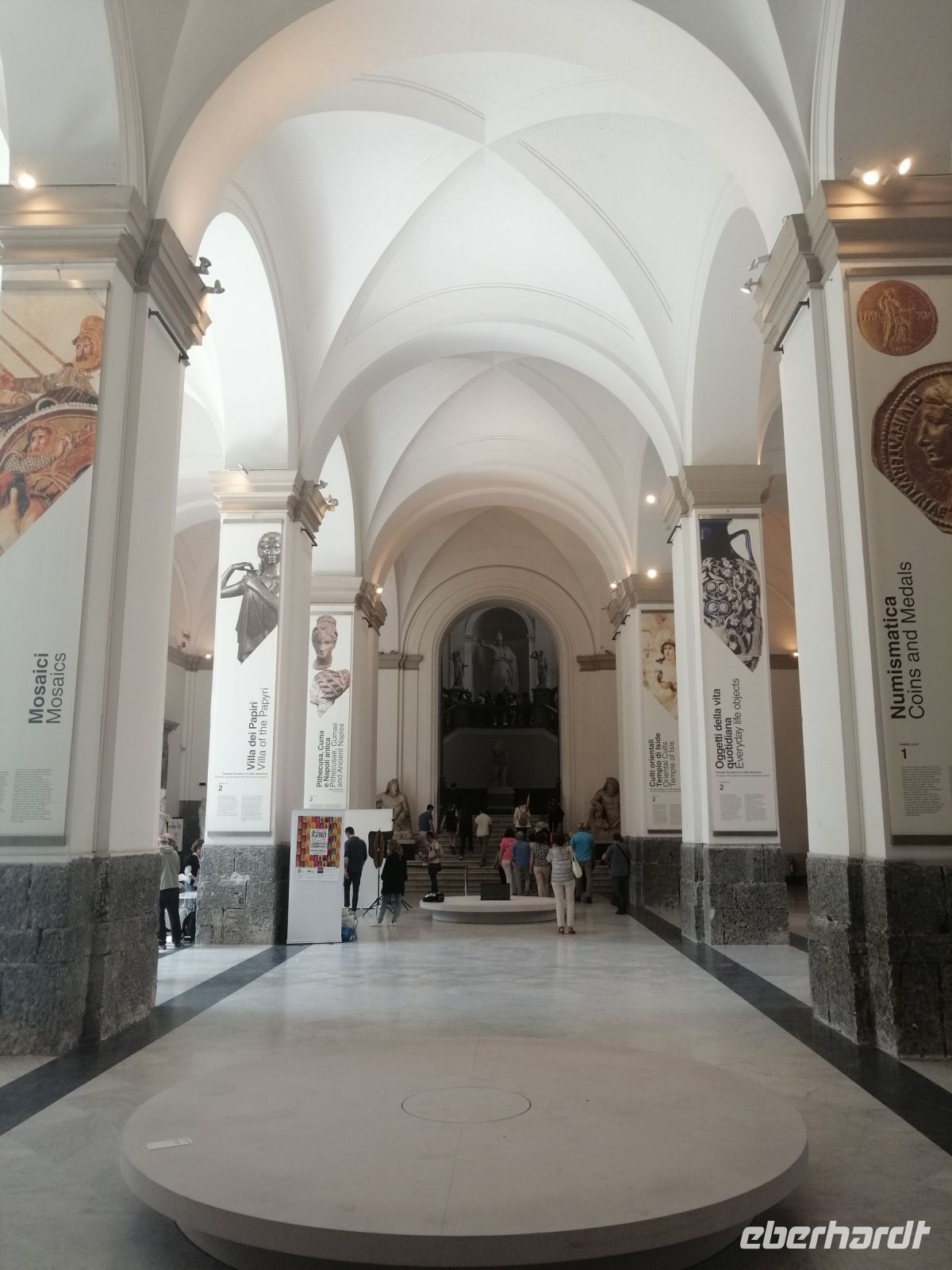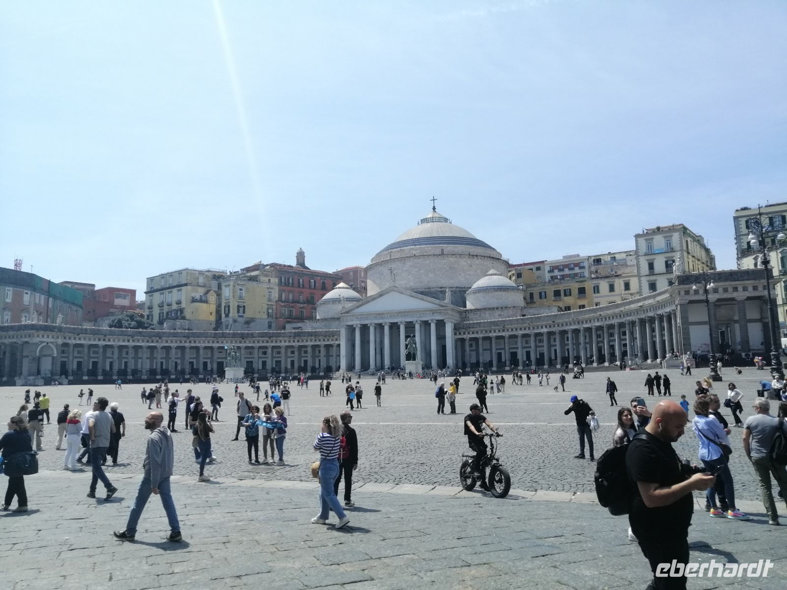 Anschließend besichtigten wir die Basilika Santa Chiara und erfuhren von der Laura, dass es sich dabei um ein Klosterkomplex mit einem wunderschönen Kreuzgang handelt. Die Kirche ist Grablege von neapolitanischen Königen aus den beiden kapetingischen Dynastien Haus Anjou und Haus Bourbon-Sizilien. Danach ging unsere Stadtrundgang an der Kirche del Gesu-Nuovo vorbei und wir erreichten Via Guantai Nuovi in der Neustadt von Neapel. Von dort aus gings es Richtung Hafen, wo hinter der vielen Baustellen große Kreuzfahrtschiffe maistätisch im Hafen parkten. Rechts davon bewunderten wir die sogenannte neue Burg auch Castel Nuovo genannt – eine massive Festungsanlage der Stadt Neapel. Laura informierte uns, dass die Burg wohl zu den bekanntesten Bauwerken von Neapel gehört und fast 800 Jahre alt ist. Die nächste Sehenswürdigkeit von Neapel begeisterte uns nicht weniger als Castel Nuovo: die Galerie Umberto I. Laura erzählte uns, dass diese Einkaufspassage die erste der Welt ist und zwischen den 1887 und 1890 geplant und errichtet wurde. Besonders beeindruckend wirkte die große Glaskuppel aber auch die prachtvollen Innenfassaden der Gebäude! Anschließend spazierten wir am Plazzo Reale – dem großen Platz vom Königspalast. Laura erzählte uns, dass hier sich bis Mitte des 19. Jh. eine Residenz der Königshauses Bourbon-Sizilien und bis Ende des zweiten Weltkrieges eine Residenz des Hauses Savoyen befanden.