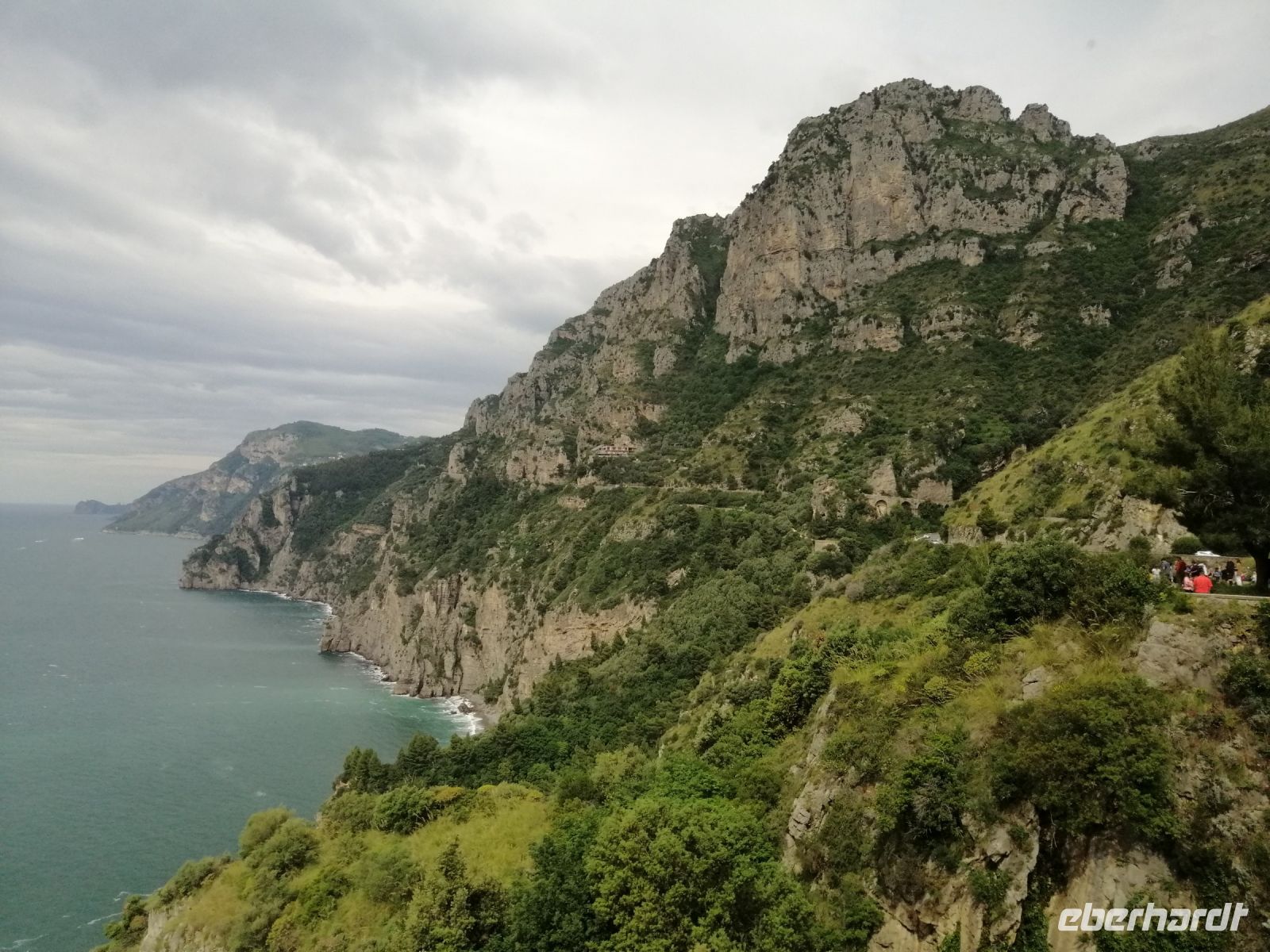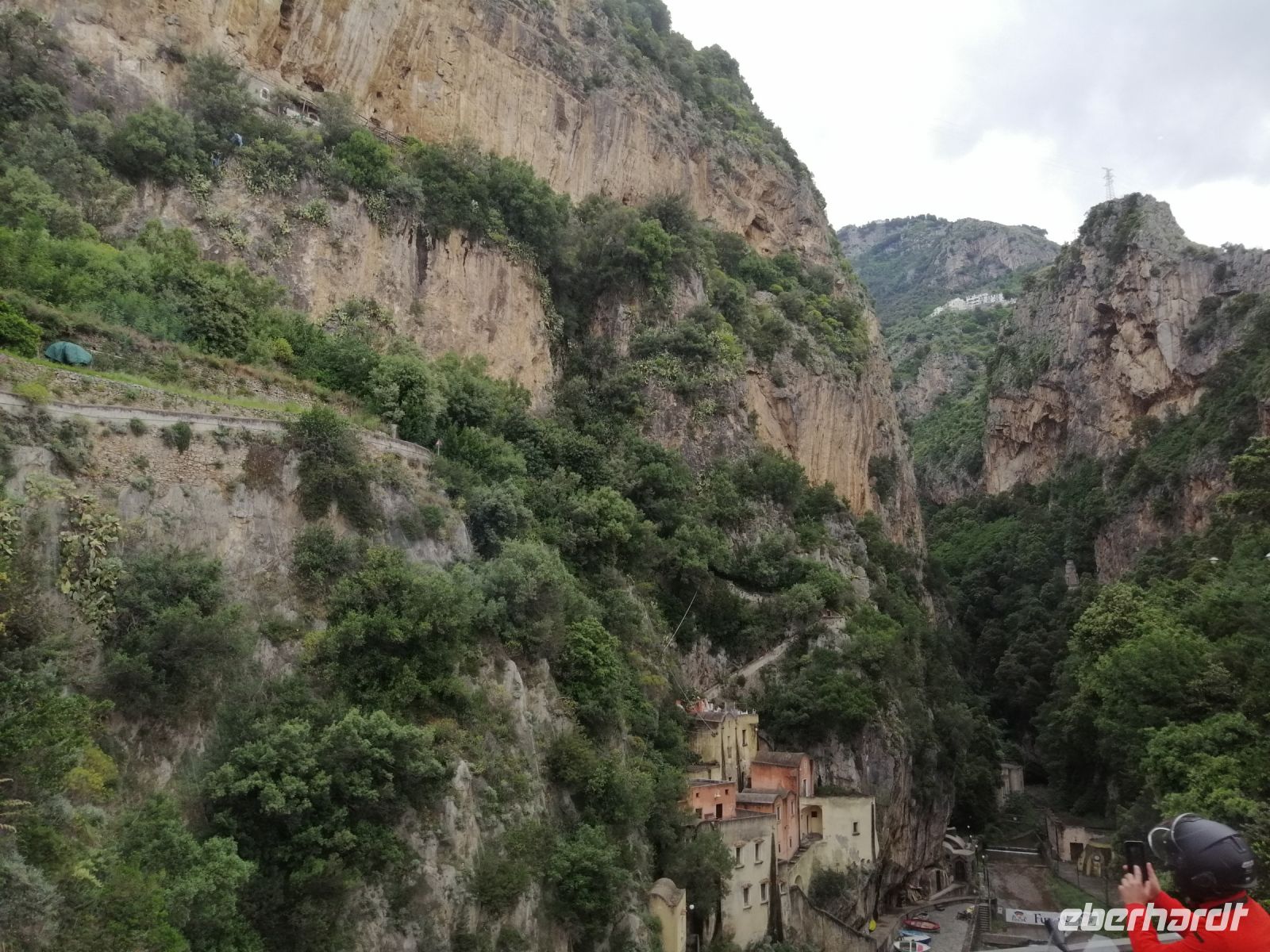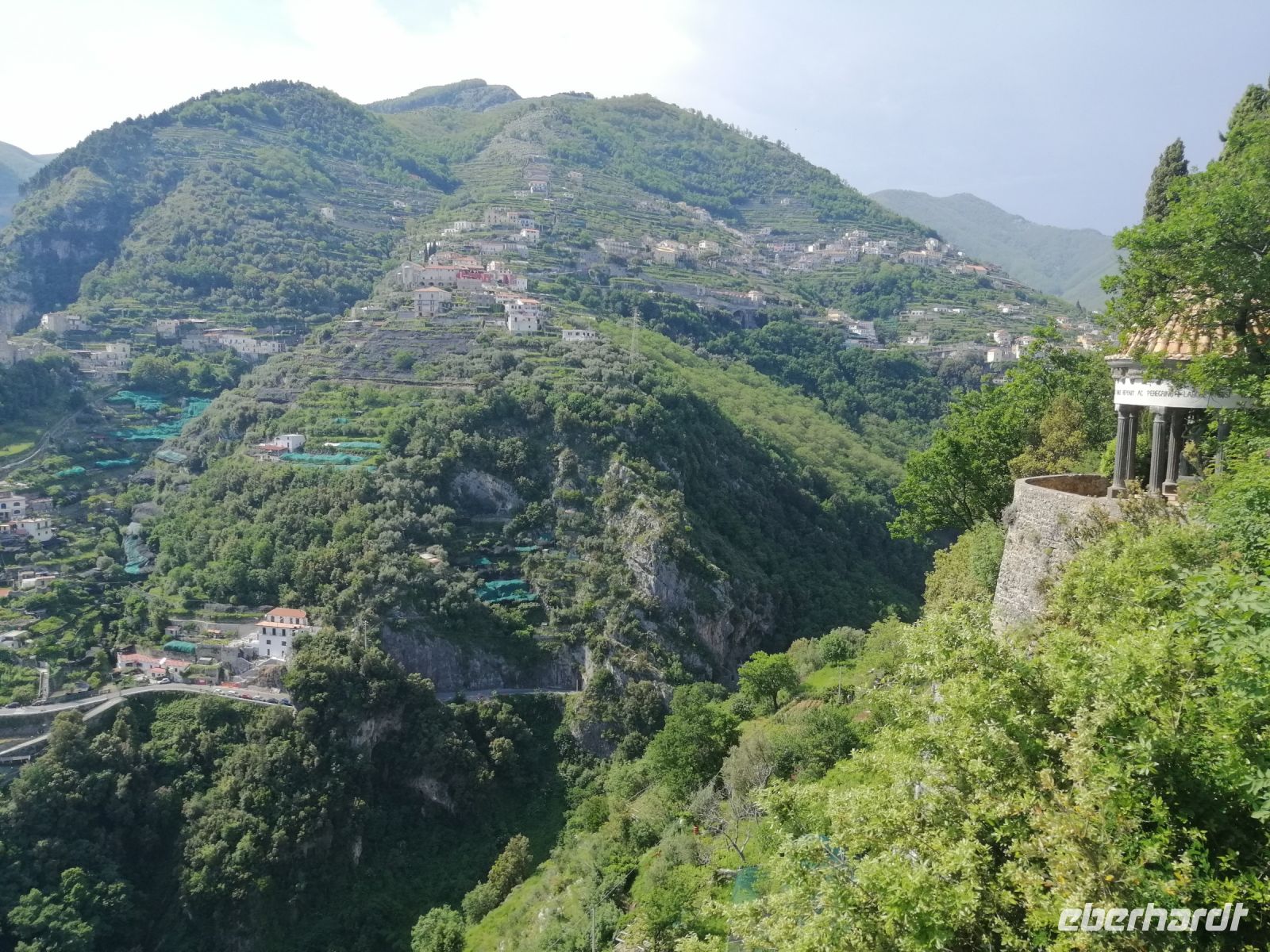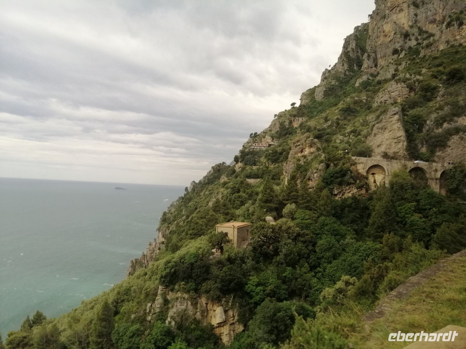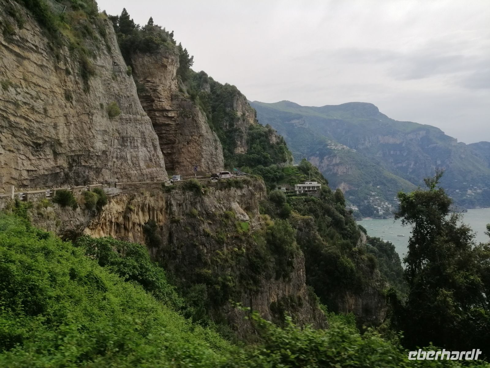 Gleich nach dem Frühstück werden 4 Reisegäste und ich in der Villa Carmelo von unserem Busfahrer Ciro mit unseren Koffern abgeholt und wir fuhren zum Haupthotel Villa Albani und holten die anderen Reisegäste dort ab. Anschließend fuhren wir nach Meta, wo wir unsere Fremdenführerin Laura abholten und die Fahrt entlang der Amalfitana starteten. Schon beim ersten Fotostopp stellten wir fest, wie wunderschön die Gegend ist und gerade der Blick Richtung Sorrent machte uns auf die Amalfiküste sehr neugierig. Wir fuhren an San Pietro vorbei und als wir die Küste erreichten erzählte uns Laura über die gegenüberliegende Sirenen-Insel Gallo Lungo. Übersetzt heißt es der lange Hahn aber die Insel sieht eher einem Delphin ähnlich: mit einem Hahn hat es nichts zu tun – sagte die Laura! Und nun konnten wir uns von der Schönheit der Bergstraße entlang der Amalfiküste selbst überzeugen: die dahinschwebende Straße zählt nämlich zu den schönsten Straßen der Welt.