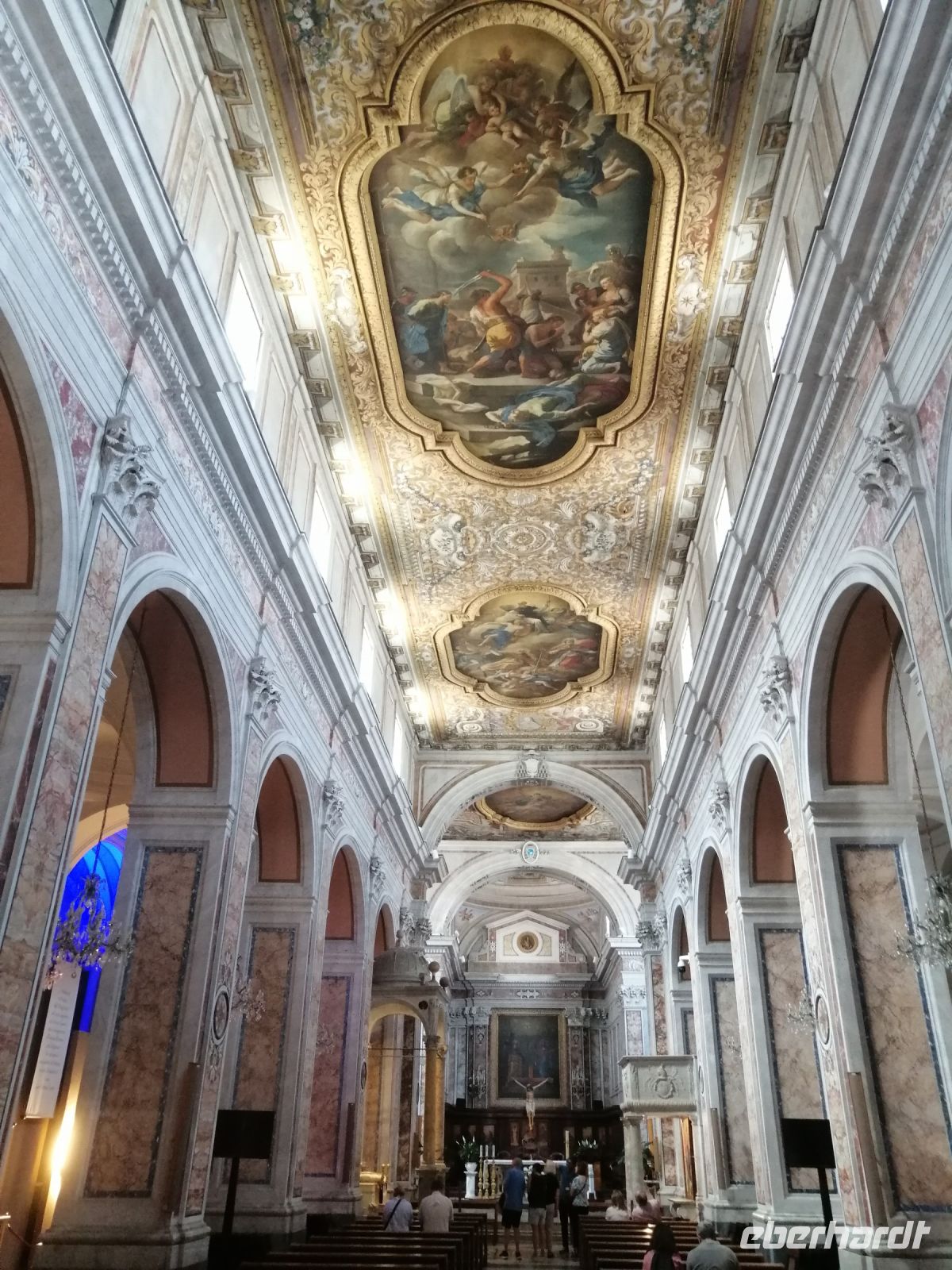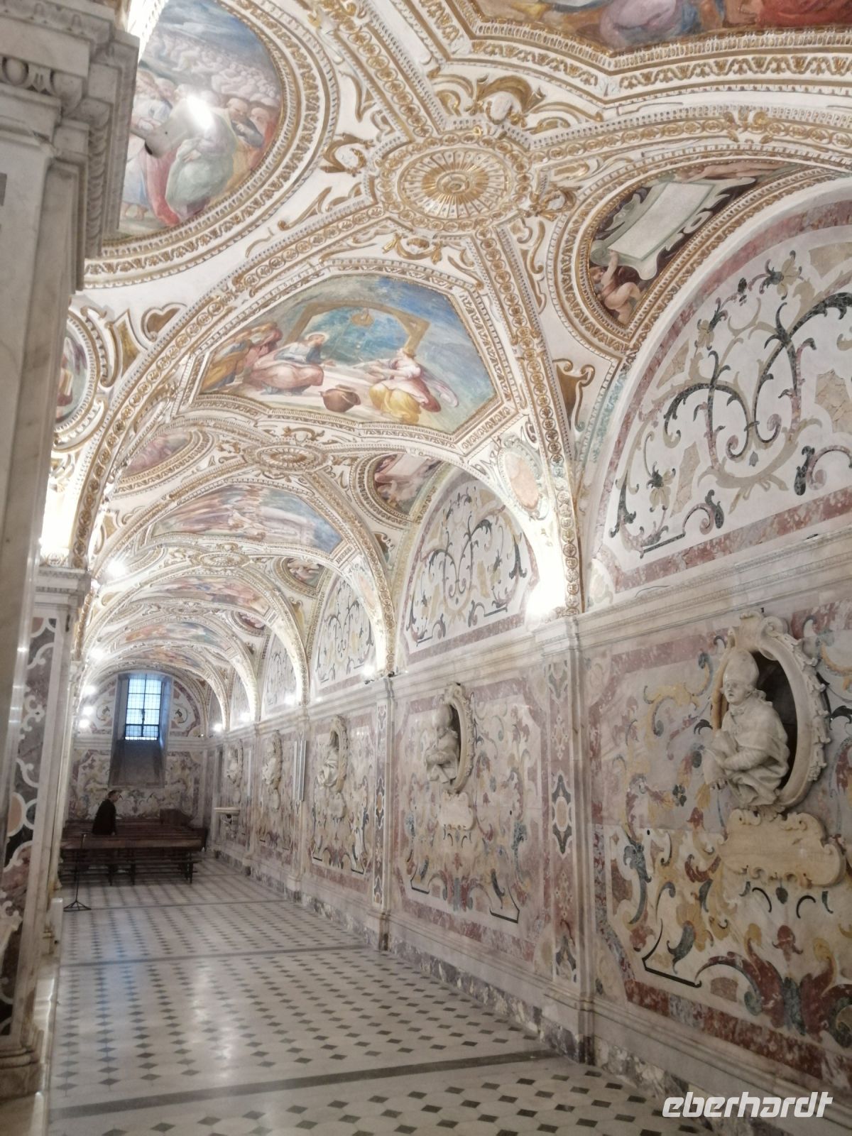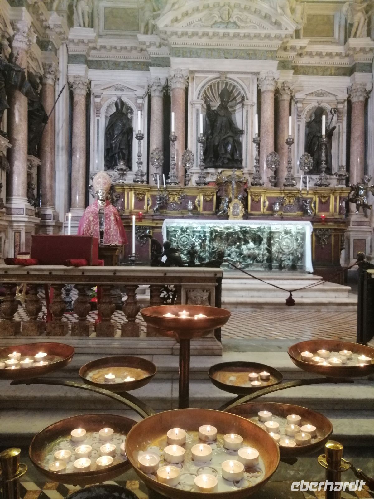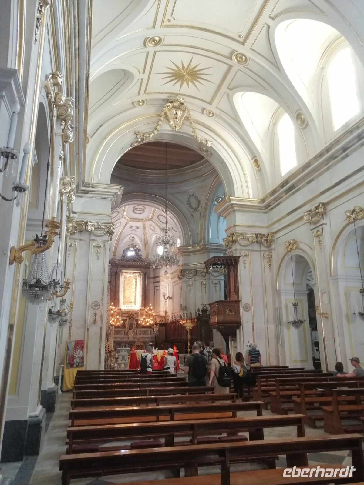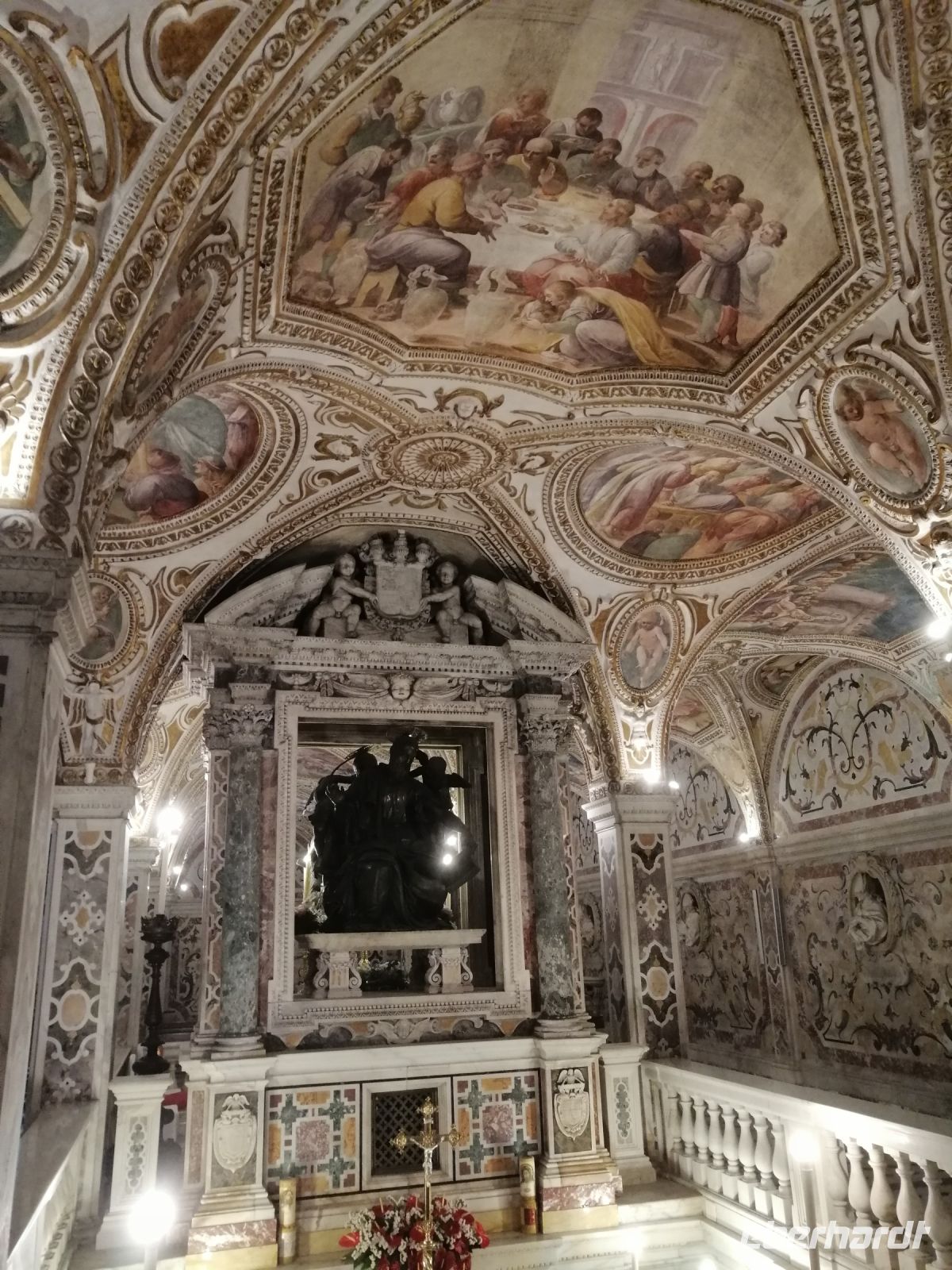 Gegen 11:30 Uhr trafen wir uns wieder und fuhren mit unserem Reisebus zur Altstadt und spazierten zum Dom von Neapel. Daniela führte uns durch diese prachtvolle Kathedrale, die der Himmelfahrt Maria gewidmet ist und informierte uns über den Schutzpatron San Gennaro, dessen Knochen und Blut im Dom als Reliquien aufbewahrt werden. Der Legende nach starb er während der Christenverfolgung durch Diokletian als Märtyrer. Anschließend unternahmen wir einen Stadtrundgang durch die Gassen der Altstadt von Neapel, tauchten in das Treiben der Straßenhändler und Musikanten ein. Und jeder Reisegast hat als Erinnerung einen neapolitanischen Cornicello erhalten: ein Glückshorn, das schon immer dazu benutzt wird, um sich vor dem bösen Blick und negativen Einflüssen zu schützen.
