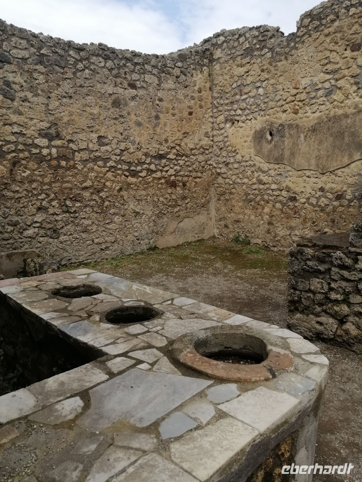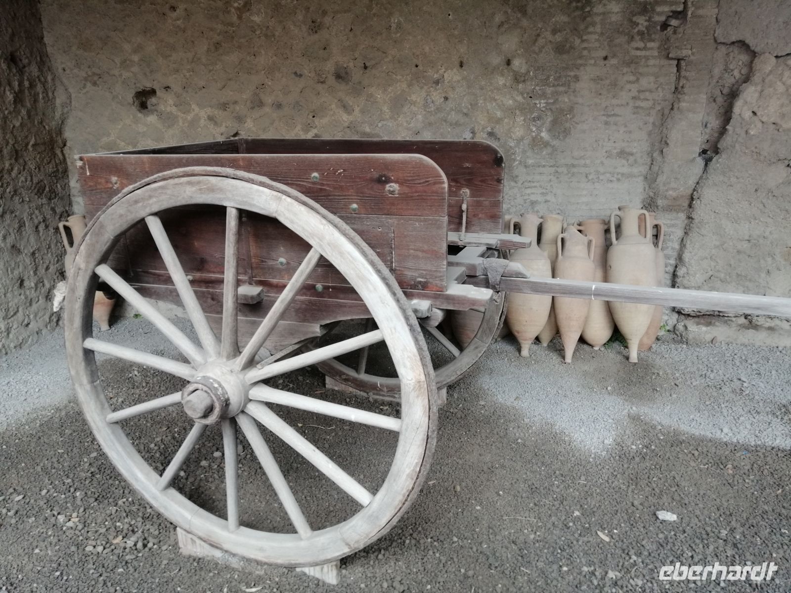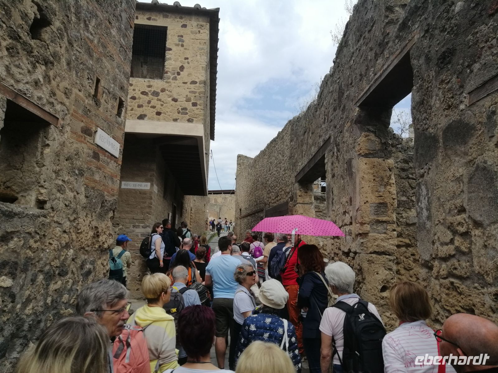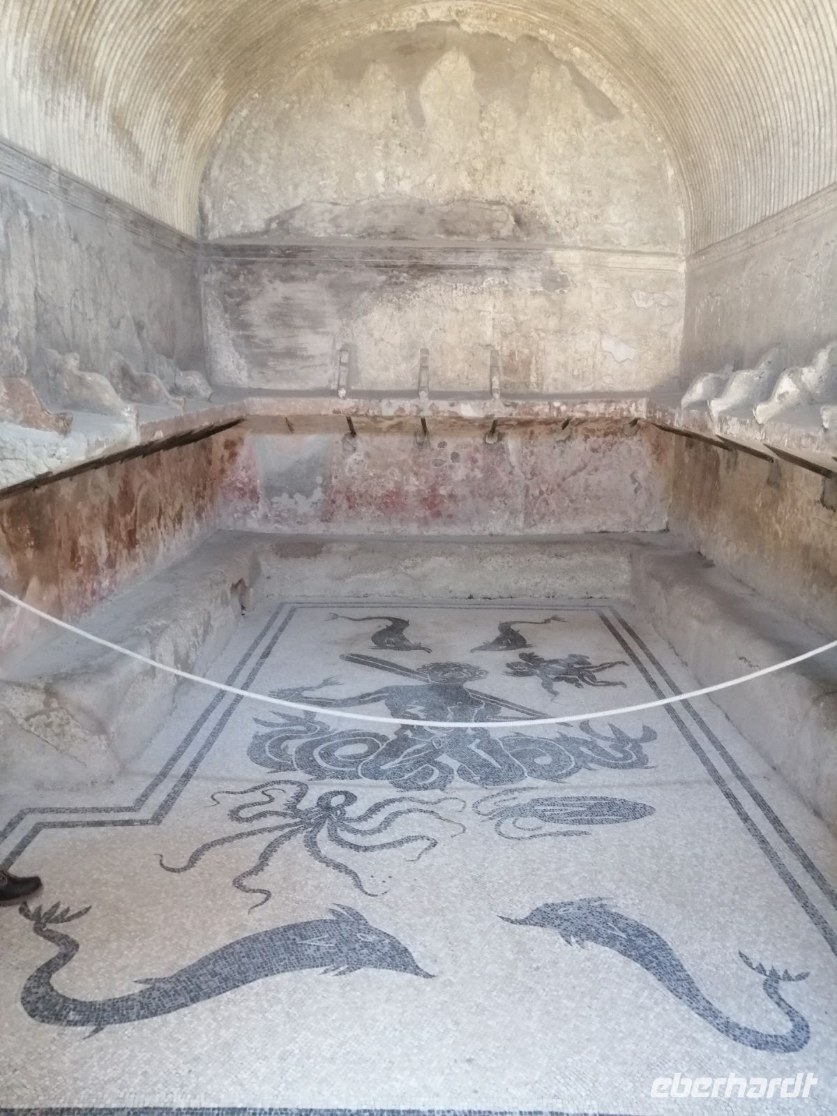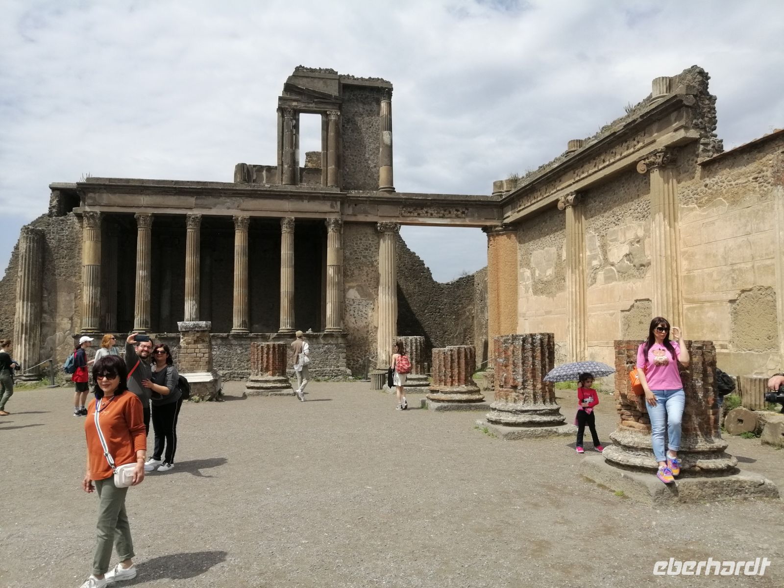 Nach dem Frühstück wurden wir von unserem Busfahrer Ciro abgeholt und fuhren nach Pompej, wo wir dann die Laura antrafen. Gleich am Anfang der Besichtigung der alten römischen Stadt, informierte uns Laura über ihre Vorgeschichte und den schrecklichen Vulkanausbruch im August des Jahres 79. Anschließend besichtigten wir das kleine Amphitheater und einige Wohnhäuser von Pompej, wie zum Beispiel das Casa die Menandro und erfuhren von der Laura über die Lebensart und Gepflogenheiten der Menschen aus der damaligen Zeit. Besonders fasziniert waren wir von den Wandfresken der Wohnhäuser, viele davon sind im archäologischen Museum in Neapel ausgestellt, das ebenfalls auf unserem Reiseprogramm steht und darauf freuten wir uns schon! Die Laura erklärte uns die Bedeutung des Wortes fresco: es leitet sich vom italienischen ab und steht für frisch oder feucht. Auch das Wort Lararium ist für uns kein Geheimnis mehr: Gott Lara – Schutzgott des Hauses! Nun schauten wir uns eine alte Karre mit großen Rädern und die Amphoren für Wein und Öl an, die die Menschen in Pompej benutzt haben. Spannend war auch das Regenwassersammelsystem, das die Pompenjianer damals verwendet haben. Anschließend ging es zu den öffentlichen Thermen aber vorher zeigte uns Laura noch eine Vitrine mit einer Leiche. Nach der Besichtigung der klassisch-römischen Thermen mit Umkleideraum, Frigidarium (Abkühlraum) und Erläuterungen zur Fußbodenheizung und der Badekultur in Pompej, besuchten wir das Lupanare – ein Bordell. Auch hier erklärte uns Laura die Bedeutung des Wortes Lupa: was Wölfin bedeutet. Mit Wolfsgeheul lockten die Prostituierten damals ihre Kunden an. Die Wände im Lupanare wurden mit erotischen Fresken geschmückt. Den Rundgang durch Pompej endeten wir mit der Besichtigung von Forum – des administrativen und sozialen Zentrums von Pompej mit kommunalen Gebäuden, Tempeln und Basilika.