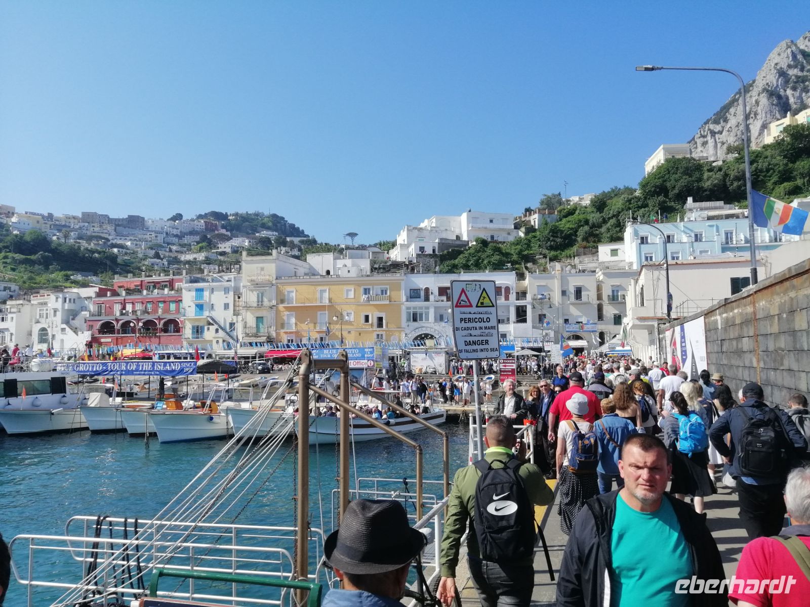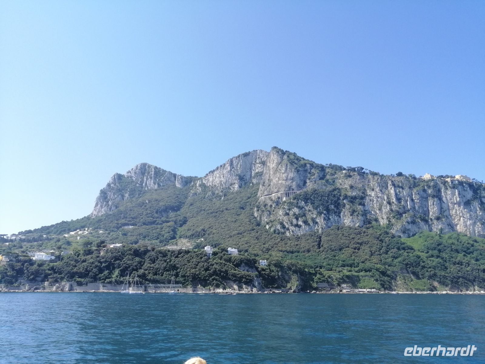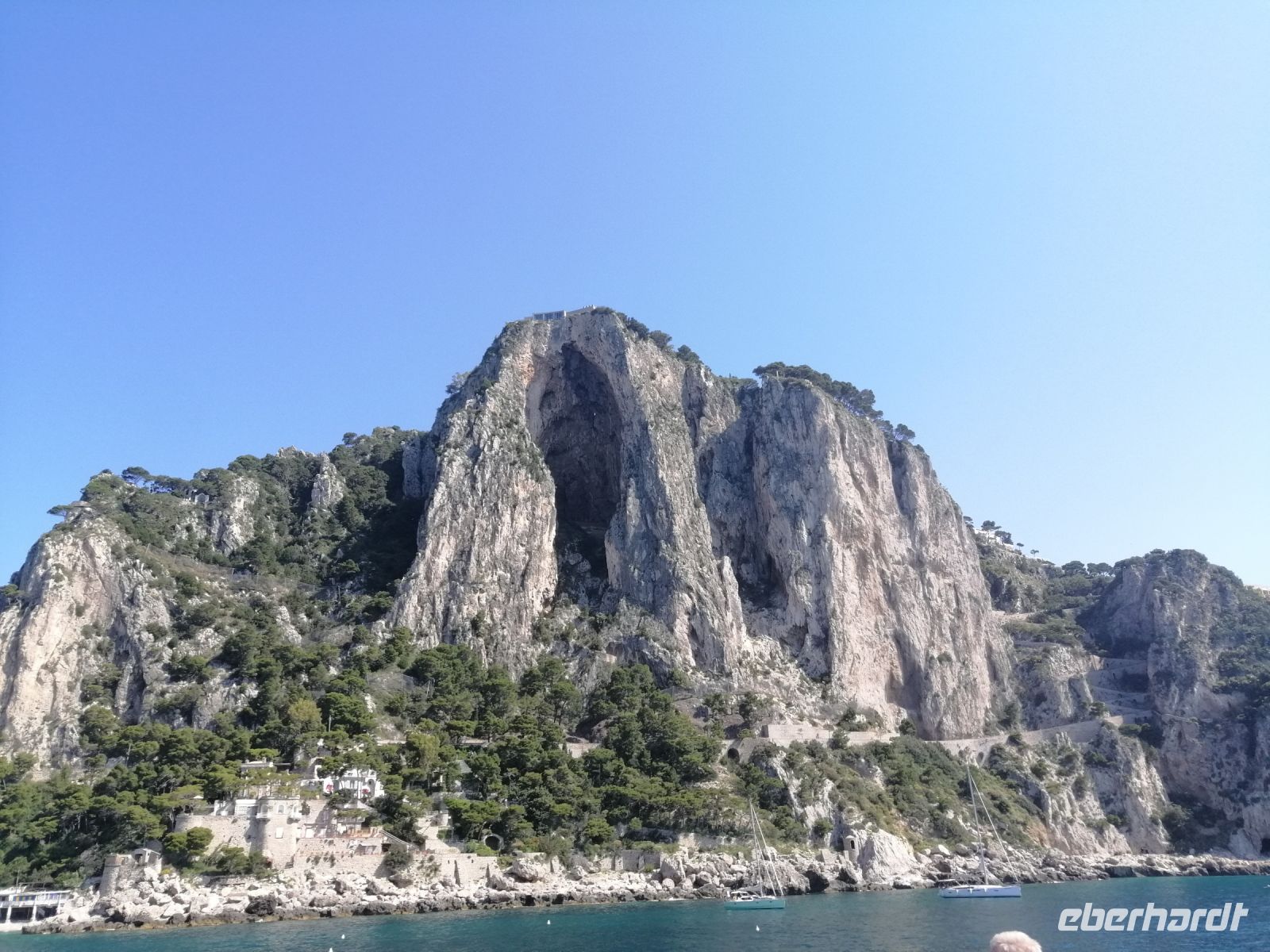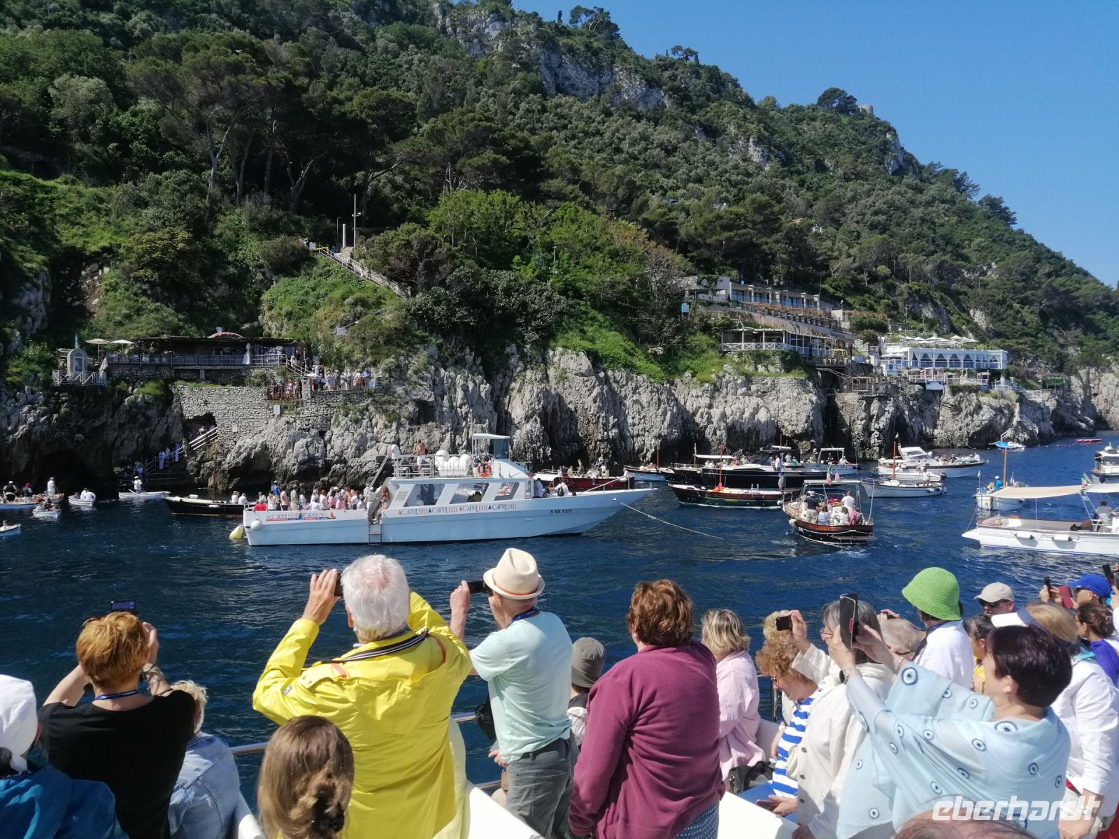 Nach dem Frühstück holte uns unser Busfahrer Ciro in Nocera Superiore ab und brachte zum Hafen von Castellammare di Stabia. Von dort starteten wir unseren heutigen Schiffsausflug zur Insel Capri. Das Wetter heute spielt mit und wir sind alle sehr gespannt auf diese wundervolle Insel! Nach Ankunft in Marina Grande von Capri, stiegen wir gleich auf ein kleineres Boot um und starteten eine Inselrundfahrt: eine ausgezeichnete Möglichkeit die Insel Capri beim besten Wetter von außen kennenzulernen. Der traditionelle Gruß - Ciao Gennarino (!) – an einen jungen Knaben (Gennarino Scugnizzo), der an einem Felsen in Form einer Statue saß, verstärkte nun unsere Erfolgsaussichten auf der Insel zusätzlich! Nach der grandiosen Schiffsrundfahrt mit vielen Grotten, Felsen, fantastischen Aussichten und spannenden Erzählungen von der Laura, kehrten wir zum Hafen von Capri zurück und setzten unsere Inselerkundung mit Anacapri fort.