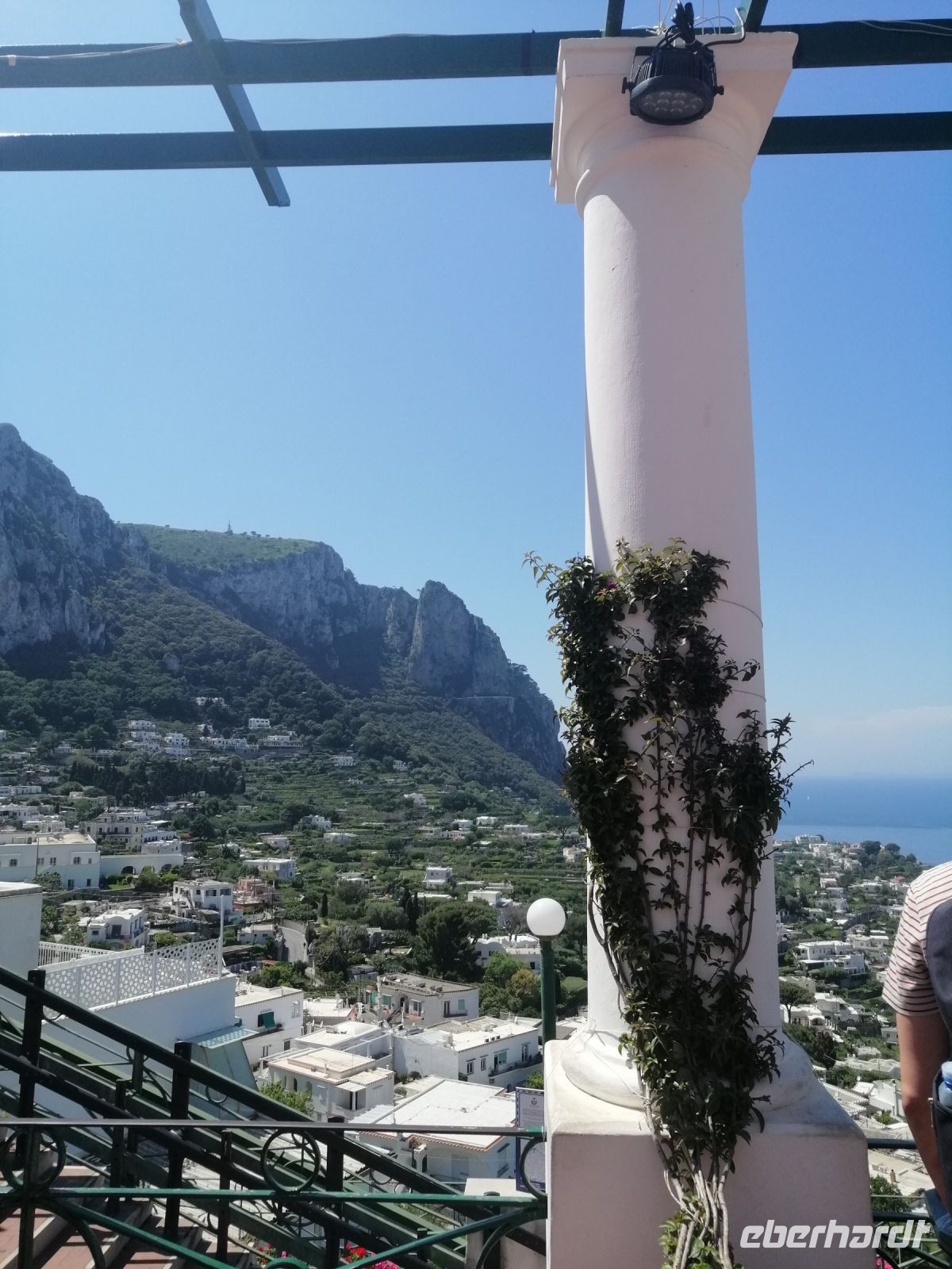Nach Anacapri kamen wir mit einem örtlichen blauen Bus über die sogenannte Mamma-Mia-Straße: eine in den Felsen geschlagene, sehr enge Serpentinenstraße. Nach einem kurzen Spaziergang vom Busbahnhof zum Zentrum von Anacapri, entschied die Mehrheit der Reisegruppe eine kurze Stärkungspause in einem gemütlichen Restaurant einzulegen. Gestärkt ging es dann ca. 1 Stunde später mit der Stadtführung weiter: Laura zeigte uns den Eingang in die weltberühmte Villa San Michele vom schwedischen Arzt und Schriftsteller Axel Munthe und erzählte über sein Lebenswerk. Anschließend gingen wir zum Panoramablick auf Capri. Dort erfuhren wir über die mögliche Herkunft des Namens der Insel Capri - Insel der Ziegen - denn Capra bedeutet aus dem Italienischen Ziege. Und es gab tatsächlich in der Vergangenheit sehr viele Ziegen auf der Insel Capri. Die freie Zeit in Anacapri nutzten einige Reisegäste für die Besichtigung der Villa San Michele oder für die Seilbahnfahrt auf den 589 Meter hohen Monte Solaro – den höchsten Berg von Capri mit einem grandiosen Panoramablick unter anderem auch auf den Faraglioni-Felsen, durch den wir erst vor wenigen Stunden durch gefahren sind!
