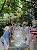 Gegen Mittag erwartete uns heute eine besondere Veranstaltung auf dem Landgut Le Colline: und zwar ein Gnocchi-Kochkurs bei dem alle mitmachen müssen! Unsere Gastgebering Rosa hatte schon alles gut vorbereitet und nach kleinen Anweisung und Umkleidung (Schürze und Handschuhe) ging es zur Sache! Es hat allen unheimlich viel Spaß gemacht: den Teig vorbereiten und kräftig traditionell von Hand kneten und anschließend in eine lange Wurst ausrollen und in kleine möglichst gleiche Teile schneiden! Nach dem Kochkurs wurden die Gnocchis zum Kochen geschickt und wir unternahmen eine Führung durch das Landgut in Begleitung der Chefin. Nachdem wir Vieles über die Familiengeschichte und über die Arbeitsweise des Landgutes erfahren haben, ging es wieder zurück. Nun erwartete uns eine Vorführung der traditionellen Käse-Herstellung - Mozzarella – den wir gleich vor Ort verkosten durften: ganz lecker! Inzwischen waren auch unsere Gnocchis fertig und wir genossen das Mittagessen mit eiheimlichem Tafelwein und guten Gesprächen sehr. Im kleinen Hofladen des Landgutes bestand die Möglichkeit das gute Olivenöl (extra vergine), verschiedenen Marmeladen (vor allem die Zitronenmarmelade) und natürlich Limoncello zu kaufen.