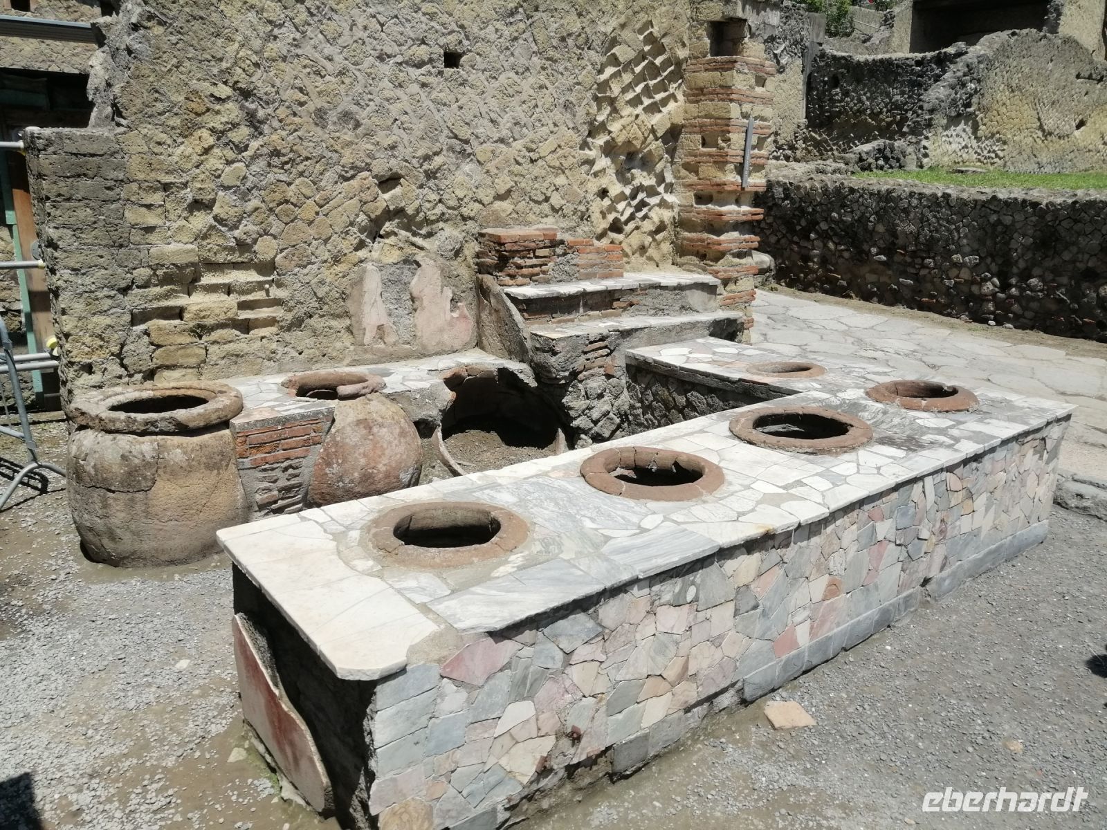 Heute ist unser letzter Tag in Italien und die ersten Reisegäste hatten schon zeitig ihre Rückflüge nach Hause und mussten schon früh zum Flughafen nach Neapel. Da die Mehrheit der Gruppe allerdings den Rückflug erst abends hatte, erwartete sie heute eine kleine Überraschung, die durch die tolle Zuarbeit der lokalen Partneragentur ermöglicht wurde. Heute ging es nach Herculaneum! Nach dem Frühstück packten wir unsere Koffer und Ciro holte uns direkt im Hotel ab. In Herculaneum trafen wir die Laura und starteten die Führung durch diese geheimnisvolle Ausgrabungsstätte, die eher als Pompej durch einen Zufall entdeckt wurde. Der fast intime Charakter des Ausgrabungsgeländes, der im Vergleich zu Pompej deutlich geringere Besucheransturm, vor allem aber der in vielen Details sehr viel bessere Erhaltungszustand und die behutsamere, subtilere Restaurierung der Ruinen fielen uns sofort ins Auge. Gleich zu Beginn der Besichtigung informierte uns Laura über die wesentlichen Unterschiede zu Pompej, die fast auf allen Ebenen bestanden. Herculaneum war Hafenstadt und bedeutend kleiner als Pompej (3.000 Menschen), die Bewohner lebten überwiegend vom Fischfang und kaum von einträglicherem Handel und Gewerbe. Dies erklärte auch den insgesamt geringeren Wohlstand des Ortes. Wir besuchten das kleine Museum mit einigen Exponaten und Informationstafeln, machten eine kurze Harmoniepause mit einem Espresso und stiegen dann zum antiken Strand von Herculaneum durch einen Tunnel ab. Herculaneum ist beim Vesuvausbruch im Jahr 79 urplötzlich unter einem Schlammstrom begraben und aus dem Leben gerissen worden – erzählte uns Laura. Danach spazierten wir gemeinsam durch die Gassen der nur zu ¼ ausgegrabenen Stadt. Nach der Führung hieß es Abschied von der Laura nehmen. Wir bedankten uns bei ihr für ihre tolle Betreuung und wünschten Laura alles Gute!