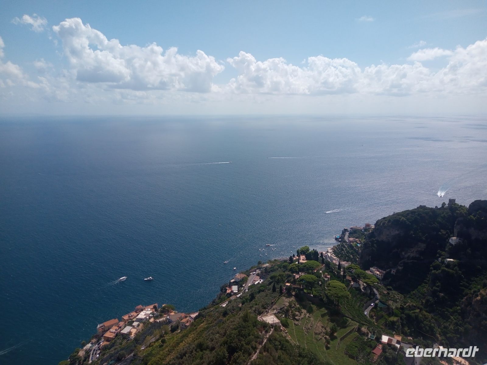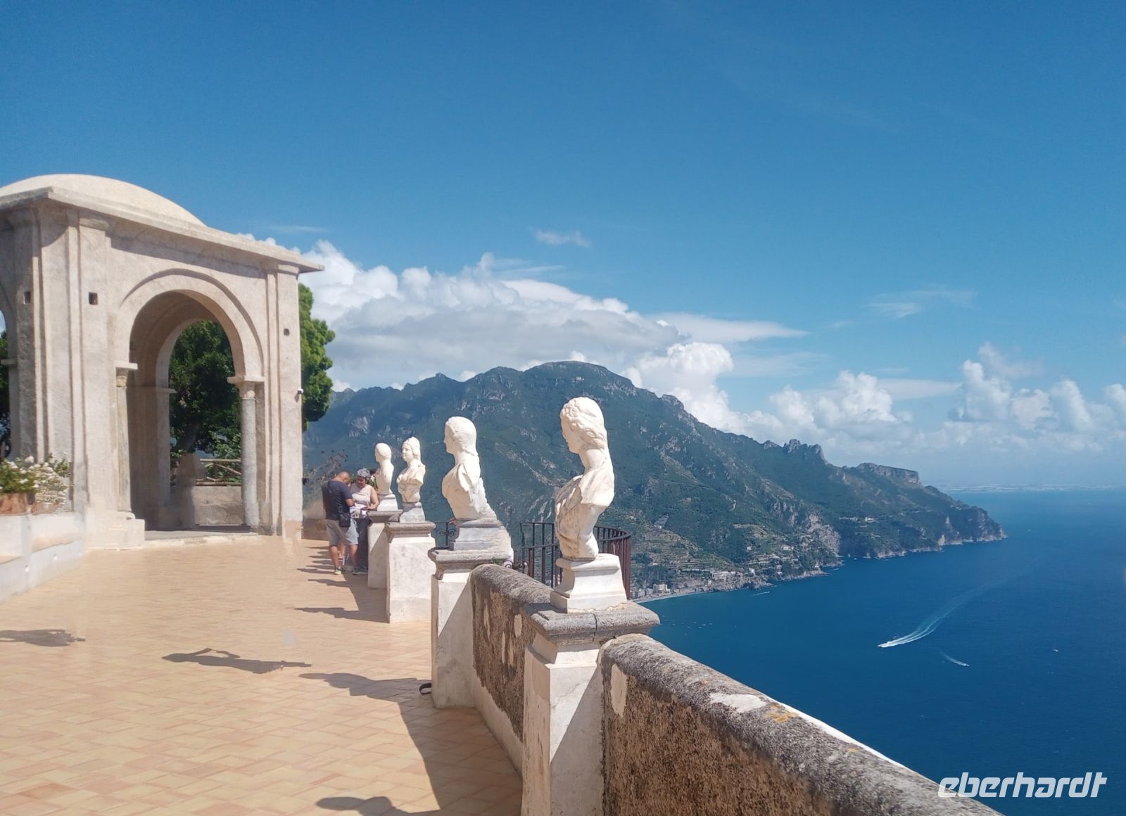 auf unserer fast vierstündigen Fahrt bestaunten, informierte uns Sabine umfassend über die Gegend und über unser heutiges Ziel: der malerische Ort Ravello. Franco meisterte geschickt jede enge Verkehrssituation. Unterwegs legten wir einen kurzen Stopp in einer Keramikmanufaktur ein, wo wir bei einer Kaffeepause den unvergleichlichen Blick auf das Meer bis hin zu den Faraglioni von Capri genossen.