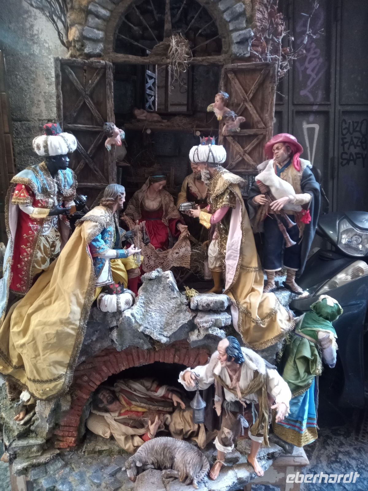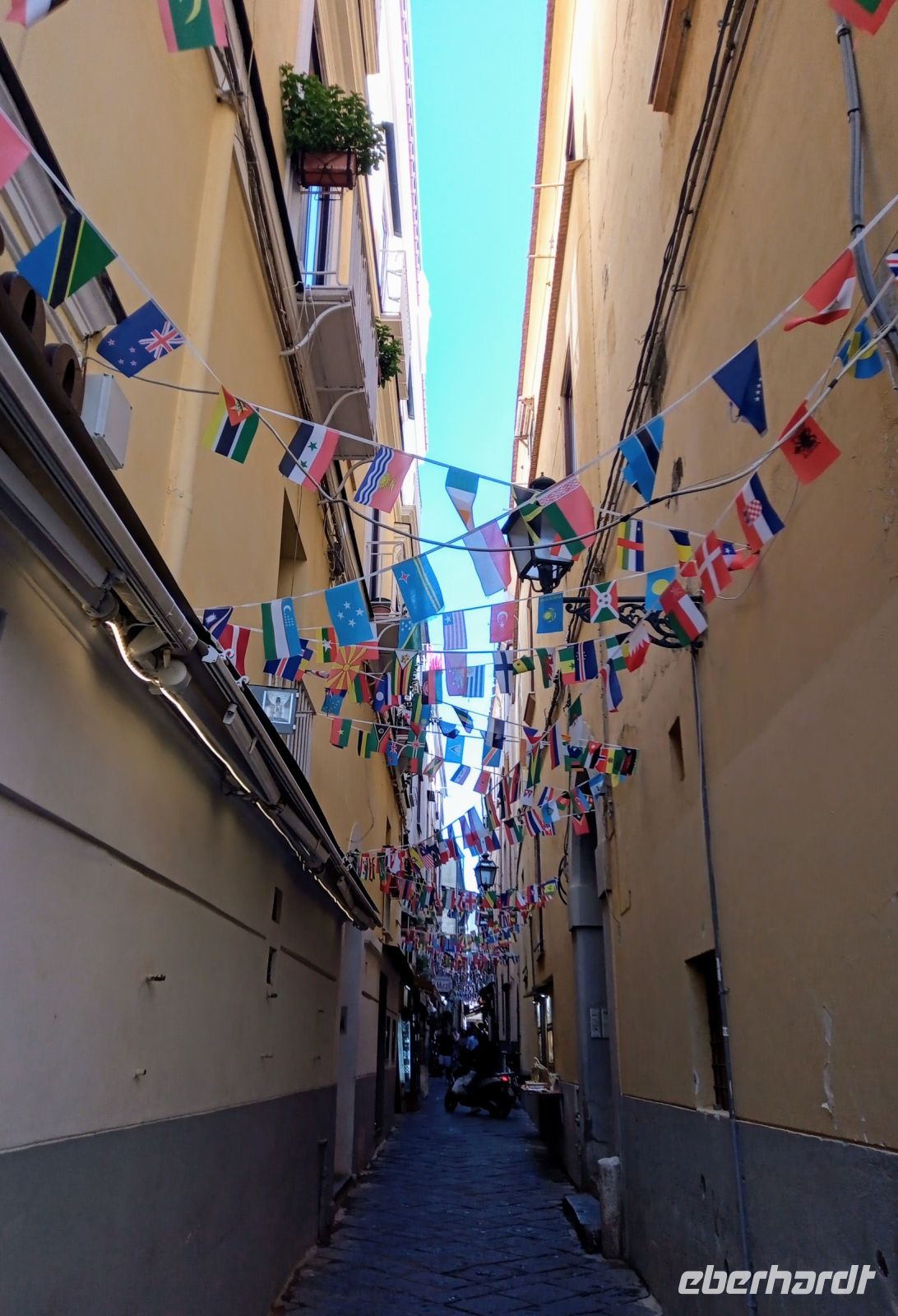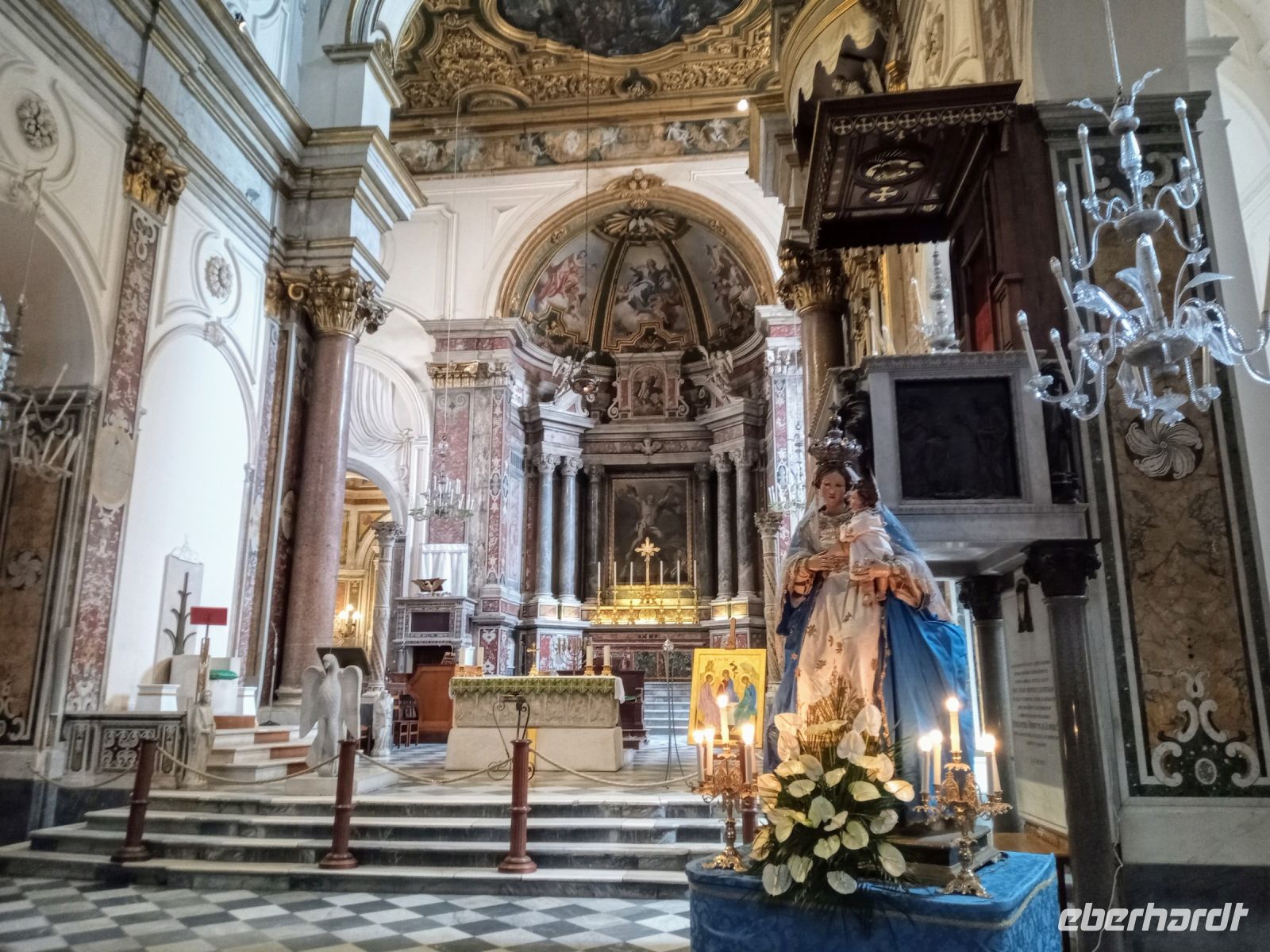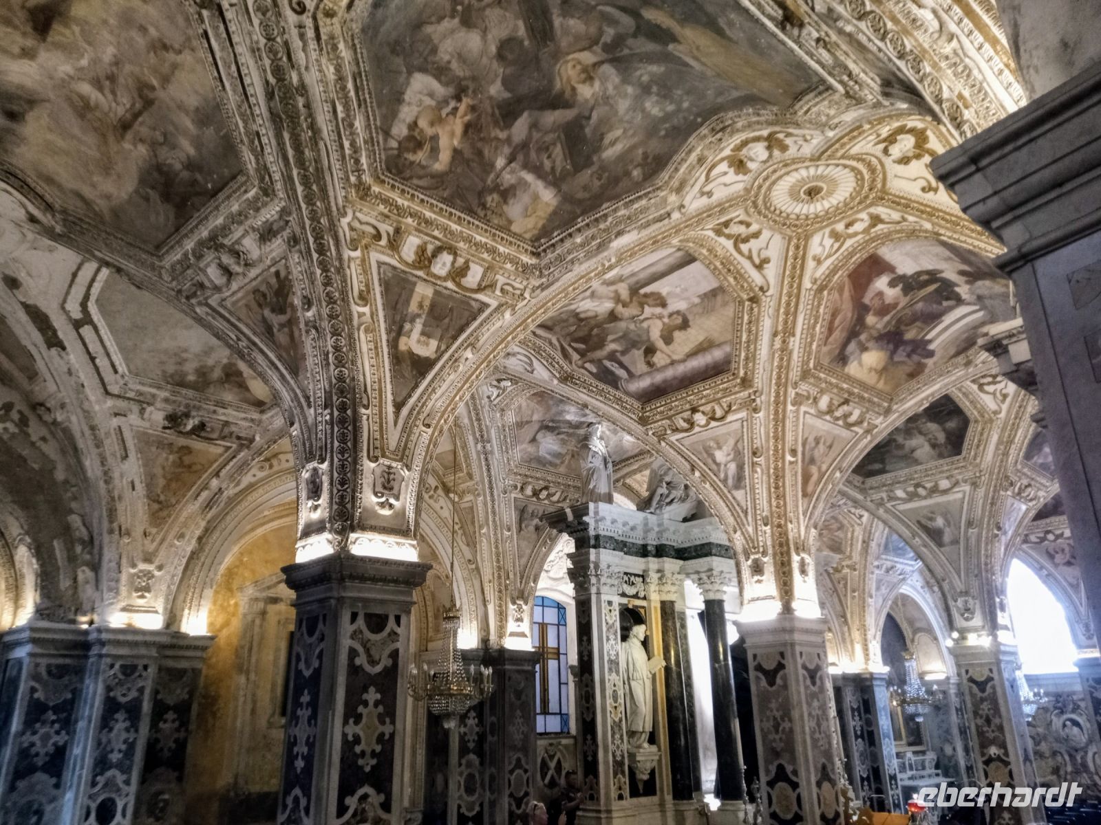 Nach dem Museumsbesuch begann unsere Erkundung der Altstadt Neapels zu Fuß. Wir spazierten bis zum imposanten Dom, den wir von innen besichtigen. Interessant und für uns etwas befremdlich war der Mythos um den heiligen Gennaro. Das eingetrocknete Blut des früheren Bischofs wird im Dom in zwei Ampullen in einer silberner Monstranz aufbewahrt. An den Gedenktagen werden diese in die Reliquienkapelle gebracht, geschüttelt, und meist verflüssigt sich dann der Inhalt vorübergehend.