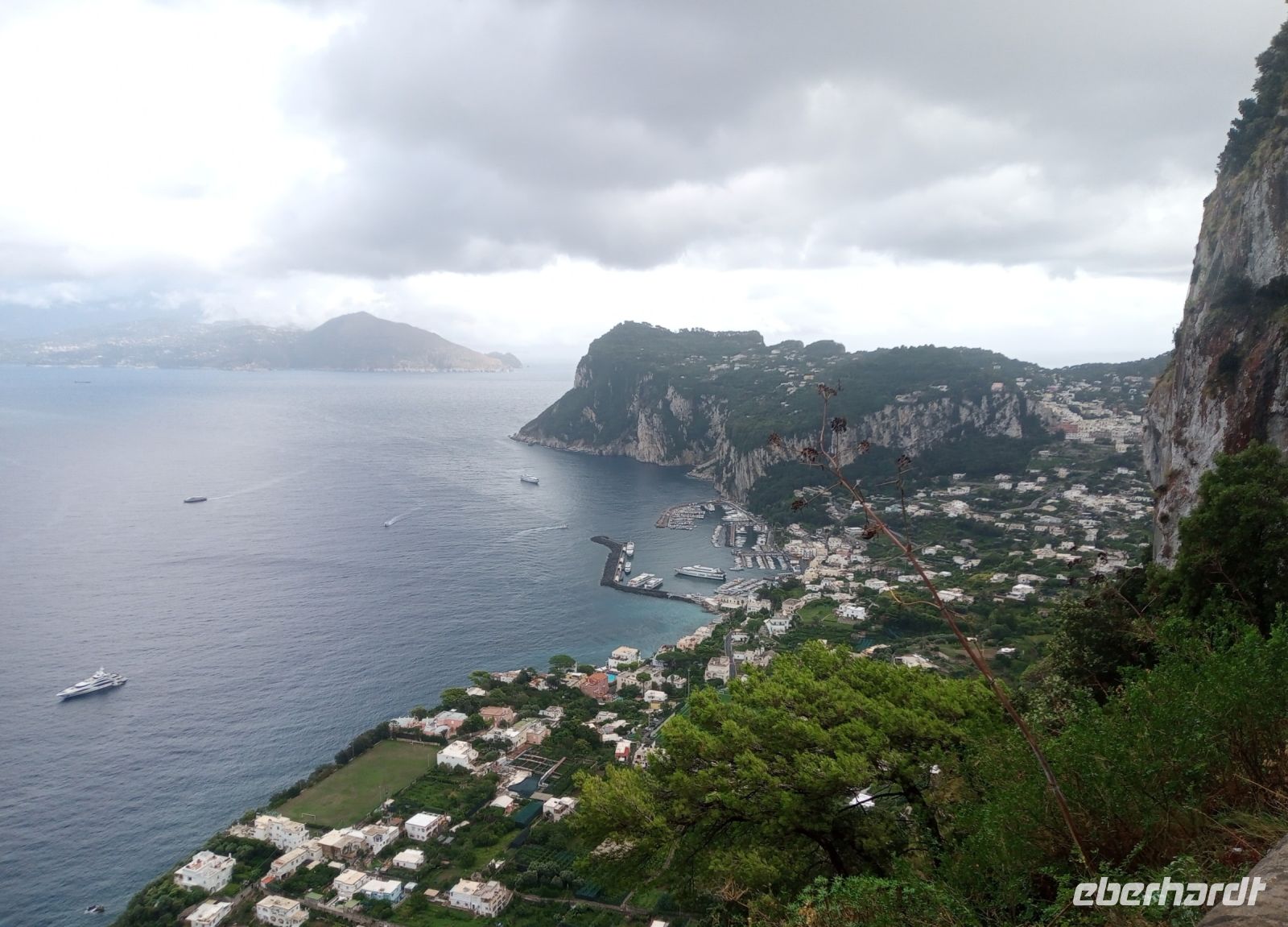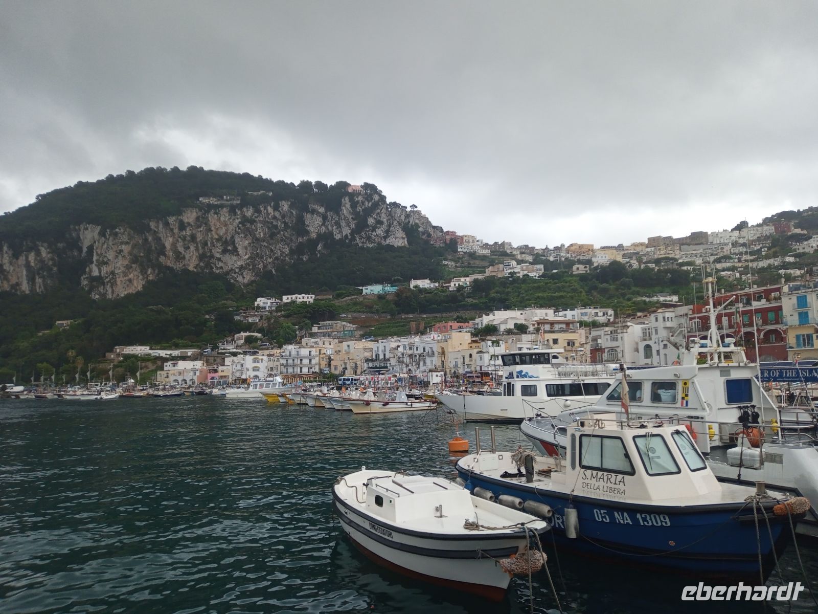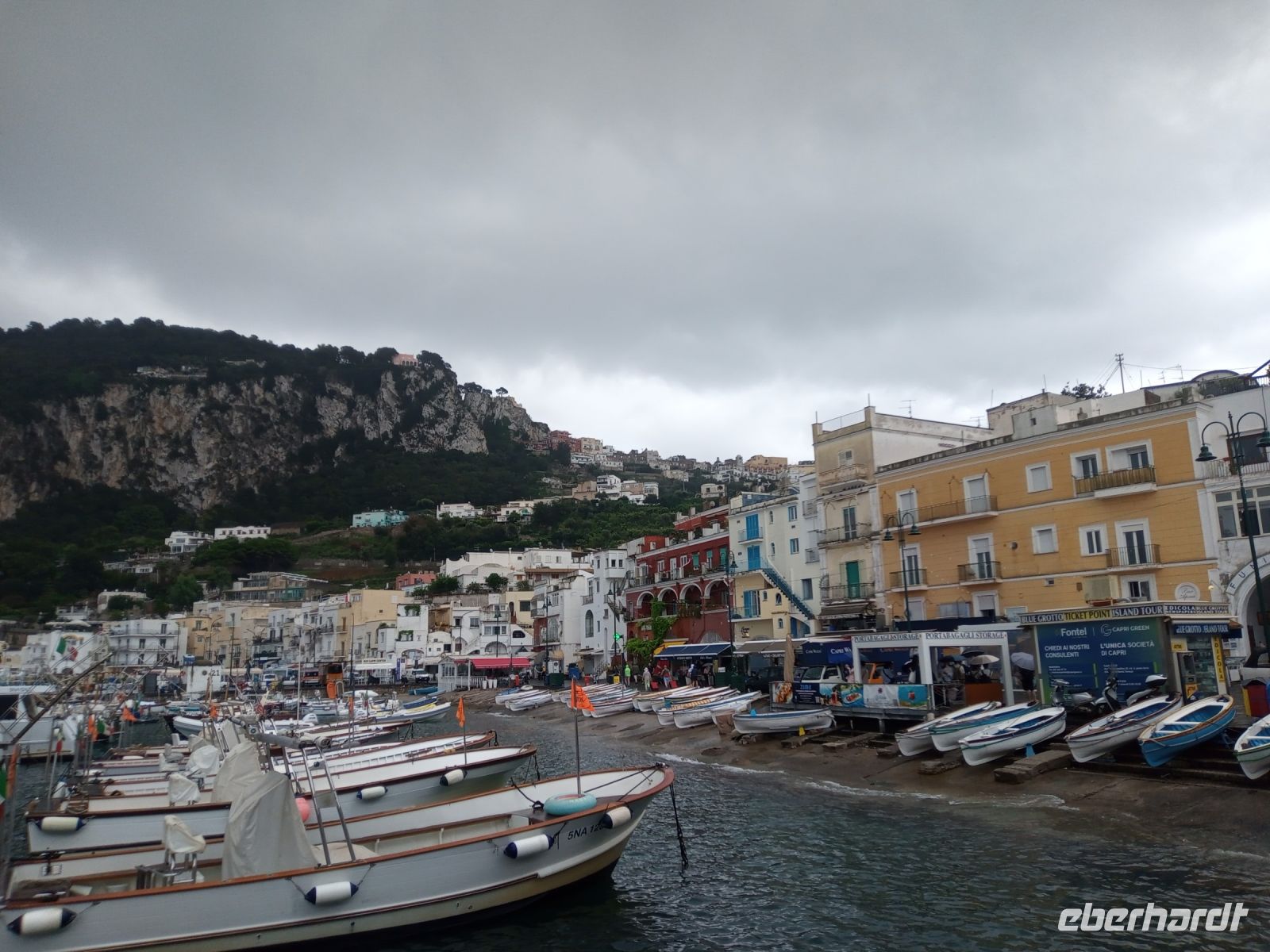 Nach der schwülen Hitze der letzten Tage, hatte sich stürmisches Wetter mit Regenfällen angekündigt. Gegen 8 Uhr war unsere örtliche Reiseleitung sowie unser Reisebus pünktlich am Hotel, um uns zum Hafen von Sorrent zu bringen. Trotz des starken Regens und der windigen Bedingungen ließen wir uns die Vorfreude auf unseren Tagesausflug nach Capri nicht nehmen. Auf Grund der Wetterverhältnisse entschieden wir uns, das spätere Schiff um 9:40 Uhr zu nehmen, wie sich herausstellte, war dies eine kluge Entscheidung, denn bei unserer Ankunft in Capri hatte der Regen nachgelassen und wir konnten unser Abenteuer im Trockenen beginnen.