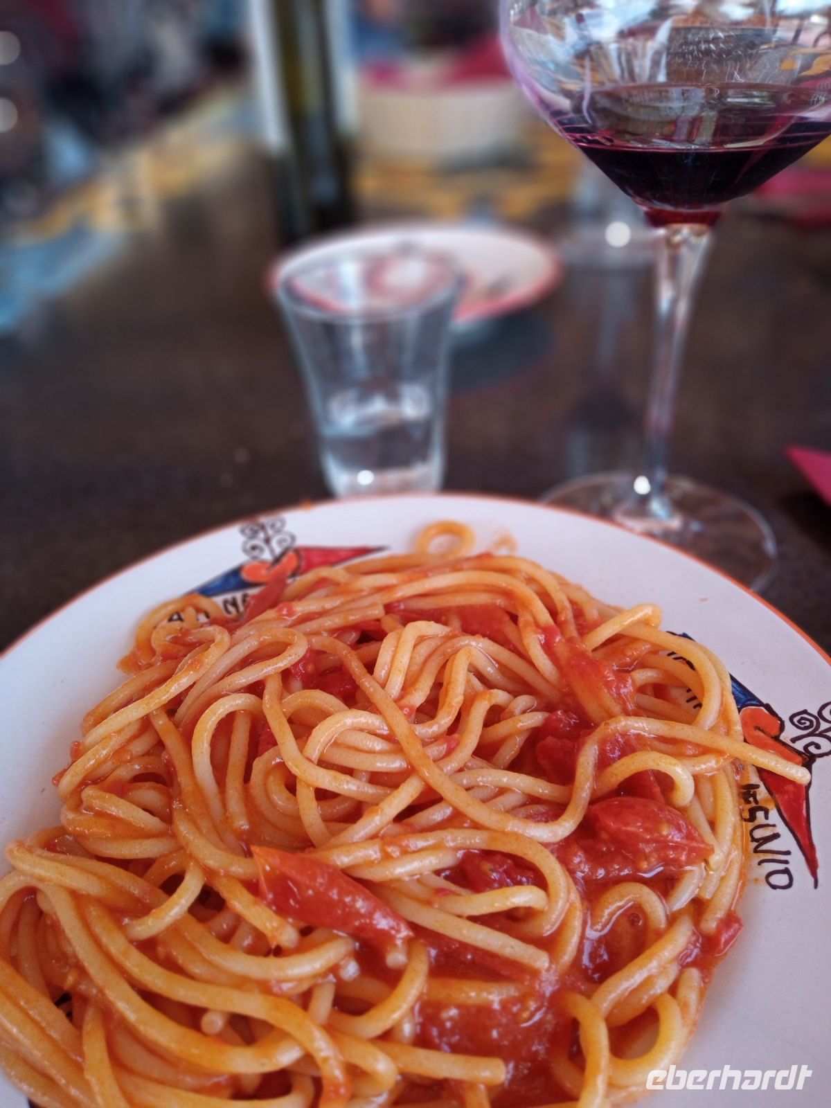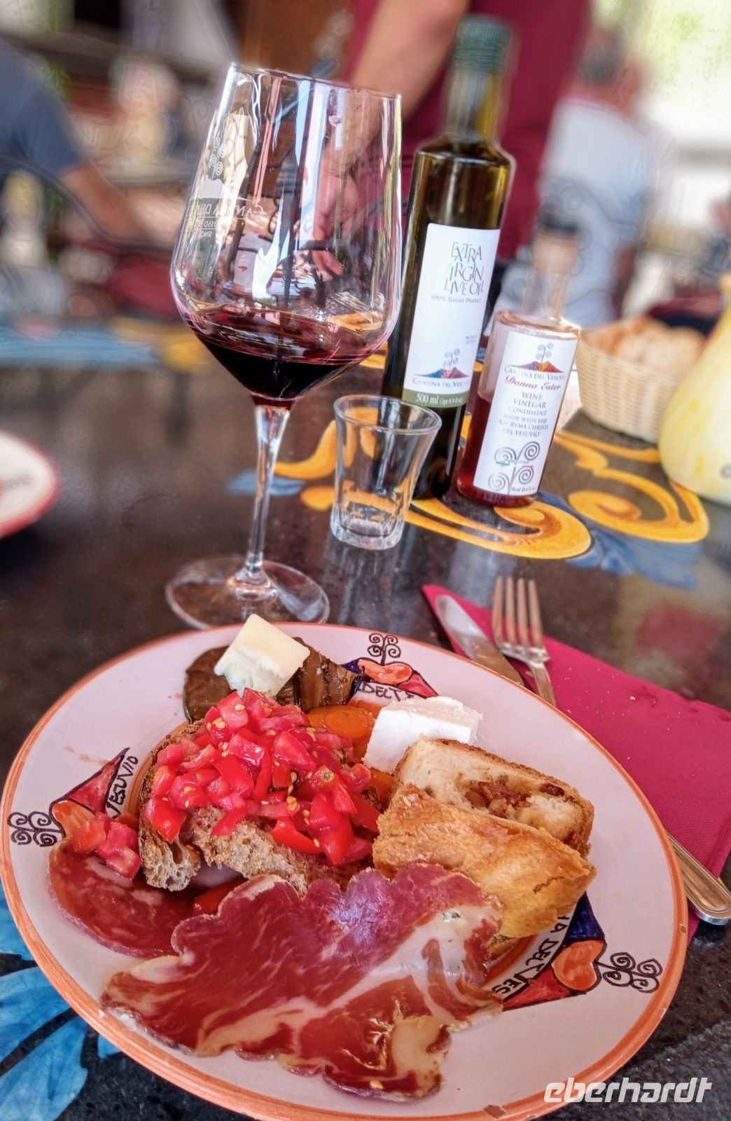 Nach dieser spannenden Zeitreise fuhren wir weiter zum Hang des Vesuvs, wo uns in der malerischen Cantina del Vesuvio ein köstliches Mittagessen erwartete. Hier, inmitten der Weinberge, die auf der fruchtbaren Vulkanerde gedeihen, konnten wir lokale Spezialitäten genießen und bei einer Weinprobe die Aromen der Region kennenlernen. Der vulkanische Boden verleiht den Weinen der Cantina (Lacrime Christi, auf deutsch: Christustränen) einen unverwechselbaren Geschmack, was dieses Erlebnis besonders machte.