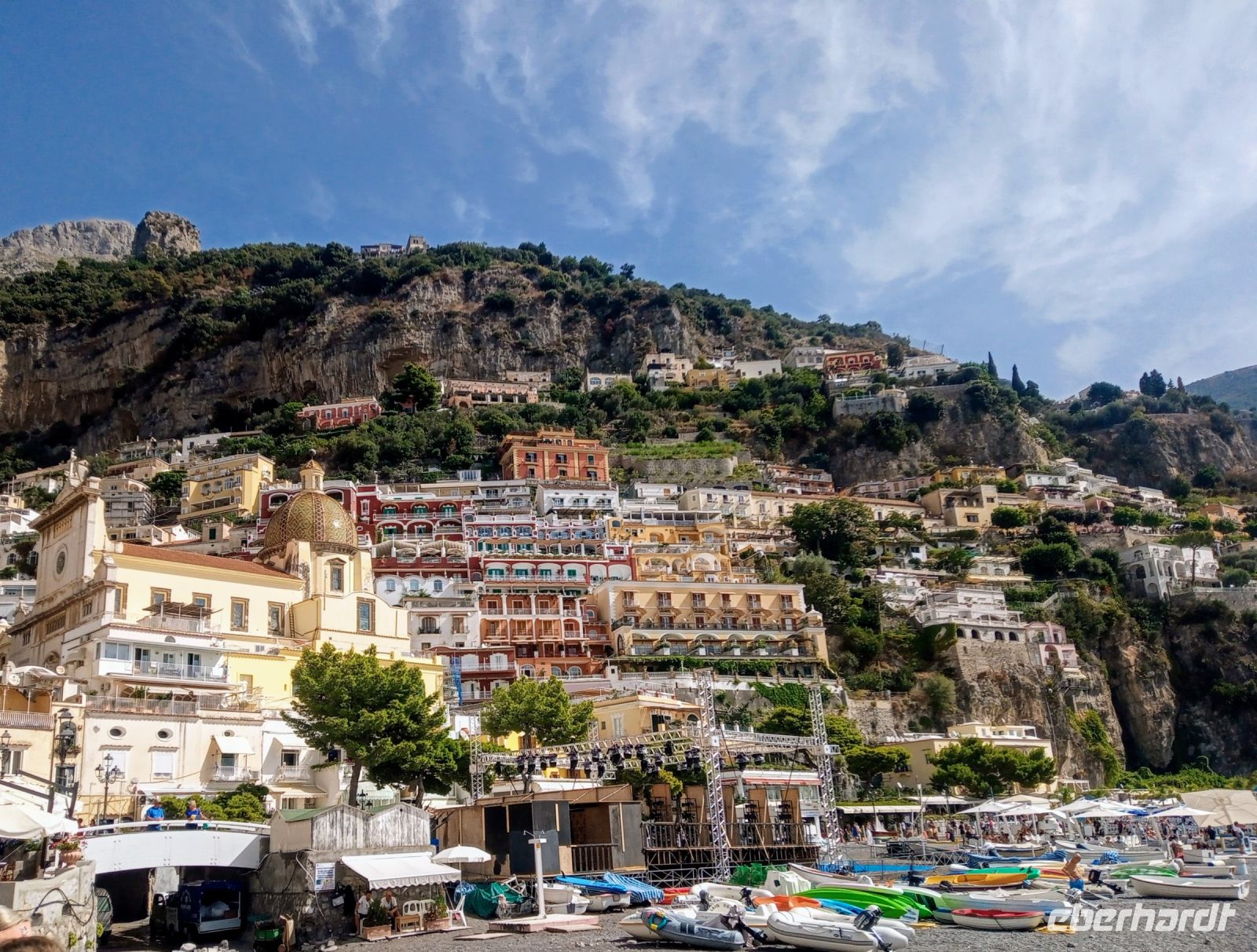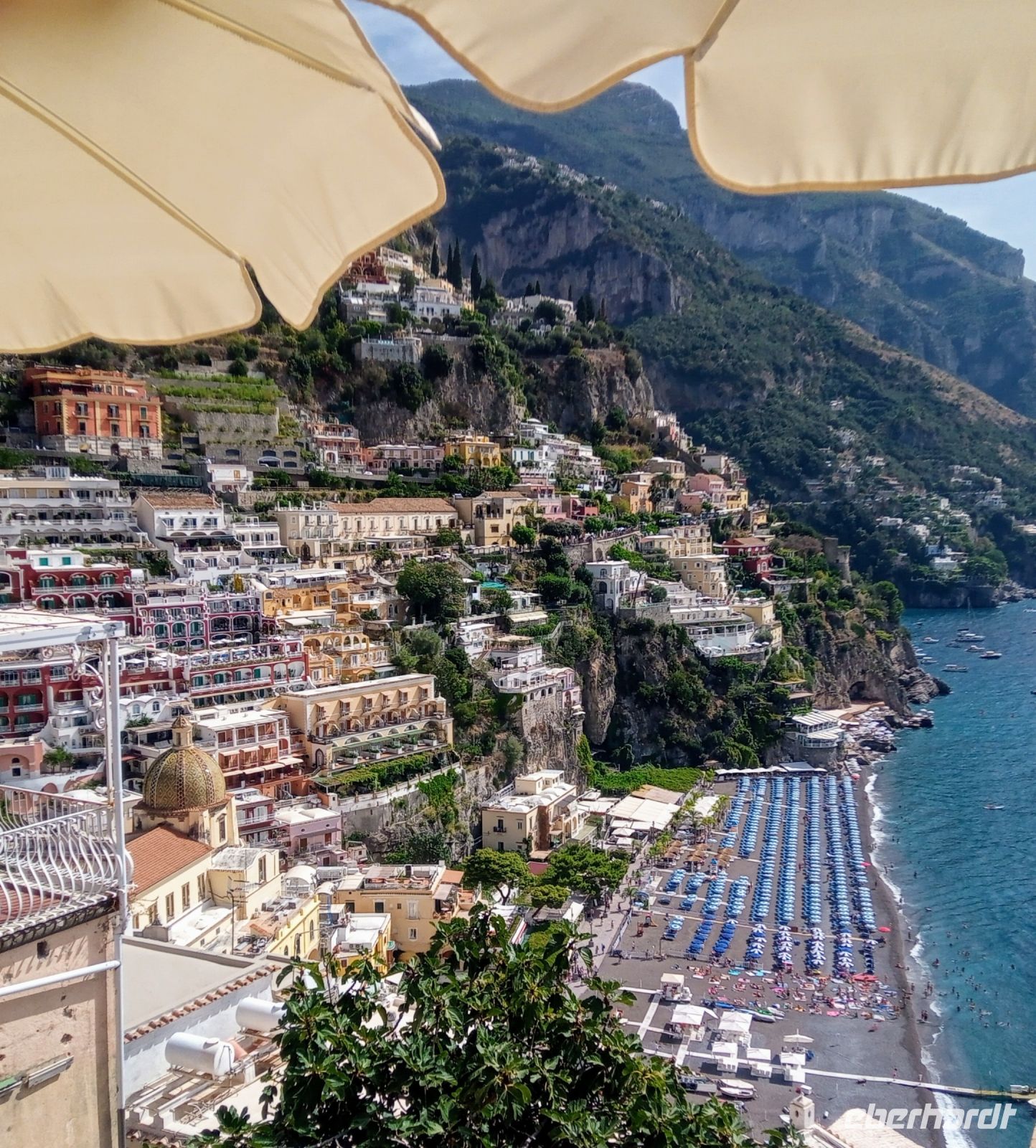 Gemeinsam bestiegen wir ein Schiff, das uns zunächst an Amalfi vorbei nach Positano brachte. Während die Silhouette von Amalfi in der Ferne langsam kleiner wurde, wuchs die Vorfreude auf Positano – den ersten Stopp unserer heutigen Tour. Die malerische Stadt, eingebettet in steile Hänge, präsentierte sich uns in all ihrer Farbenpracht. Doch mit über 33 Grad war es ein äußerst heißer Tag, und wir waren bei weitem nicht die einzigen, die diesen bezaubernden Ort erkunden wollten. Nach etwas Freizeit, in der wir durch die engen Gassen schlenderten und die Aussicht auf das türkisfarbene Meer genossen, ging es weiter nach Amalfi.