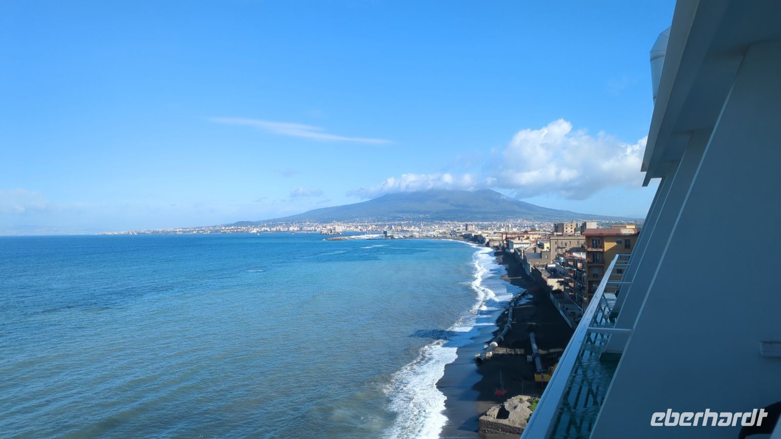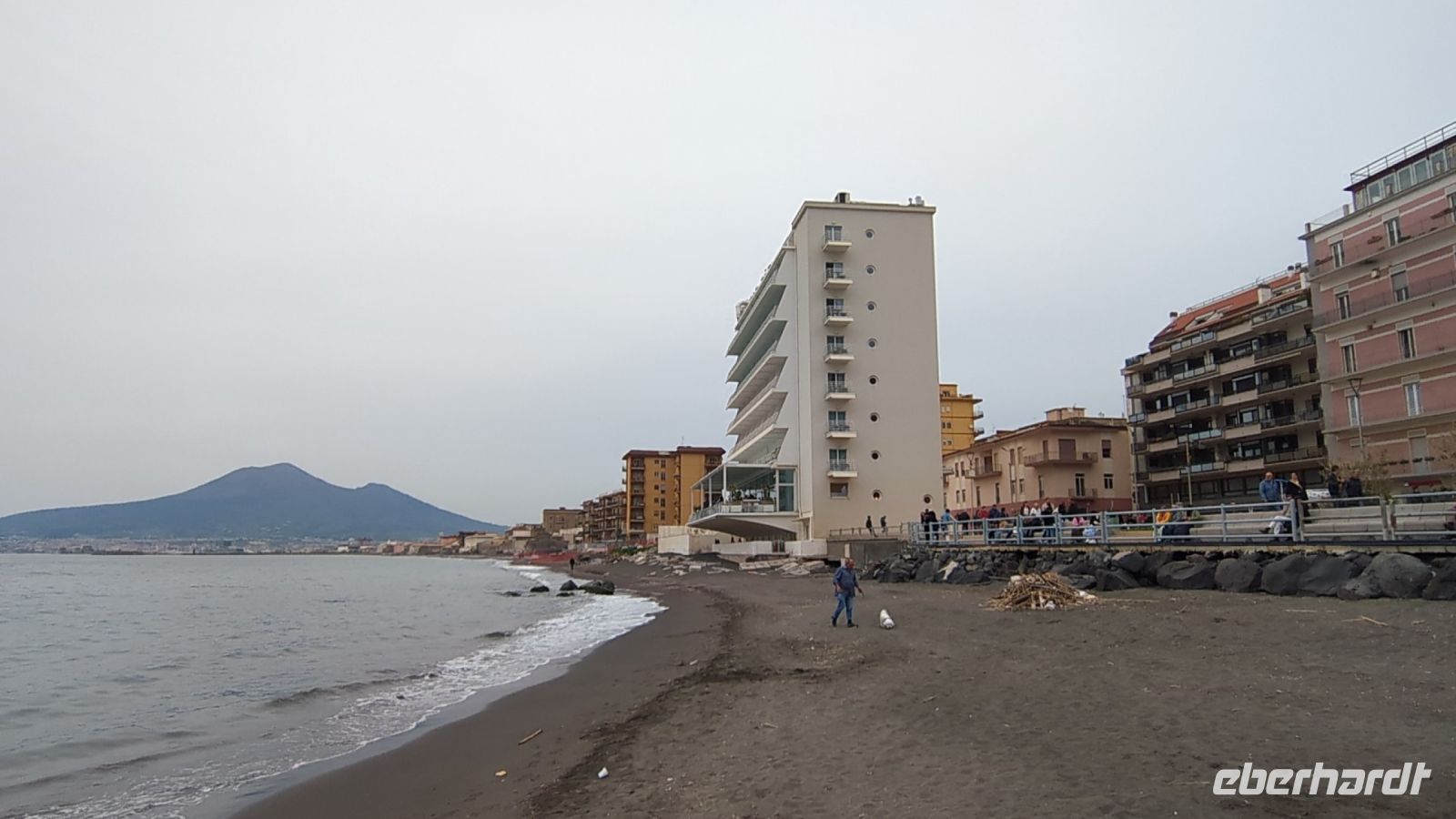 Unser Hotel Mirare di Stabia lag direkt am Meer. Nicht mal eine Uferstraße oder Uferpromenade trennte unser Hotel vom Golf von Neapel. Jedes unserer geräumigen Zimmer hatte einen Balkon und Meerblick. Im Norden erblickten wir den majestätischen Vesuv und am Horizont Neapel. Nach Süden sahen wir den Hafen von Castellammare und mit etwas Glück die Insel Capri im Osten.