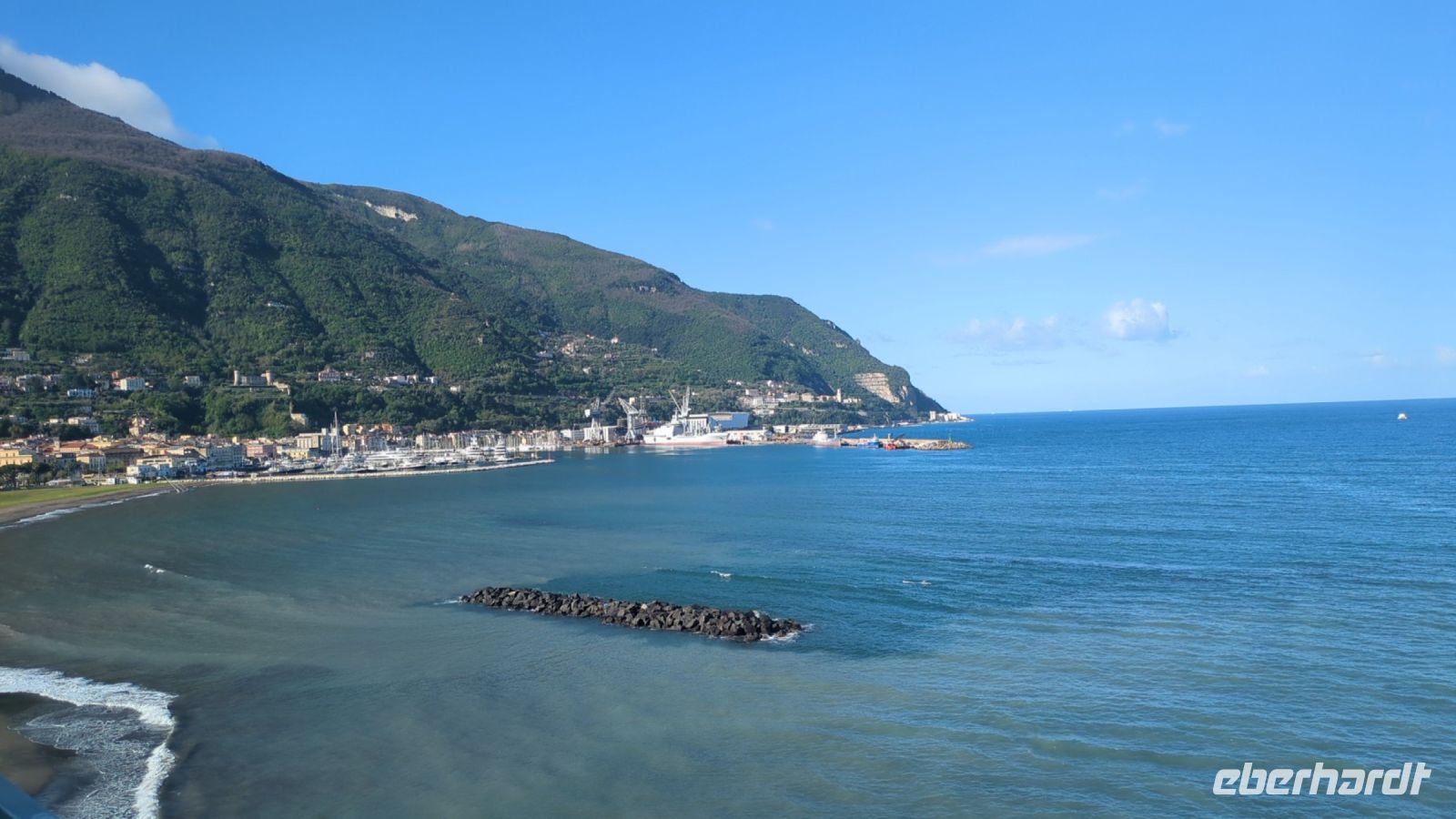 Zunächst fuhren wir nach Positano. Dazu umrundete unser Schiff die Spitze der Halbinsel von Sorrent. Auf der rechten Seite grüßte die Insel Capri, die wir wenige Tage später besuchten.
