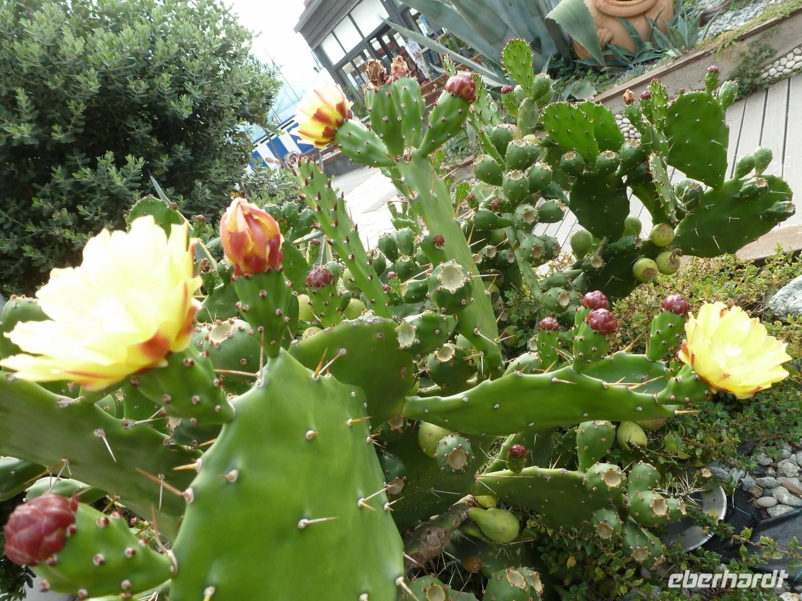 Durch starken Regen konnten wir die geplante Tour von Vernazza nach Corniglia nicht gehen. Deshalb entschieden wir uns direkt mit dem Zug nach Corniglia zu fahren. Der gut ausgebaute Weg vom Bahnhof bis in das Dörfchen ist gesäumt von meterhohen Opuntien, Agaven und alten Olivenbäumen. Das schwarz-graue Schiefergestein gibt einen schönen Kontrast zu dem farbenfrohen und satten Grün der Pflanzen. Wir passieren die typischen Trockenmauern - insgesamt sollen sie etwa 8.000 km Länge haben! Die farbwechselnden Rebstöcke auf den mühevoll angelegten Terrassen sind unsere ständigen Begleiter. Viele Zitronenbäume warten noch auf die Ernte.