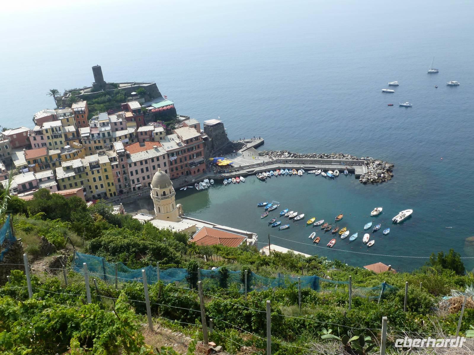Endlich Vernazza, ganz malerisch liegen die farbenfrohen Häuser in der Bucht und am Hang, die Fischerboote liegen auf der Piazza im Trockenen. Das Castello thront über dem Städtchen - ein Anblick wie aus einem Bilderbuch entsprungen. Die Turmbesteigung bildet den Höhepunkt des heutigen Tages, da der Ausblick gigantisch ist.